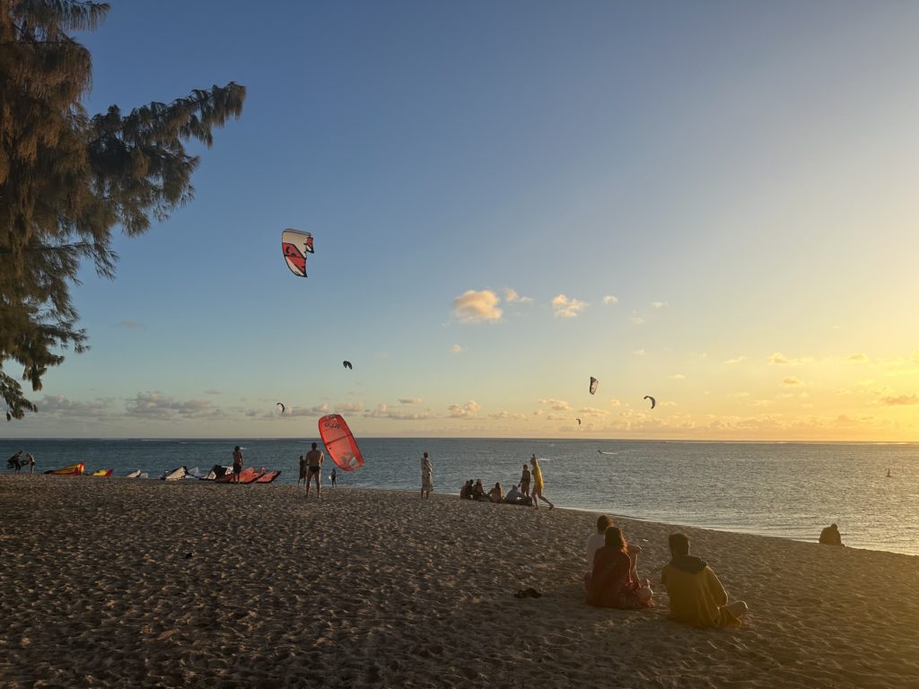 Trotz kurzem Neoprenanzug fing ich aber an abzufrieren im Wasser. Ich gehe zurück zum Auto, wärme mich auf und esse noch eine Kleinigkeit. Auf einmal überrascht mich Eva, in dem sie plötzlich neben mir steht. Sie hat ihre Session frühzeitig beendet, da ihr der Wind zu ruppig war und zu viele Leute waren. Ich lasse mir das aber nicht entgehen, schnappe mir den 12er und hau mich raus auf‘s Wasser. Doch mit vollem Magen hab ich nach dem ersten Sturz und anschließendem Bodydrag zu tun, dass ich mein Essen im Magen behalte und so stoppe ich auch schon eher bald wieder und kuriere mein Sodbrennen aus. Eva setzt ihre Session wieder fort und fährt bis kurz vor Sonnenuntergang. Sie ist eine der letzten, die vom Wasser gehen. So fühlt sich der Tag gut genutzt an: Die Ersten die kommen, die Letzten, die gehen. Rasch packen wir zusammen und fahren noch vor zum Le Point. Dort bewundern wir wieder den einheimischen Kite-Profi im Sonnenuntergang. Dieses Niveau werden wir wohl nie erreichen. Trotzdem genießen wir den Sonnenuntergang, zu dem wir es gerade noch geschafft hatten, ehe wir ins Quartier zurückkehren.
