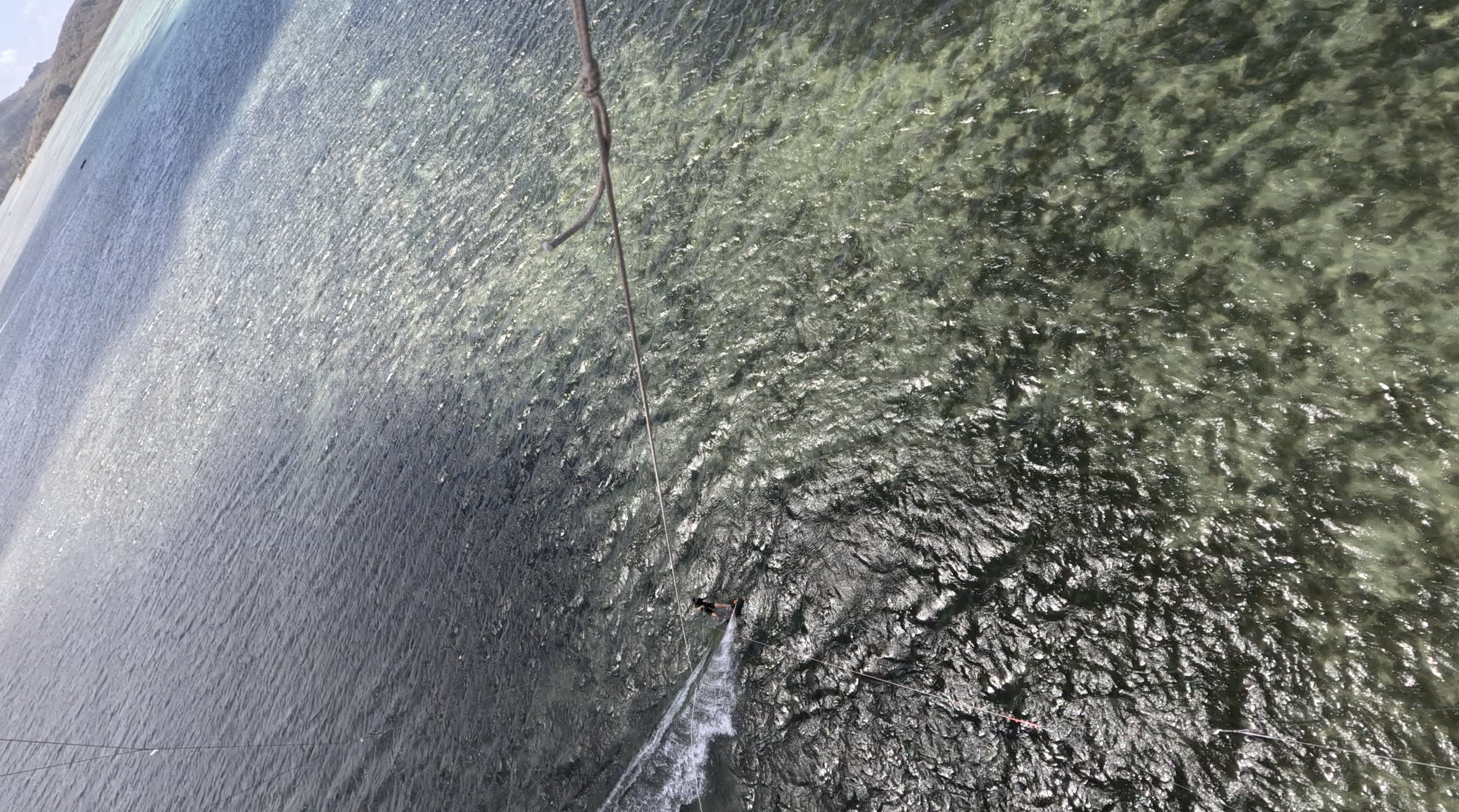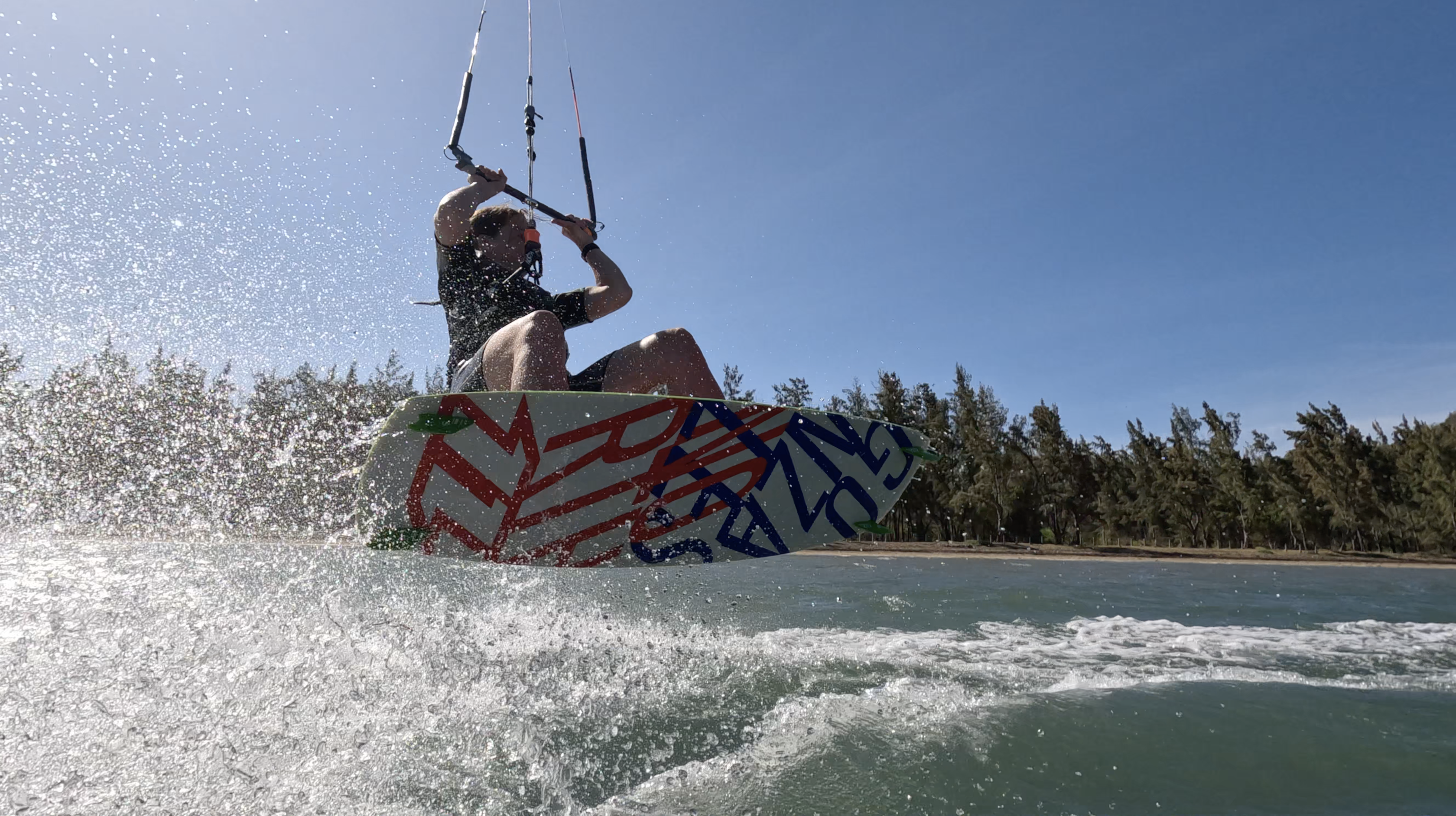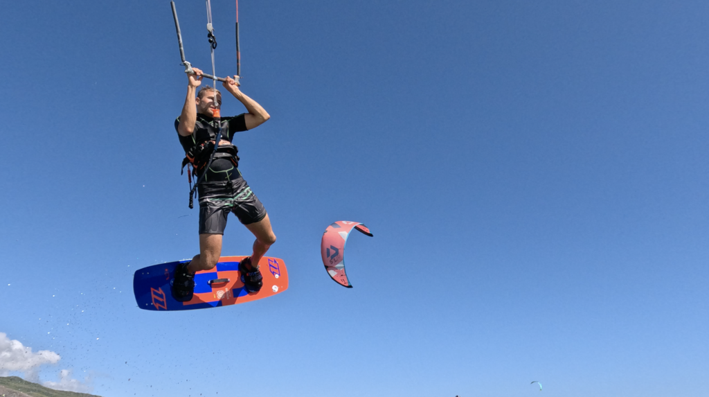 Nur langsam füllt es sich. Die Bedingungen sind genial, der Wind perfekt konstant und es macht richtig Spaß. Auch hilft es uns für unsere Fortschritte – bei so idealen Bedingungen kann man sich gänzlich darauf fokussieren. Wir kiten ewig, manchmal nebeneinander und manchmal begegnen wir uns und grinsen uns an. Fast schon kitschig. Irgendwann zog ich dann den Schlussstrich, als ich merkte, dass Kraft und Konzentration schon nachließen. Auch der Wind wurde etwas ruppiger und es waren zunehmend mehr Leute am Wasser. Auf jeden Fall die richtige Zeit für eine Pause. Wir landen und setzen uns ins Auto zum Essen und rasten. Unsere Haut ist auch auf jeden Fall dankbar für eine Sonnenpause. Trotz 50er Sonnencreme muss man wirklich aufpassen – vor allem über Mittag geht der UV Index auf 11 hoch. Nach etwas Erholung gehen wir dann nochmals raus auf‘s Wasser. Diesmal wechseln wir uns mit dem 12er ab, der jeweils andere steht mit der Kamera (GoPro) etwa hüfttief im Wasser und filmt ein paar unserer Sprünge, damit wir auch ein bisschen Action-Material für unser Erinnerungsvideo sammeln.