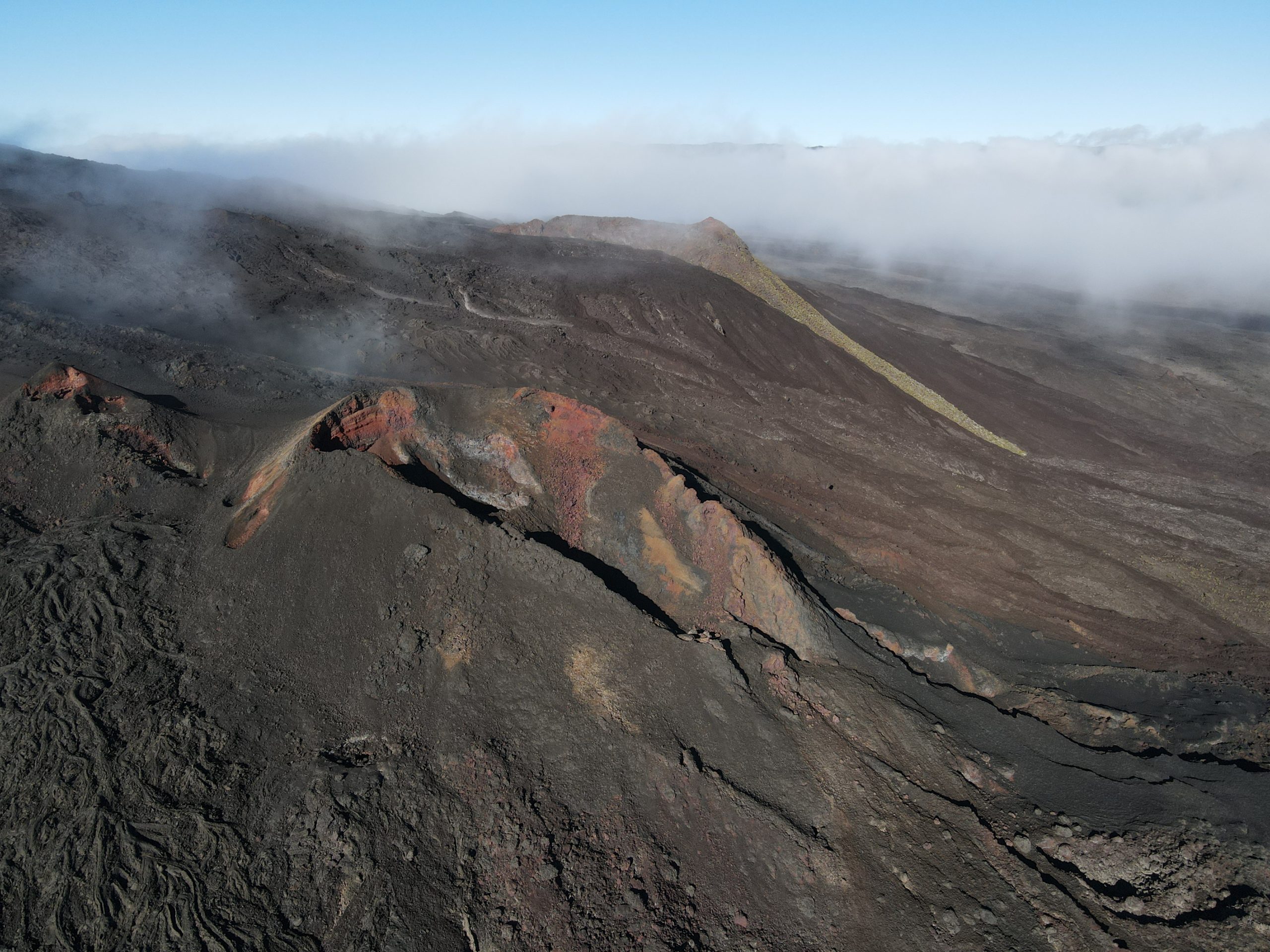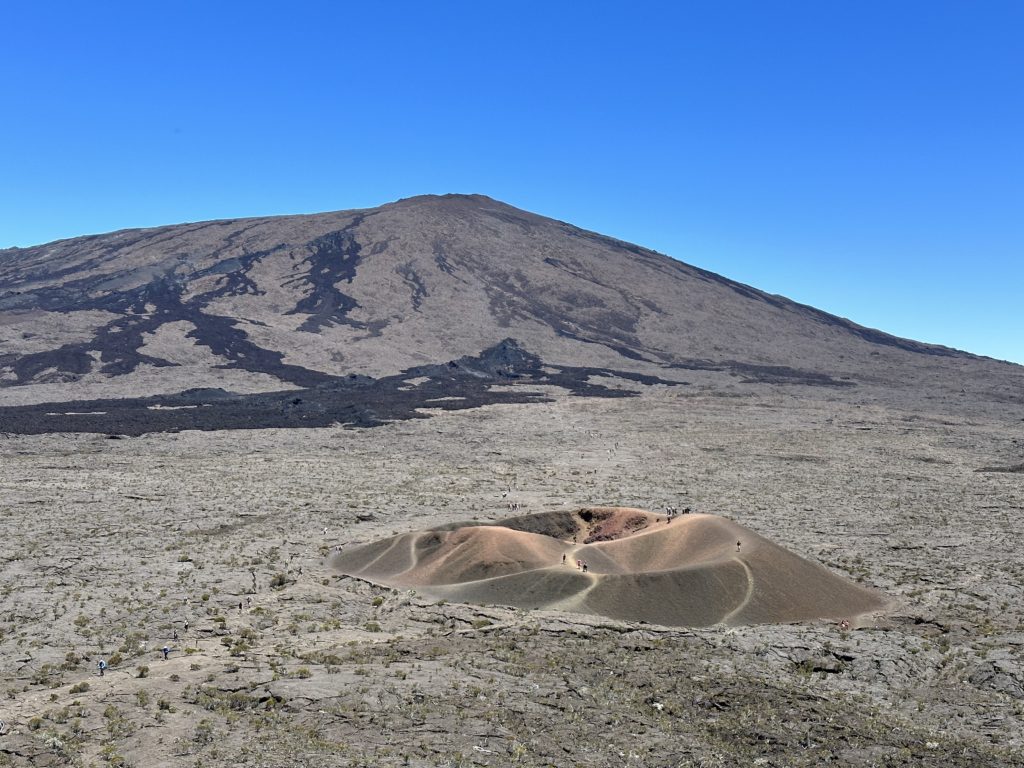 Wir sonnen uns ein wenig und absorbieren die Eindrücke, ehe wir wieder den Abstieg beginnen. Mittlerweile sind schon wirklich viele Leute unterwegs und ich bin immer wieder überrascht über mangelnde Trittsicherheit und Erscheinungsbilder mancher Menschen. Aber cool immerhin, dass sie sich die Wanderung trotzdem zu früher Stunde antun. Ich würde sagen, dass der Piton de la Fournaise vermutlich die oder eine der Hauptattraktionen der Insel ist. Mittlerweile kommen uns schon beträchtlich mehr Leute entgegen. Auf etwa halben Weg beim Abstieg entschließen wir uns, noch eine kleine extra Tour einzulegen und zu ein paar kleineren Vulkanschlunden etwas abseits zu gehen. Wir gehen nochmal ein ganzes Stück querfeldein über den erstarkten Boden der Caldera – hier sind wir immerhin auch komplett alleine.