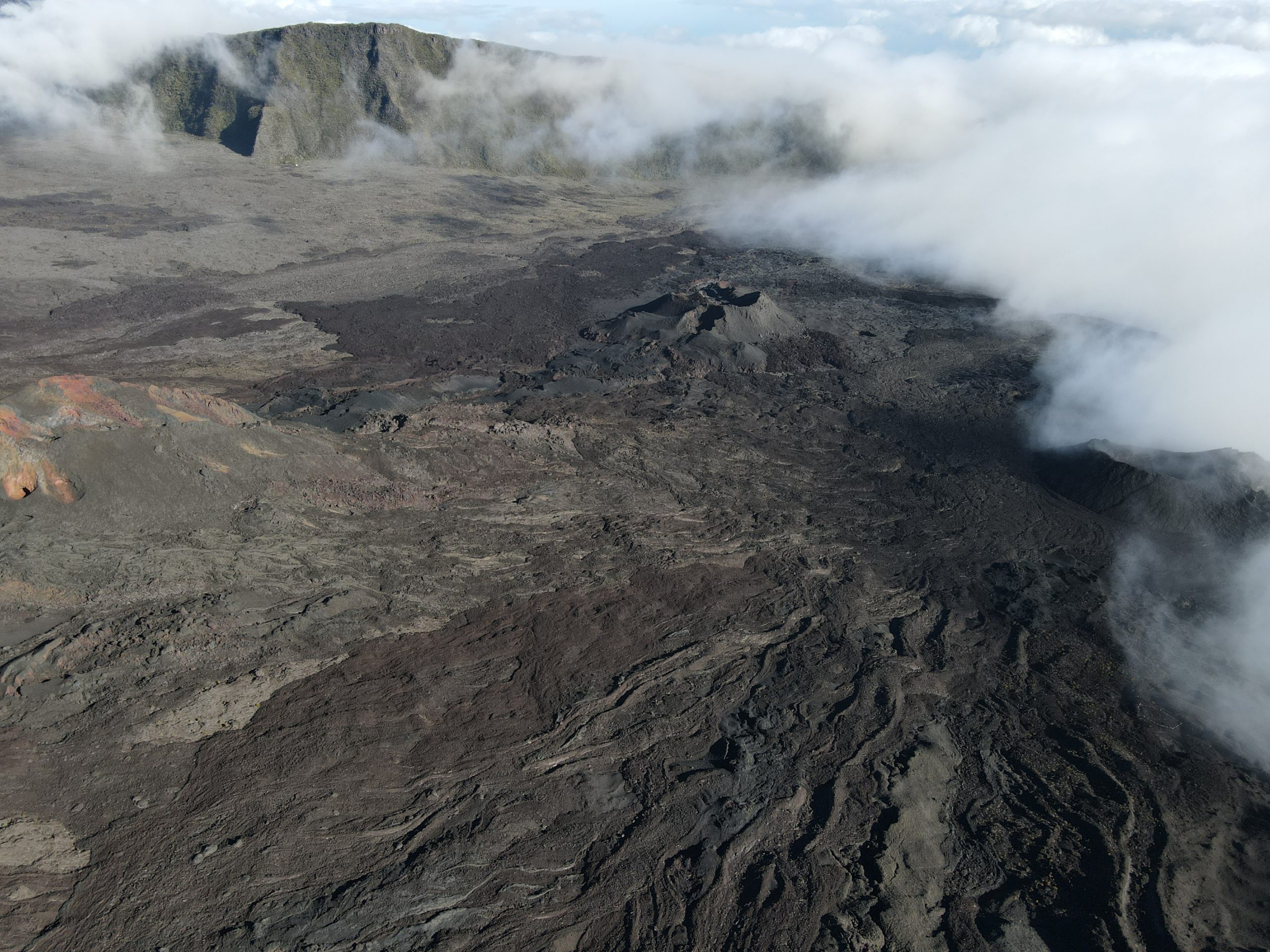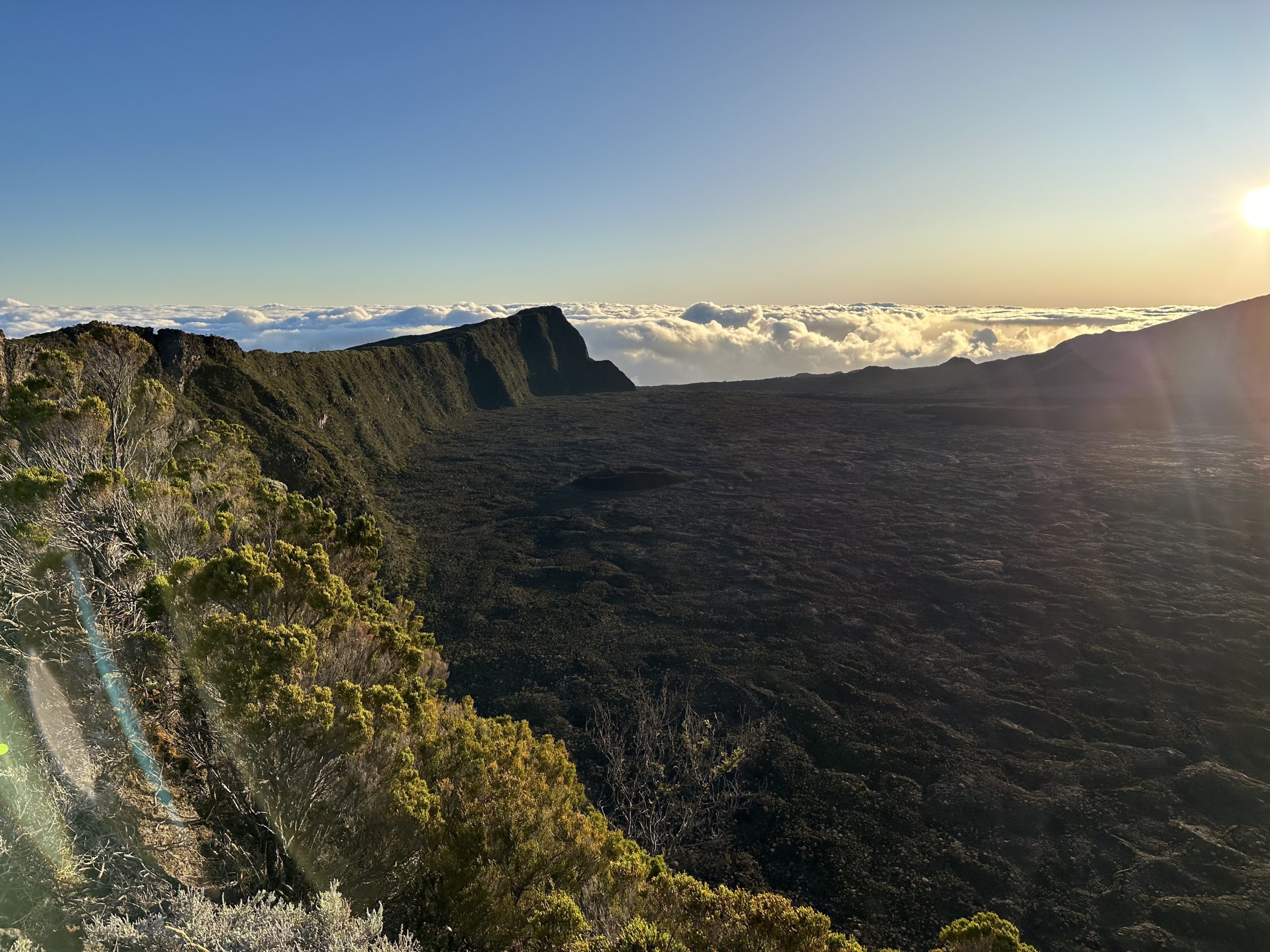 Es geht über Stufen steil hinab für etwa 200 Höhenmeter auf den Grund des Kraters. Dort marschieren wir auf erstarrtem Lavagestein in Richtung Zentrum der Caldera mit 8km Durchmesser. In dieser erhebt sich mit etwa 300 Höhenmetern nämlich die neuerste Ausprägung des Vulkans Piton de la Fournaise, einem der aktivsten Vulkane weltweit. Wir steigen über scharfkantiges und zum Teil poröses schwarzes Gestein den Weg empor. Mit uns sind auch schon einige andere Wanderer Unterwegs. Der Parkplatz war bereits gut gefüllt. La Reunion ist definitiv eine Frühaufsteherinsel. Hinter uns schwappen immer wieder Wolken in die Caldera, verziehen sich aber immer wieder.