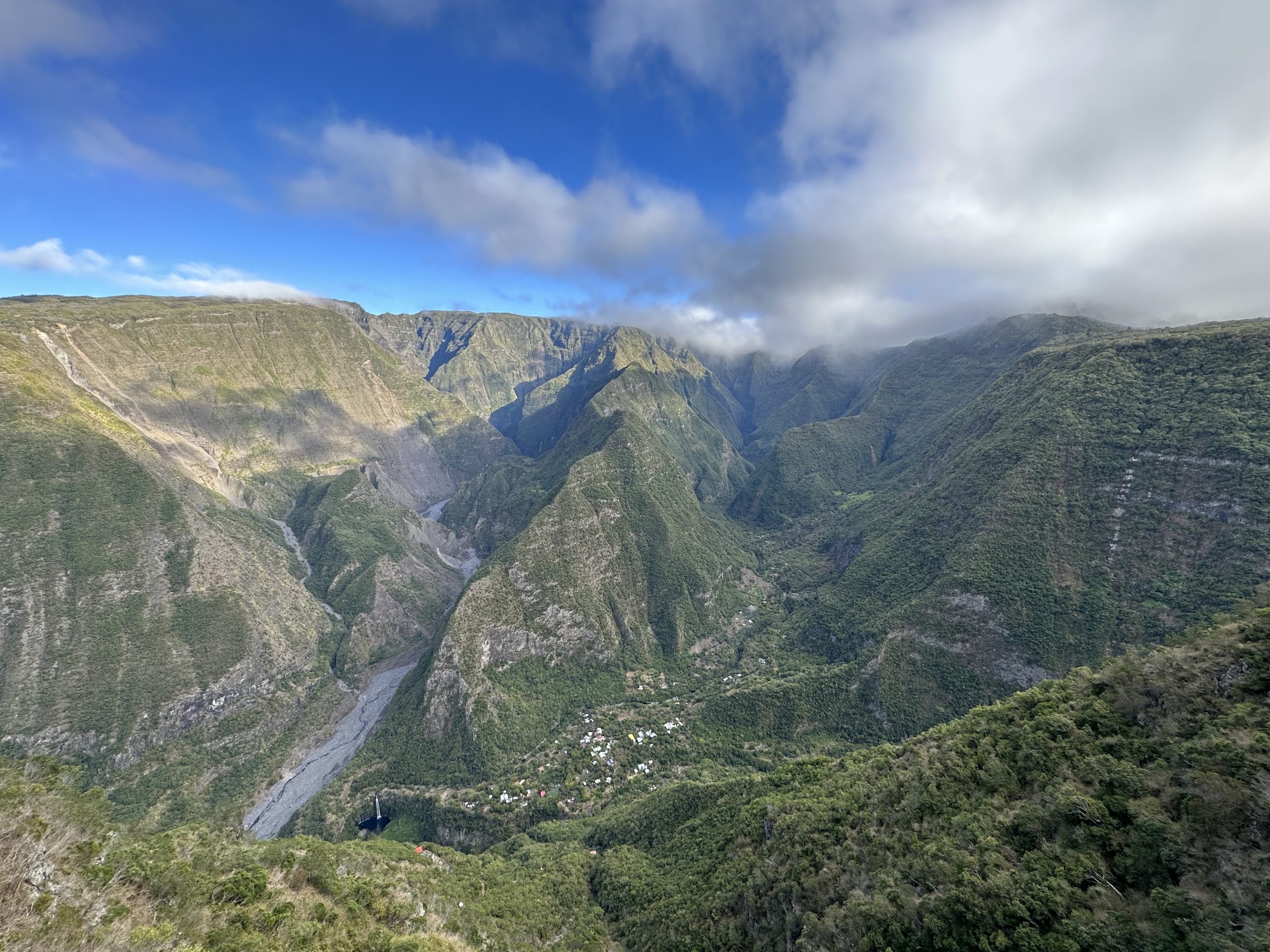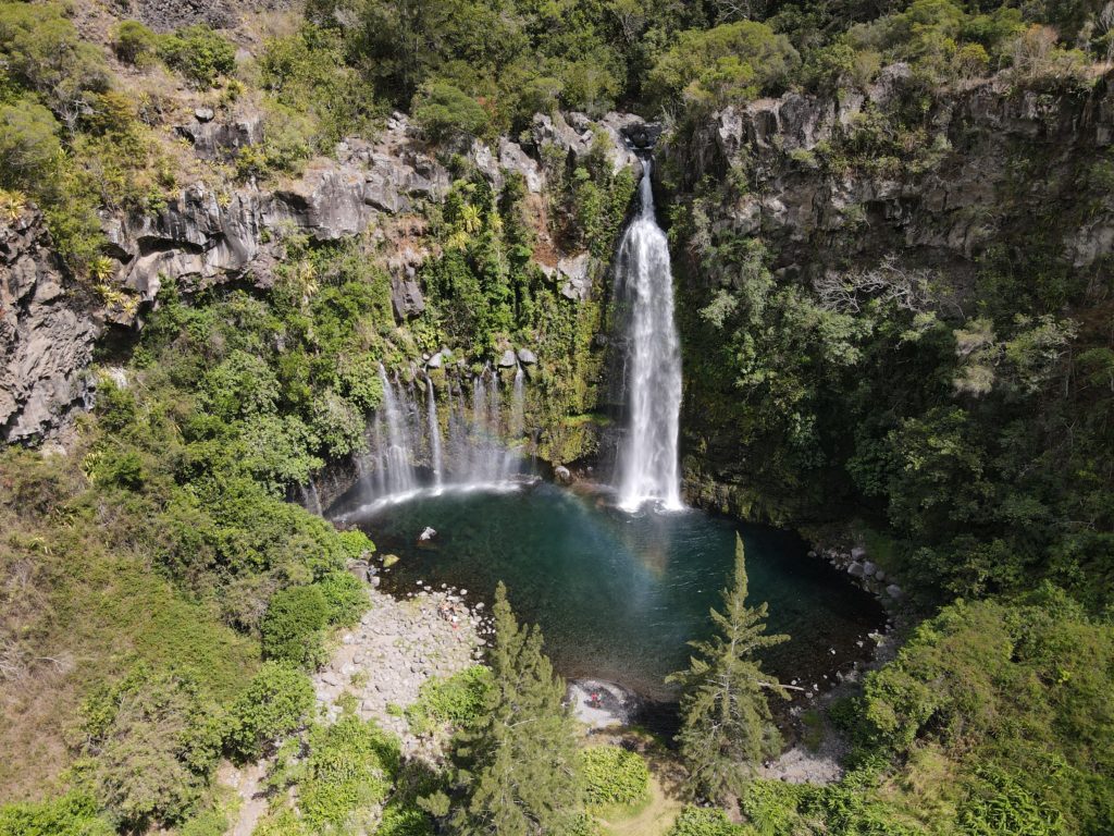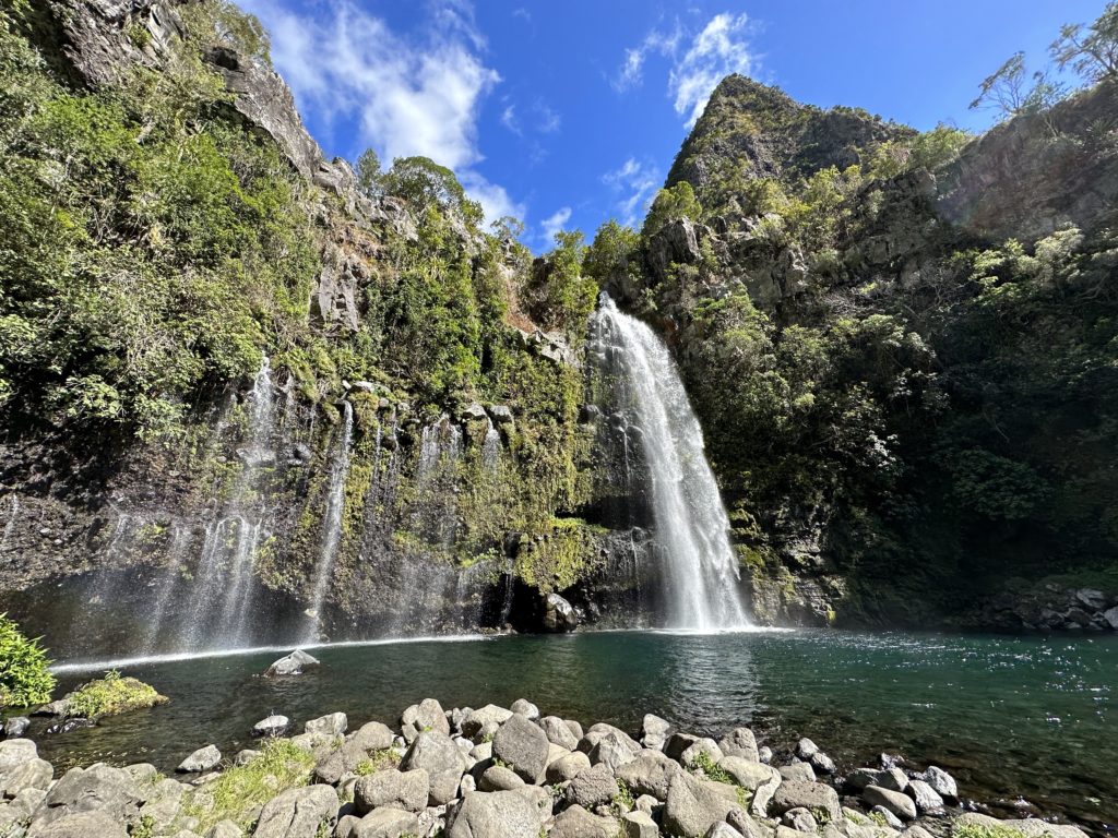 Also gut, starten wir unsere Wanderung mit einem 1000 Höhenmeter Abstieg. Die Knie noch etwas kalt, steif und müde staksen wir sehr steil in Serpentinen hinab. Die Häuser am Talboden haben von oben eine Materialseilbahn, jedoch sonst keine Zufahrtsstraße. Wir sind fasziniert, wo auf Reunion überall Leute wohnen und unter welchen Bedingungen. Nach einer guten Stunde sind wir unten angekommen und durchschreiten das Dorf. Mittlerweile scheint die Sonne, auch wenn in den Bergen nebenan einige Wolken hängen. Das Dorf wirkt eigentlich wie eine gigantische und gut bestückte Zimmerpflanzenabteilung in einem Geschäft, nur, dass hier alles wild wächst. Der Wanderweg, der gleichzeitig auch die Hauptstraße bzw. der Hauptweg der Häuser zu sein scheint, führt dann über einen Fluss – allerdings gibt es keine Brücke. Wir überqueren den Fluss über die Steine, so abgeschliffen wie diese sind, wurde der Fluss hier auch schon oft gequert. Danach geht es noch ein klein wenig hinab, ehe wir an unserem Ziel ankommen. Wir stehen über dem Wasserfall und blicken etwa 15-20 Meter hinab. Namentlich der „Cascade Grand Bassin“. Wobei Grand Bassin den Bereich beschreibt, bzw. die Ansiedelung. Wir gehen noch weiter und steigen neben dem Wasserfall hinab, ehe wir direkt unterhalb davor stehen. Eva springt ins kalte Wasser, mich reizt es nicht genug, nachdem die Sonne immer wieder weg ist und die Lufttemperatur fast zu kühl ist. Wir halten alles mit Foto und Videobeweisen fest und setzten uns dann noch hin und essen mitgebrachte Wraps, gefüllt mit Süßkartoffeln und schwarzen Bohnen. Wir haben am Vortag die halbgekochten schwarzen Bohnen nämlich mit sicher einer zusätzlichen Stunde Kochzeit nun doch einigermaßen weich bekommen.