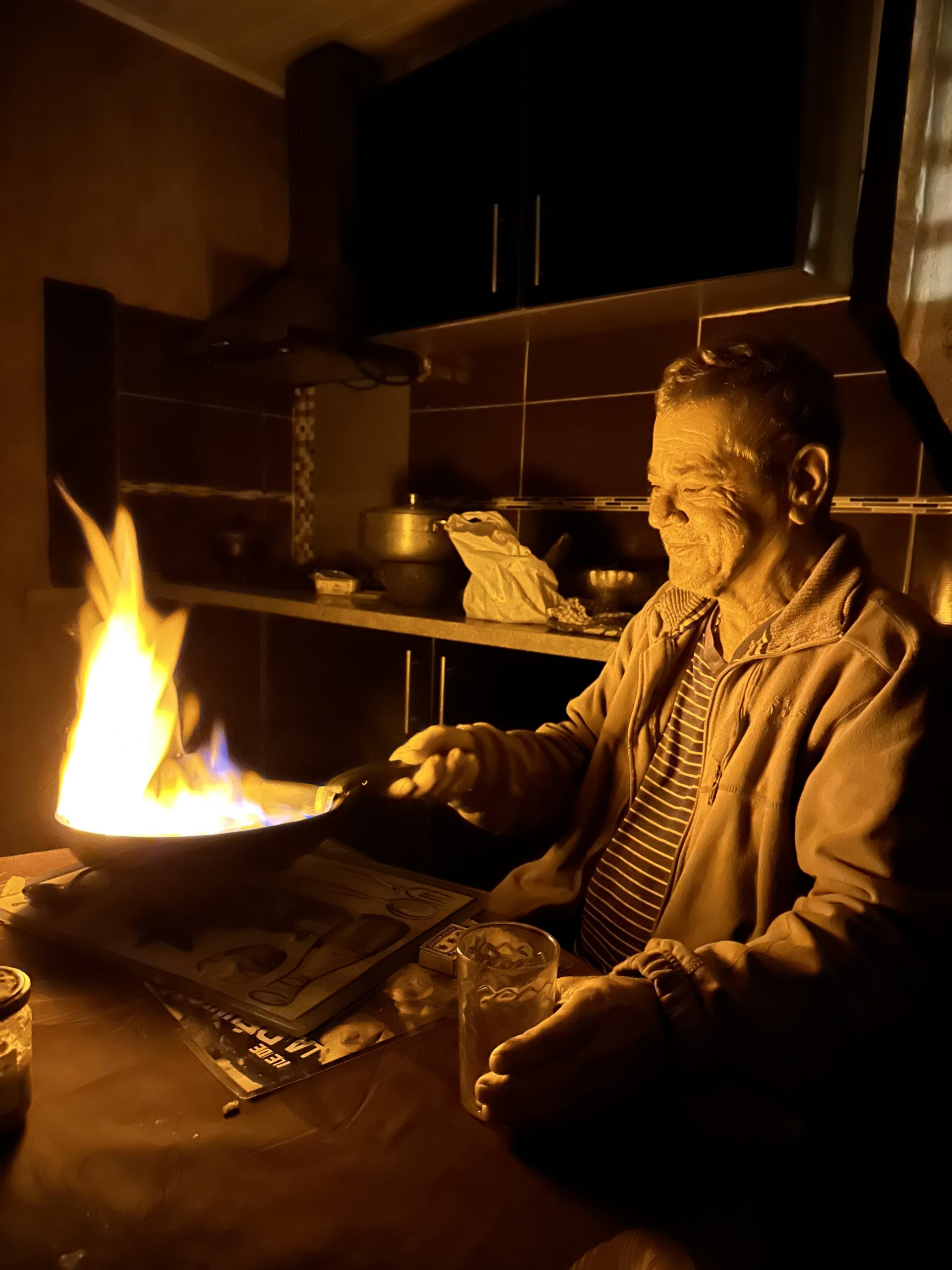Um 19:00 gibt es Abendessen. Alain hat in Summe 3 Zimmer, die er vermietet. Ein anderes französisches Pärchen isst auch mit uns und wir sitzen direkt in der Küche zu 5. am Tisch. Los geht es mit in Teig frittierten Chayoten mit einer Chili Sauce. Dazu schenkt er uns auch einen angesetzten Mispel-Schnaps bzw. Likör ein. Danach gibt es einen überbackenen Papayaauflauf. Hierfür wird eine unreife, grüne Papaya verwendet. Das war wohl das erste mal seit sehr langer Zeit Käse und Obers für mich, doch wir wollten keine Umstände machen. Hauptgericht ist Thunfisch, extrem lecker mariniert u.a. mit Zitrone und Zwiebel und dazu gibt es Reis und schwarze Bohnen in Sauce. Die Tischgespräche drehen sich hauptsächlich ums Essen, im Speziellen um Hamster, Igel, Schnecken und Wespen. Ich verstehe nicht wirklich was, bekomme aber manchmal ungefähr mit worum es geht. Eva versteht wesentlich mehr und übersetzt mir zeitweise. Als Nachspeise gibt es flambierte Bananen, was Alain sichtlich glücklich macht. Generell ist Alain wohl nicht gerne alleine und schafft sich daher eine große WG. Früher hat er scheinbar eine wesentlich größere Unterkunft irgendwo auf einem Berg gehabt und öfters für 30 Leute gekocht. Nach knappen 2 Stunden ist das ausgezeichnete Abendmahl vorbei und wir ziehen uns in unser Zimmer zurück.