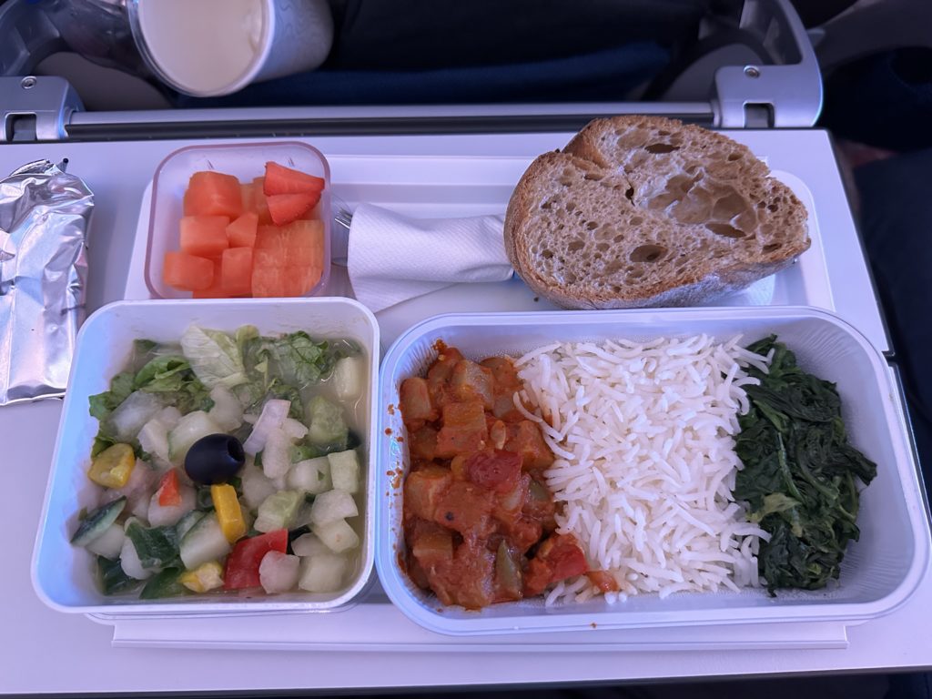 Der Flug ist erstaunlich lang. Zirka so lange, wie beim Hinflug, nur ohne Schlaf dann doch wesentlich länger. Wir sortieren Fotos, bis beide iPads keinen Akku mehr haben. Danke an dieser Stelle an das unbekannte Pärchen neben uns beim Hinflug, welches uns den Tipp gegeben hat, dass man beim Online-Checkin-Portal kulinarische Sonderwünsche kostenfrei angeben kann. So bekommen wir ein veganes Frühstück und Mittagessen, welches zwar unseren Kalorienbedarf nicht deckt, aber trotzdem deutlich gesünder ist als die normale Kost. Nochmals Danke an die Edelweißair für das tolle Angbot.