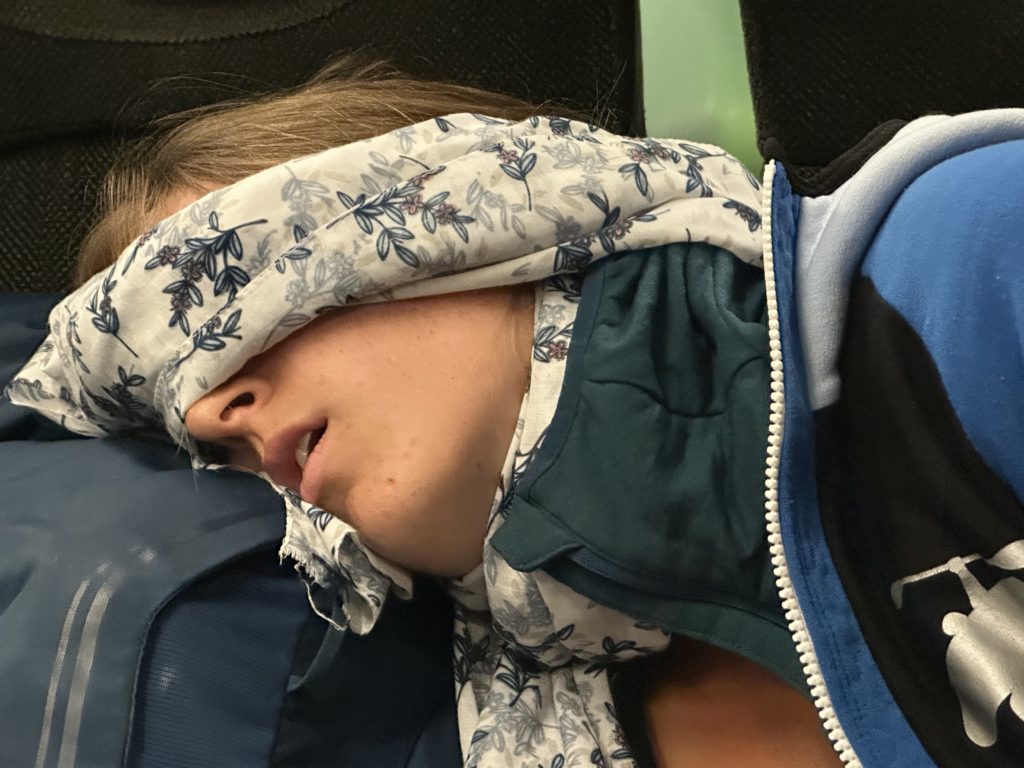 Um 04:30 geht unser Wecker. Morgentoilette erledigen und die letzten Teile in den Koffer und Tasche packen und los geht’s. Um 05:00 fahren wir los, die Fahrzeit zum Flughafen beträgt etwa eine Stunde. Wir haben bewusst nicht die kürzeste Route über die Berge gewählt, da unser Mietauto in keinem vertrauenserweckenden Zustand ist und wir den Flieger nicht wegen einer Panne verpassen wollen. Auf der Hauptstraße würden wir immerhin vermutlich rechtzeitig ein Taxi finden. Mit etwas Gescheppere im Motorraum kommen wir aber gut beim Flughafen an. Die beiden Kite-Taschen liegen auf dem nach hinten geneigten Beifahrersitz und Eva sitzt hinten. Beim Flughafen laden wir unser Gepäck auf Wagerln und ich parke das Auto am Parkplatz und hinterlege den Schlüssel am Reifen, denn unser Autovermieter bzw. dessen Fahrer, der das Auto holen soll, ist noch nicht da. Wir gehen einchecken und siehe da – mit der zweiten Kite-Tasche haut alles wunderbar hin. Wir zahlen 0€ Aufpreis und sind tatsächlich beim Koffer und allen Taschen minimal unter dem Gewichtslimit. Prima! Großes Danke an die sportliche Unterstützung der Edelweißair. Es fliegen übrigens erstaunlich viele, größtenteils ältere Menschen mit Golfgepäck mit uns mit. Nachdem der Check-In erledigt ist gehen wir noch zum Zollamt, denn wir können uns scheinbar die Mehrwertsteuer unserer gekauften Kite-Tasche zurückgeben lassen. Keine Ahnung wieso wir das können bzw. dürfen, aber wir haben natürlich zugestimmt, als uns die Dame im Shop die dafür benötigten Dokumente ausgestellt hat. Beim Serviceschalter bekommen wir unsere Rechnung und Formular beglaubigt und können uns später nach der Sicherheitskontrolle am Gate das Geld auszahlen lassen. Nachdem nun das Wichtigste erledigt ist und wir noch Lebensmittel und Zeit haben, setzen wir uns vor dem Flughafen im Freien auf eine Bank und essen gemütlich unser Frühstücksmüsli. Natürlich schmunzeln ein paar Leute, aber das stört uns nicht – zumindest nicht maßgeblich. Als wir ein Selfie machen wollen, bietet uns eine Schweizerin sogar direkt an ein Foto von uns zu machen, solch eine Attraktion bieten wir.