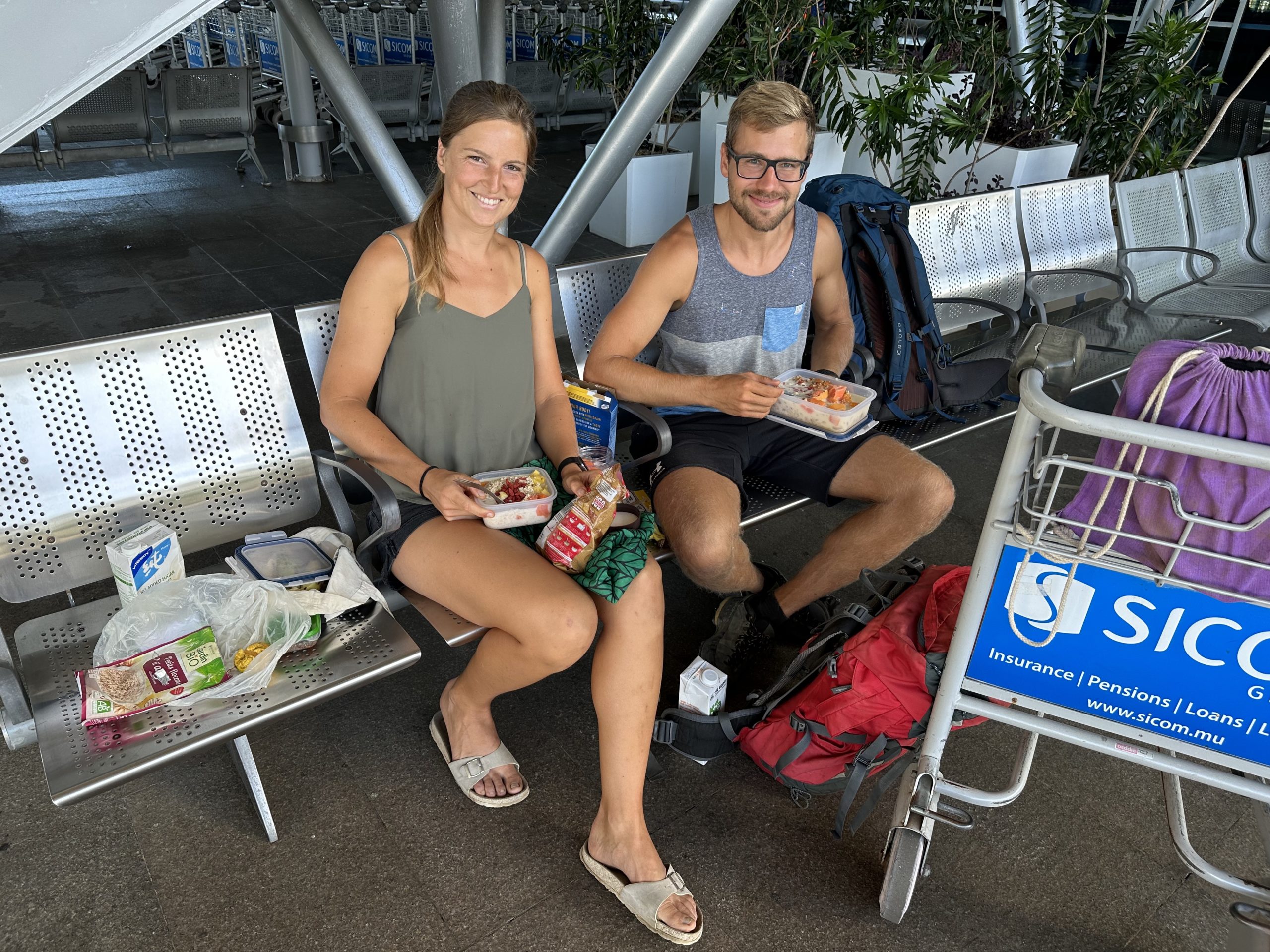 Um 04:30 geht unser Wecker. Morgentoilette erledigen und die letzten Teile in den Koffer und Tasche packen und los geht’s. Um 05:00 fahren wir los, die Fahrzeit zum Flughafen beträgt etwa eine Stunde. Wir haben bewusst nicht die kürzeste Route über die Berge gewählt, da unser Mietauto in keinem vertrauenserweckenden Zustand ist und wir den Flieger nicht wegen einer Panne verpassen wollen. Auf der Hauptstraße würden wir immerhin vermutlich rechtzeitig ein Taxi finden. Mit etwas Gescheppere im Motorraum kommen wir aber gut beim Flughafen an. Die beiden Kite-Taschen liegen auf dem nach hinten geneigten Beifahrersitz und Eva sitzt hinten. Beim Flughafen laden wir unser Gepäck auf Wagerln und ich parke das Auto am Parkplatz und hinterlege den Schlüssel am Reifen, denn unser Autovermieter bzw. dessen Fahrer, der das Auto holen soll, ist noch nicht da. Wir gehen einchecken und siehe da – mit der zweiten Kite-Tasche haut alles wunderbar hin. Wir zahlen 0€ Aufpreis und sind tatsächlich beim Koffer und allen Taschen minimal unter dem Gewichtslimit. Prima! Großes Danke an die sportliche Unterstützung der Edelweißair. Es fliegen übrigens erstaunlich viele, größtenteils ältere Menschen mit Golfgepäck mit uns mit. Nachdem der Check-In erledigt ist gehen wir noch zum Zollamt, denn wir können uns scheinbar die Mehrwertsteuer unserer gekauften Kite-Tasche zurückgeben lassen. Keine Ahnung wieso wir das können bzw. dürfen, aber wir haben natürlich zugestimmt, als uns die Dame im Shop die dafür benötigten Dokumente ausgestellt hat. Beim Serviceschalter bekommen wir unsere Rechnung und Formular beglaubigt und können uns später nach der Sicherheitskontrolle am Gate das Geld auszahlen lassen. Nachdem nun das Wichtigste erledigt ist und wir noch Lebensmittel und Zeit haben, setzen wir uns vor dem Flughafen im Freien auf eine Bank und essen gemütlich unser Frühstücksmüsli. Natürlich schmunzeln ein paar Leute, aber das stört uns nicht – zumindest nicht maßgeblich. Als wir ein Selfie machen wollen, bietet uns eine Schweizerin sogar direkt an ein Foto von uns zu machen, solch eine Attraktion bieten wir.
