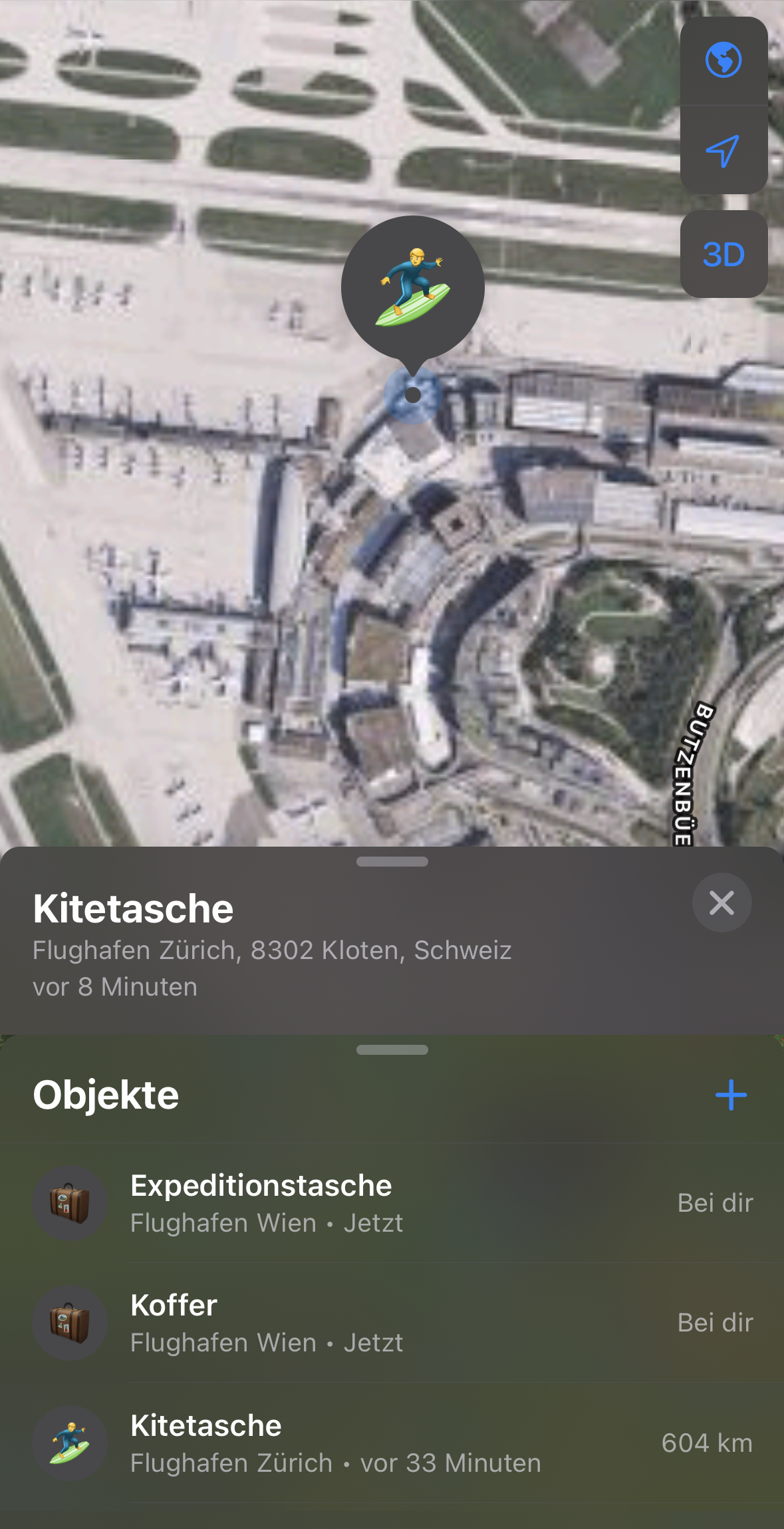 Nach knappen 12h Flug landen wir um 17:00 in Zürich, wo unser Anschlussflug nach Wien bereits um 17:50 startet. Wir beeilen uns und es geht sich alles ganz gut aus. Wir sind zwar die letzten im Flieger, aber das Gate hätte noch 2 Minuten offen gehabt. Beim Boarding ernten wir, bzw. vor allem ich fragende Blicke, denn ich bin immer noch in Tanktop und kurzer Hose unterwegs, während alle anderen scheinbar schon frieren und großteils in Daunenjacken gehüllt sind. Die Stewardess fragt uns sogar, wo wir gerade herkommen. Der Weiterflug nach Wien ist sonst unspektakulär, aufgrund des Hochnebels bleibt uns auch jegliche Aussicht bis kurz vor der Landung verwehrt. In Wien kommen unsere Koffer als erstes beim Gepäckband, logisch, denn wir sind ja auch als letzte eingestiegen. Leider warten wir dafür aber beim Sondergepäcksschalter umsonst, denn auch nach einigen Minuten sind unsere beiden Kite-Taschen noch nicht da. Ich habe glücklicherweise einen AirTag in einer der Taschen gelassen und rufe nun am Handy den Standort ab. Ich sehe, dass der letzte übermittelte Standort in Zürich am Flughafen war. Und das vor 20 Minuten. Also definitiv, als es schon in der Luft hätte sein sollen.