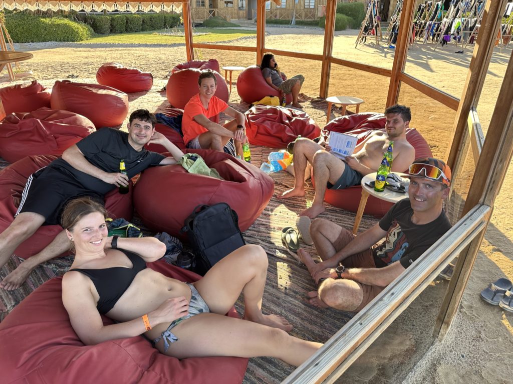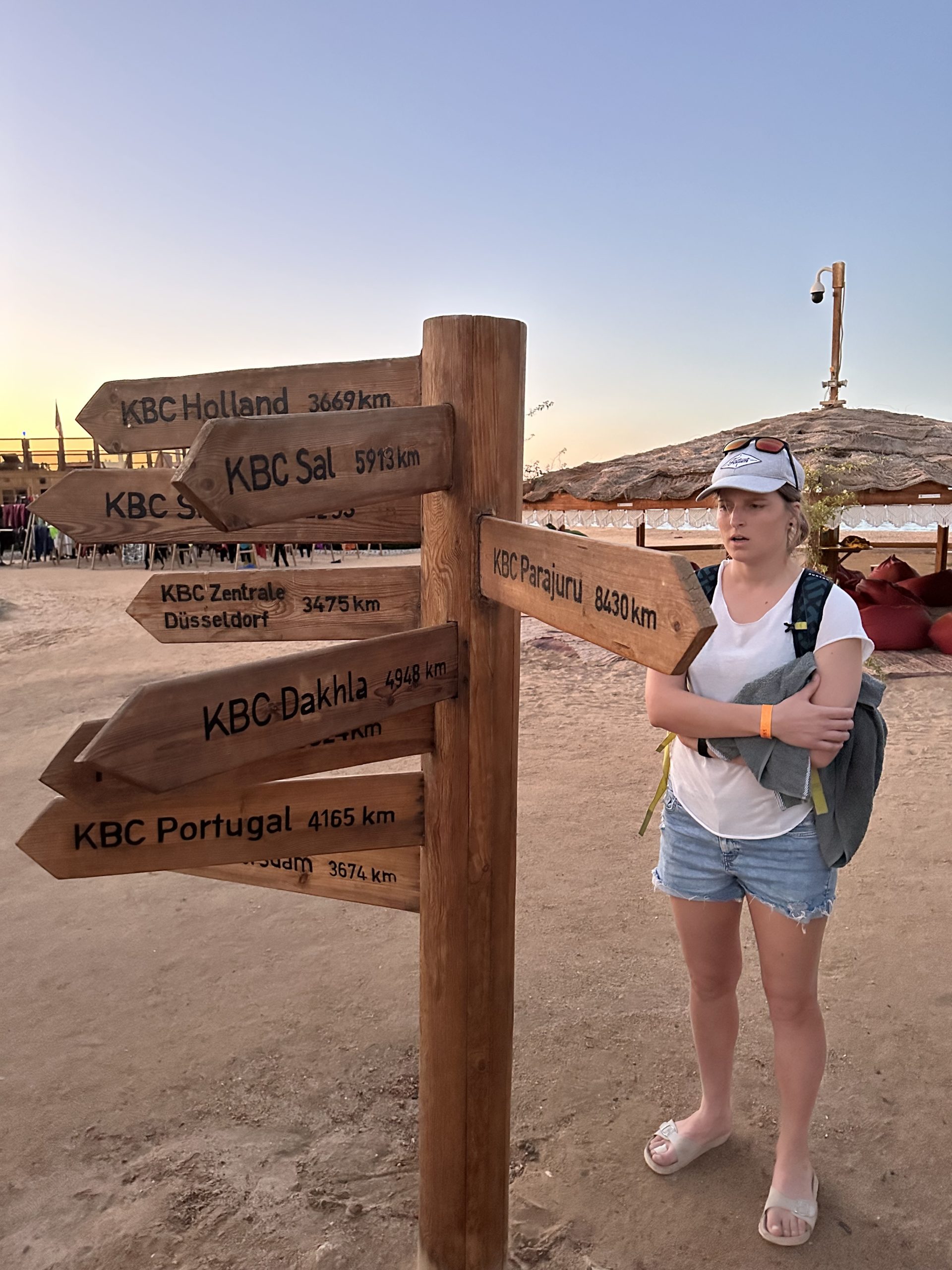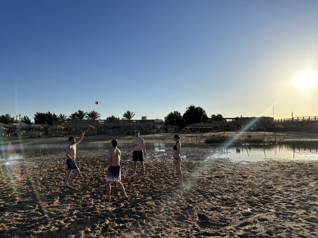 Etwas später starte ich dann, als der Wind etwas auffrischt. Im Grunde ist es so, wie in der Früh, kaum genug zum Höhe laufen – doch zwei, drei Böen kann ich für den einen oder anderen Sprung nutzen. Nach etwa 30 Minuten am Wasser übergebe ich den Schirm wieder an Eva. Doch, als ich von der Dusche zurückkomme, sehe ich, dass sie schon etwa 150 Meter windabwärts beim nächsten Kitespot durchs Wasser watet. Ich laufe zu ihr und lande ihr den Schirm und wir spazieren den Strand zurück rauf. Der Wind hat inzwischen nochmals abgenommen und so konnte sie keine Höhe mehr gewinnen um zurück zu kommen. Der Tag ist nun Kite-mäßig endgültig gelaufen und wir trainieren dafür ein bisschen im Flintstone-Gym und spielen im Anschluss einige spannende Partien Spikeball im Sonnenuntergang.