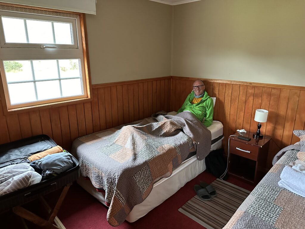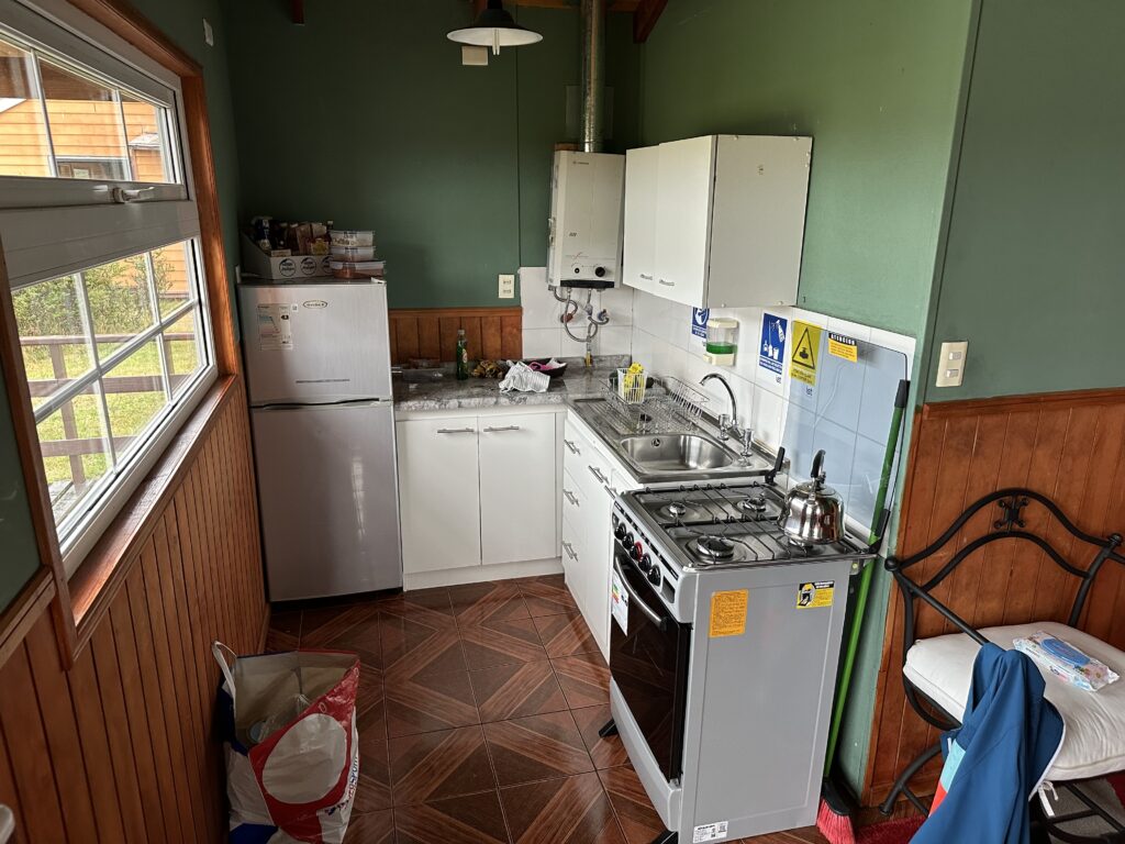 Beim Fenster raus sehen wir heute die Torres del Paine nicht, die Wolken/Nebel/Regenfront ist zu dicht. Wir verstopfen noch das Klo und laden im leichten Regen unser Zeug ins Auto. Los geht es, circa 500 Meter auf die andere Seite von Villa Serrano, wo wir bei den Cabañas Tyndall (= Hütten Tyndall) stoppen und fragen, ob wir eventuell schon frühzeitig einchecken können. Wir finden eine äußerst nette Angestellte oder vielleicht sogar die Chefin und haben Glück. Unsere Hütte war diese Nacht frei und so können wir sie bereits beziehen. Mit einem Leiterwagen bringen wir unsere Koffer zur Hütte und ziehen in die durchaus geräumige und vor allem sehr helle Unterkunft ein. Der Regen hat sich mittlerweile wirklich zu einem Dauerregen entwickelt, aber immerhin ist es windstill und wir haben einen guten Blick nach draußen und freuen uns auch mal über etwas Zeit und Ruhe. Klaus ist auch etwas angeschlagen von den letzten Tagen, also passt das sehr gut. Strom gibt es zwischen 12:00 und 15:00 keinen.