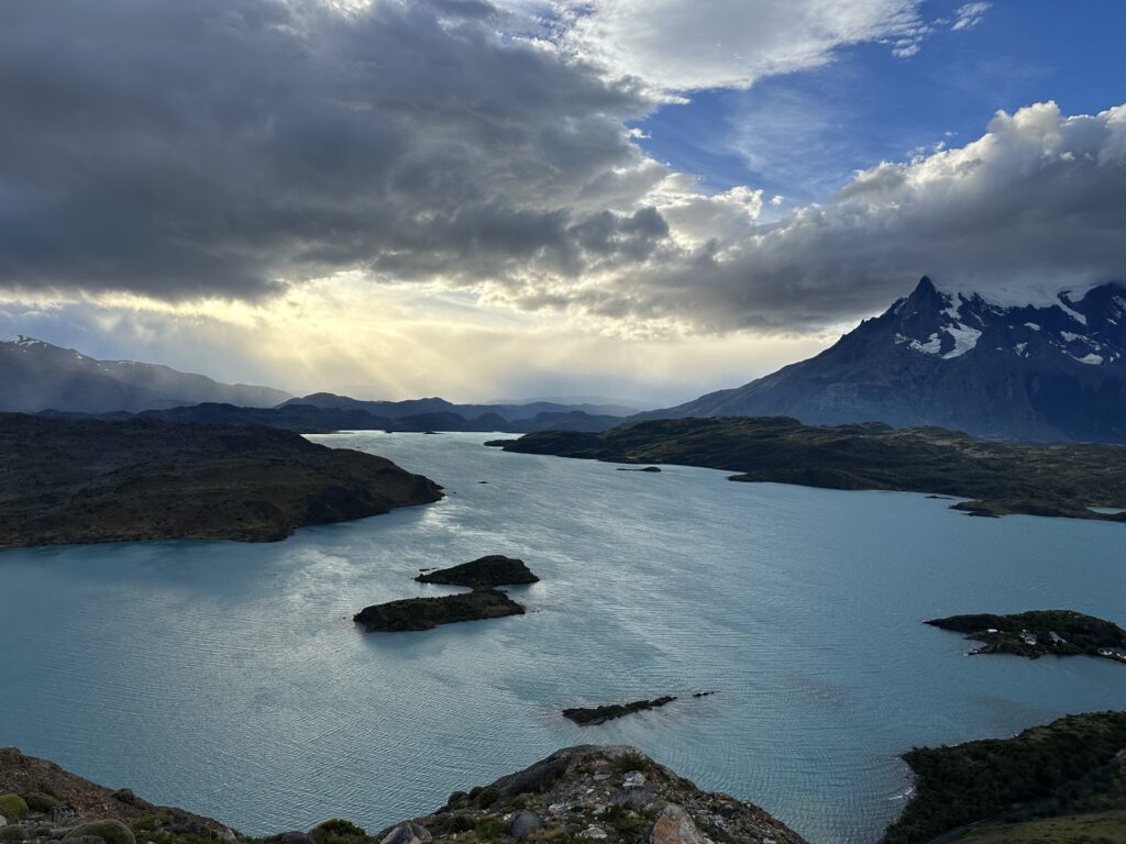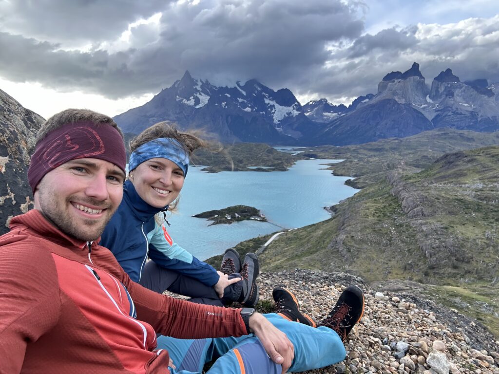 In Rally Manier fliegen wir über die Schotterpisten, sind in etwa 20 Minuten am Parkplatz und steigen in etwa weiteren 20 Minuten flink den Berg hinauf. Gleichzeitig erproben wir unsere neuen hohen, und gleichzeitig trotzdem leichten Wanderschuhe, die wir uns extra für den Trip noch besorgt hatten. Der Wind ist wieder vorhanden, wenngleich aber schwächer als gestern. Man muss keine Angst mehr haben davonzufliegen. Beim Durchqueren der Scharte pfeift es zwar wohl auch wieder mit ~80 km/h, doch man wird diesmal nicht einfach verblasen. Uns begegnen auch ein paar andere Leute, als wir auf den Gipfel weiter hinauf steigen. Wir machen einiges an Fotos und Videos, ehe wir uns in den Windschatten eines Steinblockes setzen und dort wohl für 1 oder vielleicht sogar 2 Stunden verbringen und die Landschaft beobachten. Wir haben Hoffnung, dass die Sonne doch auch noch zur Gänze durchbrechen kann, doch unsere Wünsche gehen nicht ganz in Erfüllung. Als sie gegen 20:30 dann untergeht steigen wir wieder ab. Der Platz und die Umgebung haben aber so was magisches, dass wir überglücklich sind, das erleben zu dürfen. Man kann das gar nicht auf Bildern rüberbringen, aber die Farbspiele zwischen dem steppenartigen, trockenen Gras, diversen Bodengewächsen, den Seen, dem Himmel und den Granittürmen ist einfach absolut genial. Kombiniert mit dem starken Wind fühlt man sich einfach den Urkräften dieses Planeten, auf dem wir doch nur eigentlich kleinste und kurzweilige Wesen sind, ausgesetzt.