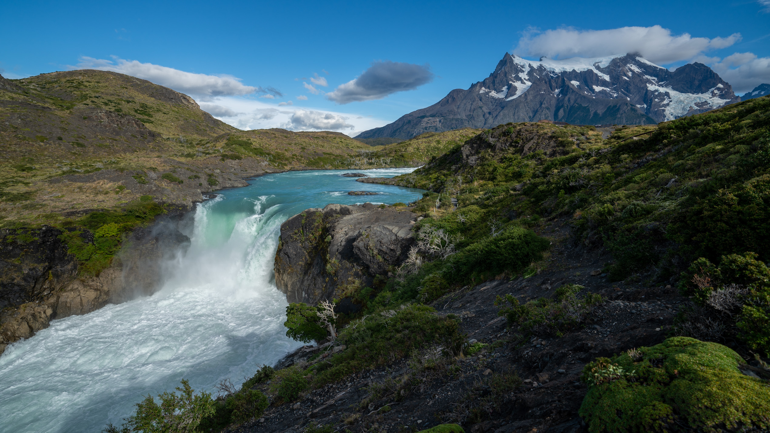 Nach etwa 20 Minuten gebe ich hoffnungslos auf und gehe wieder hinein. Die anderen sind auch schon munter und Leben kommt ins Hostel, denn um 07:30 gibt es Frühstück. Dieses besteht aus Haferflocken, Joghurt, sowie Weißbrot, Kuchen, Schinken, Käse und Eier. Wir peppen die Haferflocken mit unseren eigenen Nüssen und unserem Obst auf. Das Brot und die Eier nehmen wir als Jause mit. Gestern Abend haben uns zwei Berlinerinnen angesprochen, ob wir sie mit dem Auto in den Nationalpark mitnehmen könnten, denn die Busse sind leider nur sehr unzuverlässig. Das tun wir und so starten wir zu 5. in unserem Auto in Richtung Dock der Fähre. Am Weg sehen wir ein paar Guanacos direkt neben der Straße. Die Wolken haben sich nun tatsächlich etwas verflüchtigt und zeitweise scheint die Sonne auf die Berge. Ganz schön ist es jedoch trotzdem nicht. Bei der Fähre stellt sich heraus, dass wir uns für eine Stunde anstellen müssten. Bei gemischtem Wetter und 60€ pro Person für Hin- und Retourfahrt entscheiden wir uns jedoch dagegen. Stattdessen streben wir gleich nebenan den Salto Grande (Großer Wasserfall) und dem Mirador de los Cuernos an. Klaus ist heute schon nochmal fitter und wir freuen uns den gemütlichen Spaziergang mit ihm gemeinsam zu machen. Auch sind unsere Knie und Beine von der Wanderung des Vortages durchaus auch dankbar über einen lockeren Marsch. Der Wasserfall befördert 100m³ Wasser in der Sekunde, hat also ein anschauliches Ausmaß.