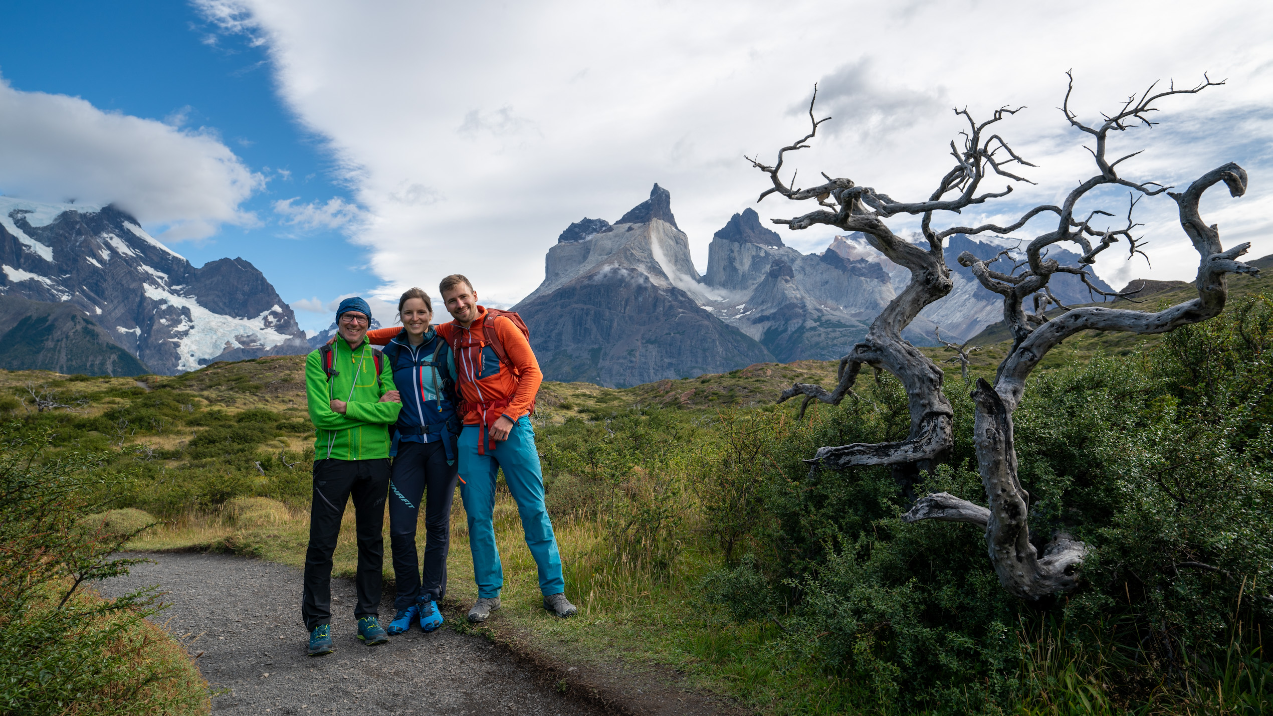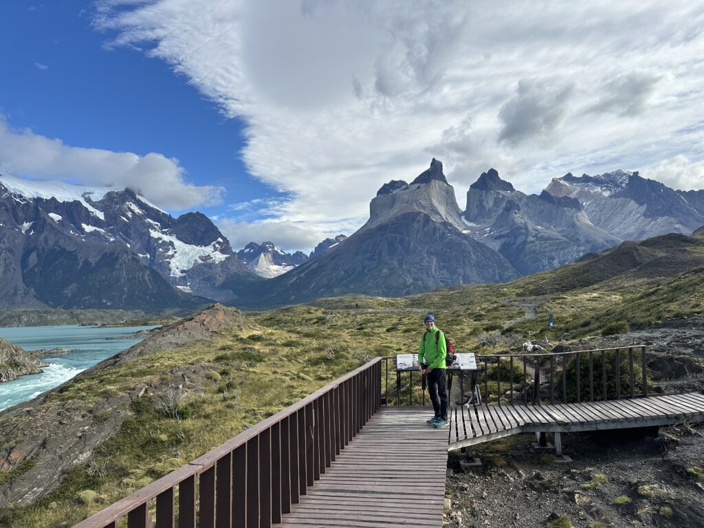 Wir wandern durch sanfte Hügel mit abgebrannten Bäumen und vielen verschiedenen Arten von Büschen. Auch finden wir mehrere Calafate Büsche, eine Art Heidelbeere. Man sagt, dass, wenn man diese isst, man irgendwann wieder nach Patagonien zurückkehren wird. Mit uns sind auch einige andere Menschen auf dem Weg unterwegs. Nach etwa 1h erreichen wir das Ende des Weges: Der Aussichtspunkt liegt direkt über bzw. an dem See, der vor dem Bergmassiv und den Cuernos (den großen Granittürmen) liegt. Zu unserer Linken ist auch der andere große Berg, mit eindrucksvollem Gletscher oben, mit ordentlicher Abrisskante. Immer wieder hören wir in der Ferne ein Donnern. Wir können es nicht ganz einordnen, doch wir sind uns ziemlich sicher, dass wir Gletscherabbrüche hören. Doch direkt erblicken können wir nichts.