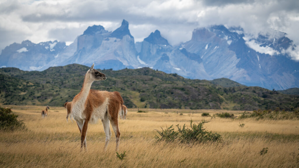 Wir gehen den gleichen Weg wieder zurück zum Auto. Anschließend fahren wir nochmal quer durch den Park an das andere Ende, um auch noch einen Blick auf den Gray Gletscher werfen zu können. Bei der Anfahrt durch die Grassteppe erblicken wir hocherfreut Guanacos, und so wie wir es bestellt hatten, grasten sie direkt vor dem Torres del Paine – Bergpanorama. Da wurden natürlich gleich Fotos und Videos geschossen.