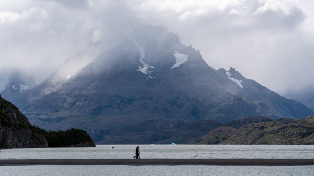 Am Besucherzentrum des Grey-Gletschers angekommen, stellen wir anhand der Menge parkender Autos fest, dass auch dies ein wohl sehr beliebtes Ausflugsziel ist. Die Wanderung zum Aussichtspunkt führt erstaunlicherweise auf einem wenige Meter breiten aber circa 1km langen Sand/Kies-Streifen auf eine Insel im Lago Grey. In der Ferne lassen sich in leuchtendem Blau einige Eisberge erahnen, doch leider hat es keiner nahe genug an uns heran geschafft.