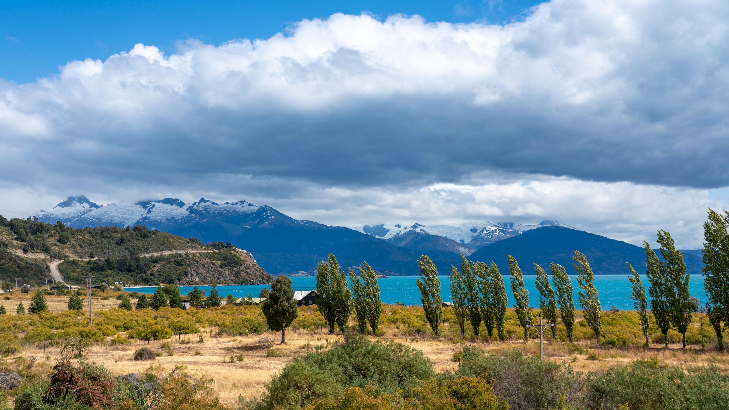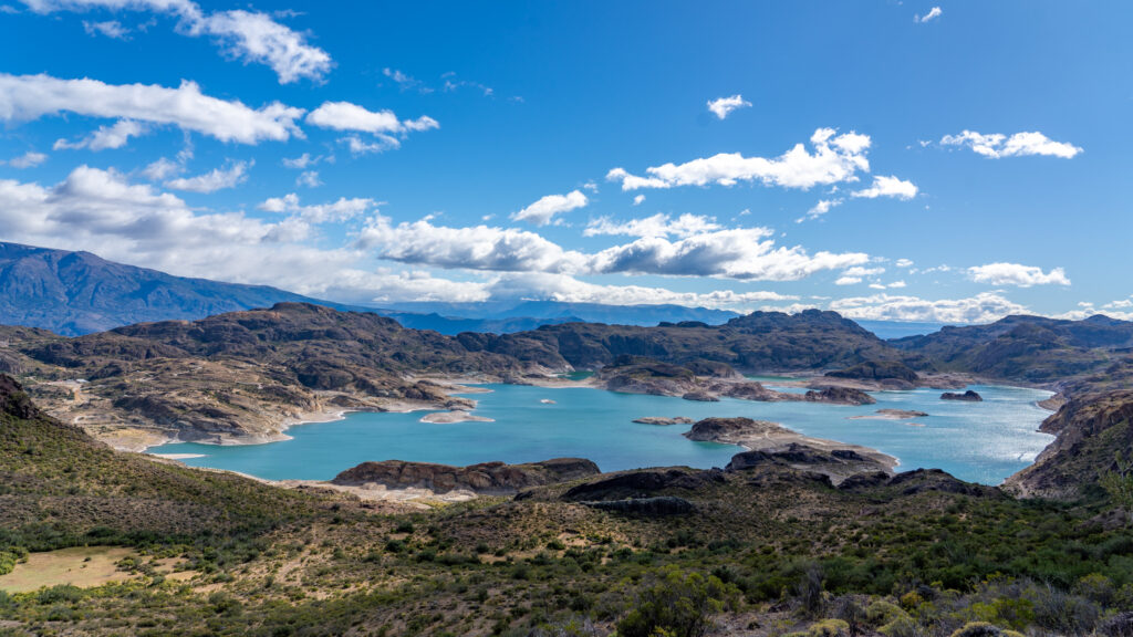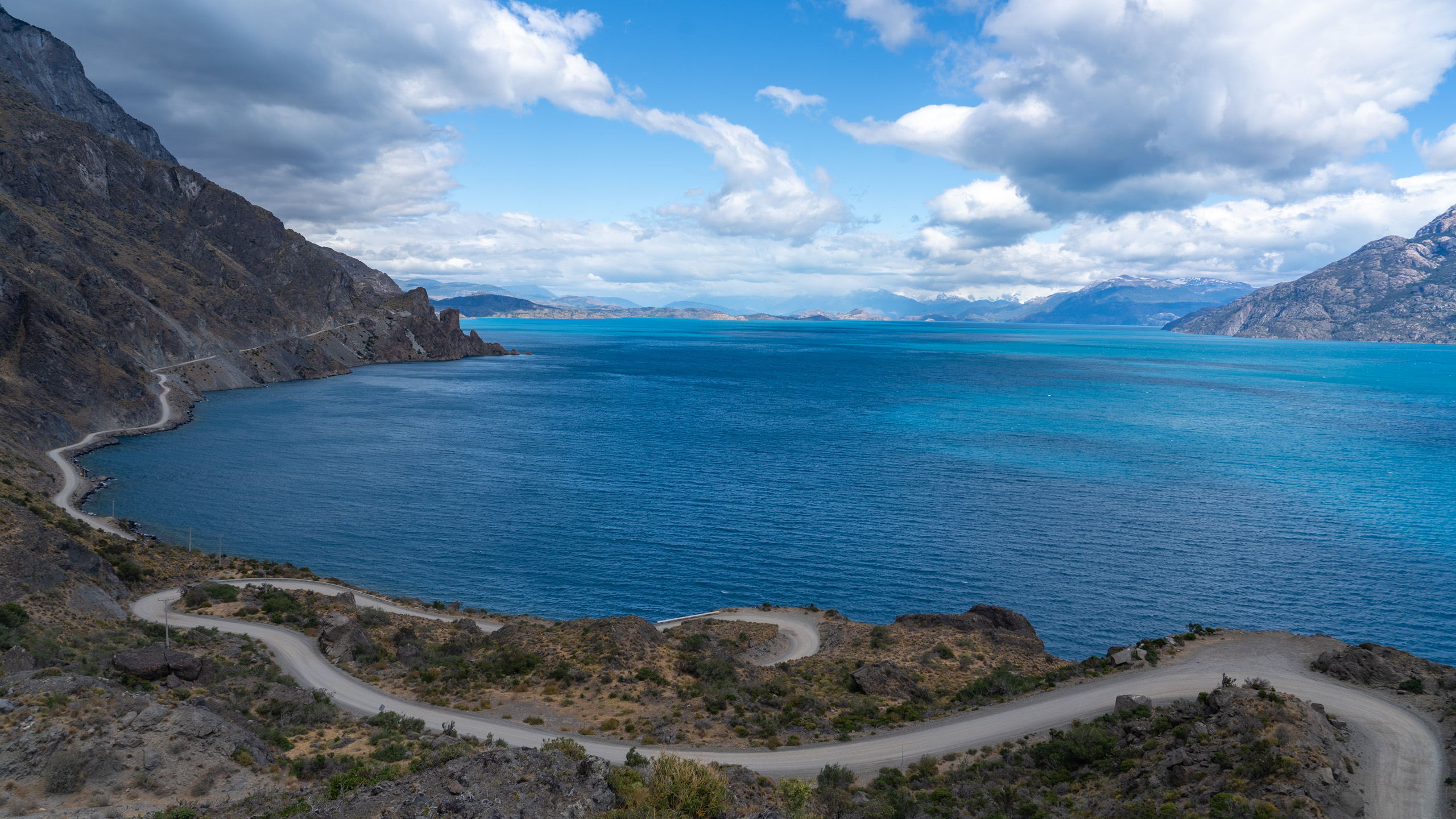 Wir fahren stundenlang über hundert Kilometer in einer Richtung am See entlang durch wechselnde Landschaften, ehe wir das westliche Ende erreichen und Richtung Norden auf die Routa 7 abbiegen. Diese äußerst bekannte Straße ist die chilenische Nord-Süd Verbindung. Natürlich aber trotzdem nur eine Schotterpiste. Man merkt aber, dass diese bei Reisenden sehr beliebt ist, denn wir treffen wieder auf mehr Verkehr. Camper, Motorrad Fahrer und aber auch einige Fahrradfahrer. Sogar zwei Familien treffen wir, einmal mit Tandem Rädern und einmal fahren die beiden Kinder sogar mit eigenen Rädern. Bemerkenswert.
