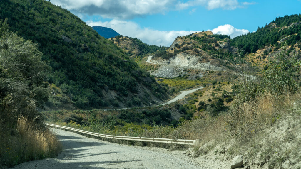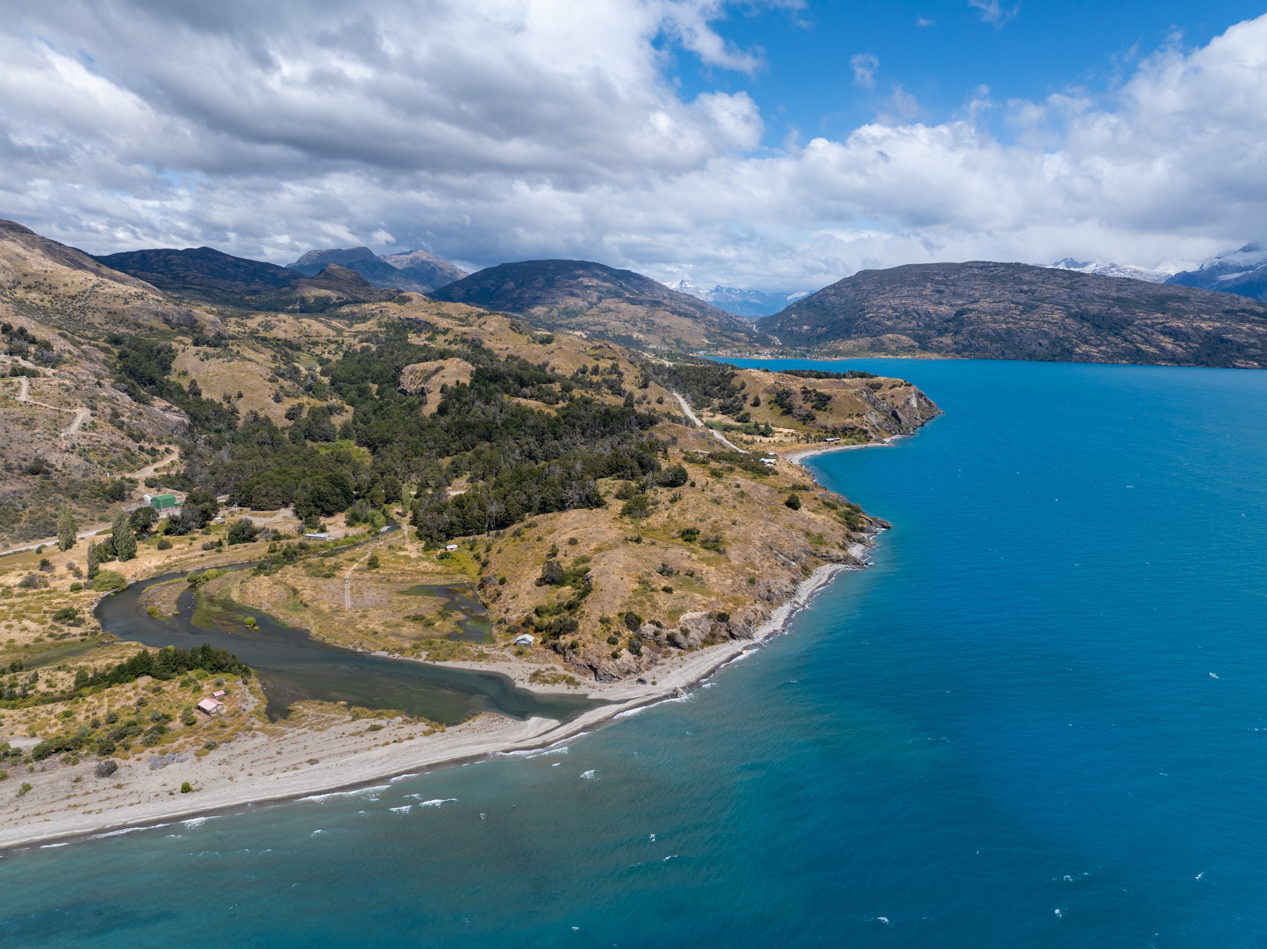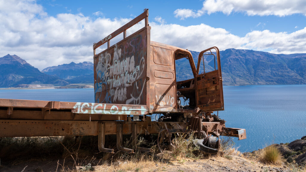 Es geht entlang vom Lago Buenos Aires, welcher abermals gigantische Dimensionen hat. Die Straße ist eine Schotterpiste und geht in beeindruckenden Steigungen und Gefällen zwischen Steinen und unter Felswänden entlang des Seeufers. Wir passieren ein Gold- und Silberbergwerk, welches laut der aufgestellten Werbung vorzügliche Erträge liefert. Es ist wieder einmal sehr windig, doch das Wetter ist eigentlich sehr schön. Beeindruckend sind die felsigen Berge, dazwischen kleinere grüne Oasen oder sogar Strände am See.