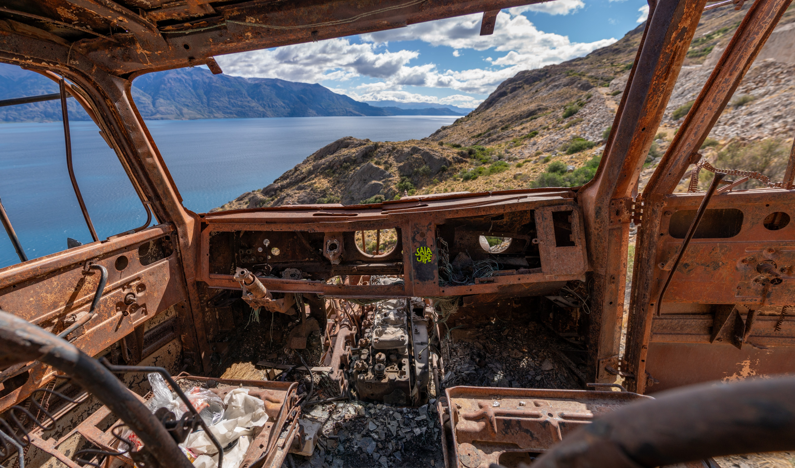 Neuer Tag, neues Glück. Heute in der Früh duscht Eva noch, sie duscht wesentlich kürzer, doch am Ende kommt auch wieder etwas Wasser aus dem Überlauf. Nach dem Frühstück erledige ich mein morgendliches Geschäft am Klo und bete, dass die Menge der Klospülung nicht den Überlauf überschreitet. Bange Sekunden… doch meine Hoffnung wird nicht erfüllt. Es geht sich nicht aus. Mein im Wasser zerstäubter Kot kommt aus dem Boden und verteilt sich über einen Quadratmeter im Bad. Großartig. Mit zwei Fetzen putze ich die Sauerei weg. Toller Tagesbeginn. Nachdem wir so spät ins Bett sind wir heute erst um 07:00 auf und bis wir wieder startbereit sind ist es 08:30. Die Vermieterin kommt und übernimmt die Wohnung und wir steuern die Tankstelle im Ort an. Wir füllen den Tank wieder randvoll und ergänzen auch die fehlenden Liter im Benzinkanister, die wir am Vortag den Motorradfahrern überlassen haben. Weiter geht es an die chilenische Grenze, denn wir werden den nächsten Teil unserer Reise wieder in Chile absolvieren. Nach etwa 45 min Fahrt erreichen wir den Argentinischen Posten, wo wir uns abmelden und beim Zoll die Autopapiere durchgesehen werden. Die Grenze in diesem Gebiet ist übrigens großteils unklar, beide Länder beanspruchen Teile der Anden und so hat auch der See, neben dem wir fahren einen chilenischen und einen argentinischen Namen, da beide Länder behaupten, dass der See zu ihrem Land gehört. Auf der Karte fehlen auch ganze Abschnitte in den Bergen, wo keine Linien gezogen sind. Nach ein paar Kilometern im Niemandsland erreichen wir die chilenische Kontrollstation. Vor der Kontrolle wird überall gewarnt. Keine frischen pflanzlichen und tierischen Produkte dürfen importiert werden. Saftige Strafen drohen bei Verstößen. Wir parken vor dem Grenzübergang und gehen in das Gebäude. Zuerst werden wieder unsere Pässe geprüft und die Einreise vermerkt. Dann müssen wir uns beim Zoll anstellen, dort wird das Auto und Versicherung überprüft und zuletzt folgt eine genauere Zoll und phytosensitive Kontrolle. Hierfür müssen wir, nachdem wir eine Deklaration digital auf Tablets unterzeichnet haben, mit dem Auto vorfahren und alles ausladen. Alle Koffer und Rücksäcke müssen wir in das Gebäude bringen und diese werden durchleuchtet. Das Auto inkl. Motorraum wird durchgechecked und von unseren Essensvorräten, die wir wohlwissend schon versucht haben so gut es geht zu reduzieren müssen wir eine Packung getrocknete Spalterbsen und Bohnen dortlassen. Löskaffee, Haferflocken, Konserven und ähnliches sind kein Problem. Frisches Obst und Gemüse hatten wir keines mehr dabei. In Summe haben wir zwar einiges an Zeit verloren, doch man muss den Beamten zu Gute halten, dass sie durchaus trotzdem freundlich waren. Alles geht gut und etwas erleichtert setzen wir unsere Fahrt fort.