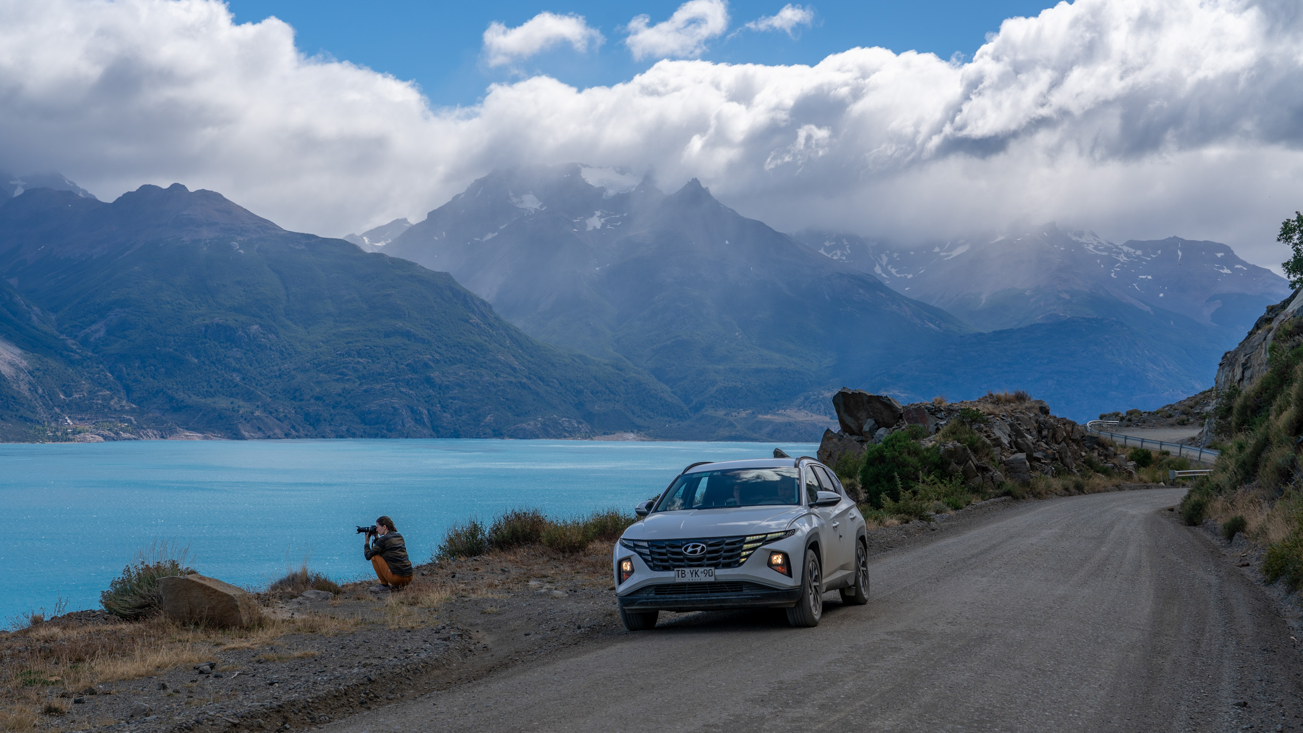 Die Straße windet sich vom Seeufer hinauf in die Berge und wir erreichen unser Ziel: Marmor Felsen und Aushöhlungen am See. Dazu biegen wir von der Hauptstraße in eine sehr steile Stichstraße zu einem Grundstück hinein, wo Kajak-Ausflüge beworben werden. Wir folgen einem blauen, alten Puch G aus Schwechat. Die Straße ist wirklich schon ein Offroadvergnügen und stellt unsere Mietauto auf die Probe. Unten erreichen wir einen kleinen Platz mit einem Häuschen und einer Menge Kajaks. Doch es stellt sich heraus, dass der See von der Armada de Chile gesperrt ist, aufgrund des Windes. Ein Kajak Ausflug ist nicht möglich derzeit. Wir plauschen kurz mit dem jungen Pärchen aus Wien-Schwechat, die etwa für ein Jahr in Südamerika herumfahren und derzeit etwa Halbzeit hatten.