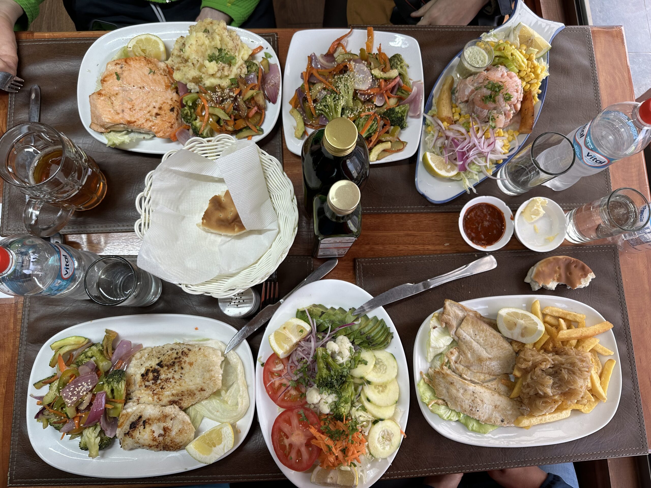 Nachdem es schon 16:00 ist und wir ziemlich hungrig sind, fahren wir wieder zurück auf die Hauptstraße – sehr froh und begeistert vom Allradantrieb – und fahren in die nächstgelegene Stadt, Puerto Rio Tranquilo. Generell ist auf der Nordseite des See’s mehr los, als im Süden, muss man sagen. Wir erreichen ein kleines Dörfchen, welches wohl rein von den Marmorfelsen lebt und kehren in einem leichten Nieselregen in einem Restaurant ein. Wir bestellen alle Fisch, in diversen Ausprägungen und sind absolut positiv überrascht von den Gerichten, die wir vorgesetzt bekommen. Vielleicht sollten wir doch öfters essen gehen. Doch es hat auch seinen Preis, wir zahlen zu 4. etwas über 100€.