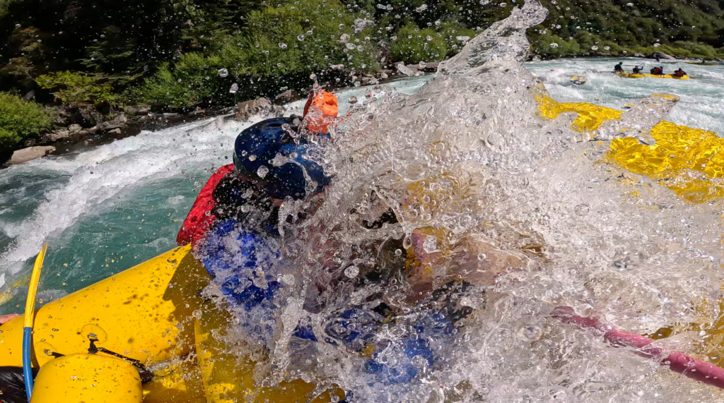 Zwischendurch sind immer wieder ruhigere Strecken, wo keine Gefälle überwunden werden und/oder keine Steine im Fluss sind und man hat so etwas Zeit sich wieder zu sammeln. Bei den Stromschnellen gibt uns Jose lautstark die Befehle zum Paddeln, um’s überleben“ Paddeln oder Festhalten bzw. in die Mitte des Rafts ducken. Das Ganze funktioniert ganz gut, doch bei einer Stromschnelle sind wir wohl zu langsam und geraten in einen Rücklauf. Es rotiert uns um die Achse und wir fahren rückwärts in die nächste Welle. Aufgrund der geringen Geschwindigkeit dreht uns die Welle fast über, doch es geht grad nochmal gut.