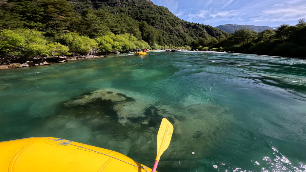 Danach fahren wir wieder zur Unterkunft und wärmen uns in der Sonne auf der Terrasse, ehe wir uns um Einkaufen und Essen kümmern. Wir spazieren zum vielversprechendsten Supermarkt und verzetteln uns dabei aber etwas, sodass wir dann zu 3. im Eiltempo kochen und essen, denn wir haben nurmehr eine halbe Stunde bis zum Treffpunkt. Es geht sich aber irgendwie aus und wir schaffen es rechtzeitig zum Rafting-Büro, wo uns und unsere Paddelkollegen ein Kleinbus abholt. Mit diesem fahren wir etwa 20 Minuten in den Westen zum Stützpunkt der „Patagonia Elements“, wo wir unsere Neoprenanzüge, Spritzjacken, Schuhe, Helme und Schwimmwesten erhalten. Danach geht es nochmal 10 Minuten mit dem Bus zum Einstiegsort, wo wir unsere zwei Safety Paddler und den 2. Raft Guide treffen. Die Rafts sind schon vorbereitet, wir sind in Summe 9 Leute und werden aufgeteilt auf zwei Rafts. Unser chilenischer, junger Guide ist sehr sympathisch und erklärt alles sehr geduldig auf Spanisch und Englisch. Lisi, Eva und ich sind gemeinsam mit zwei älteren Chilenen auf einem Raft. Wir starten auf dem Rio Azul, denn das ist die einzige Möglichkeit zu oberen Abschnitt des Futaleufu’s zu kommen. Der Beginn is eher zäh, denn der Rio Azul hat kaum Wasser und wir müssen insgesamt 3x aussteigen und zu Fuß gehen, damit unser Guide Jose alleine über die steinigen Stellen kommt. Immer wieder bleiben wir hängen und kommen kaum vorwärts. Dann erreichen wir endlich die Mündung in den Futaleufu. Das ist ein echt gewaltiger Fluss, der zwar derzeit verhältnismäßig wenig Wasser führt, dennoch auf eine beträchtliche Summe Wasser kommt.