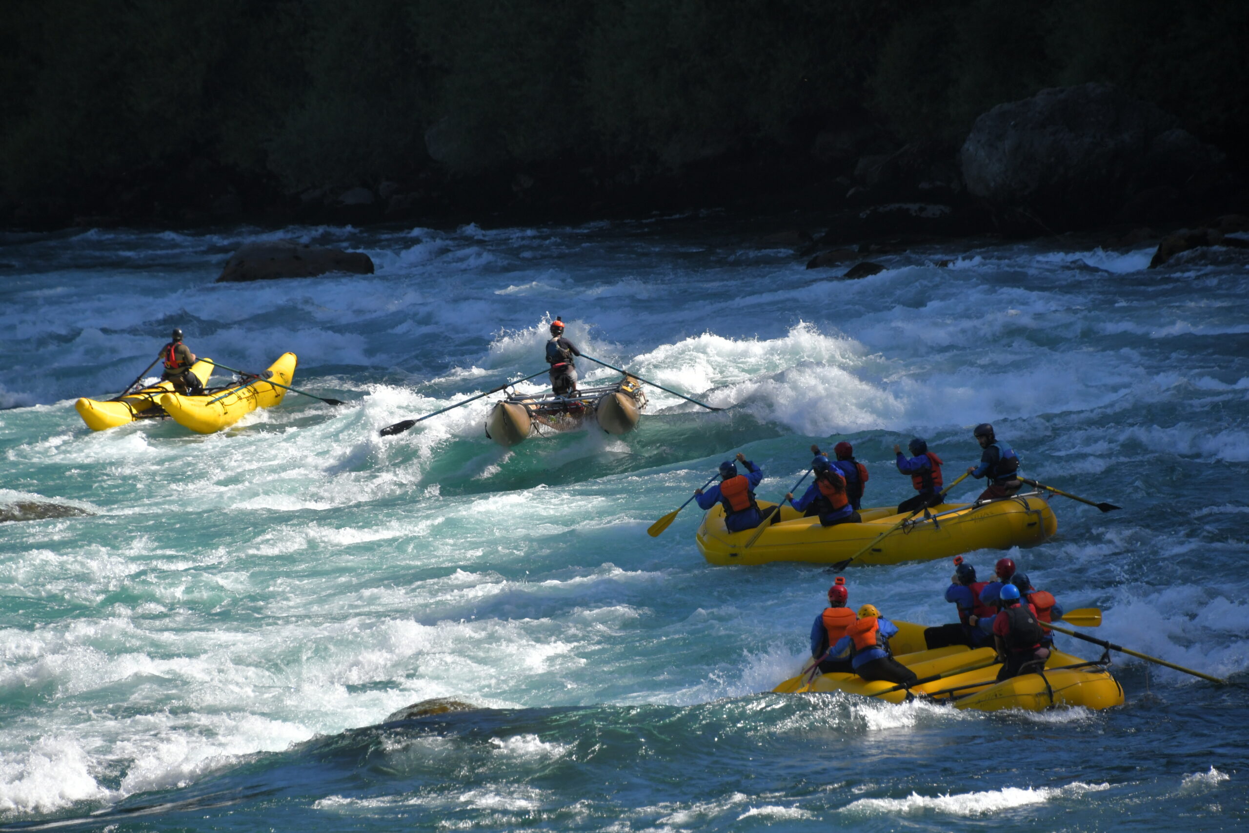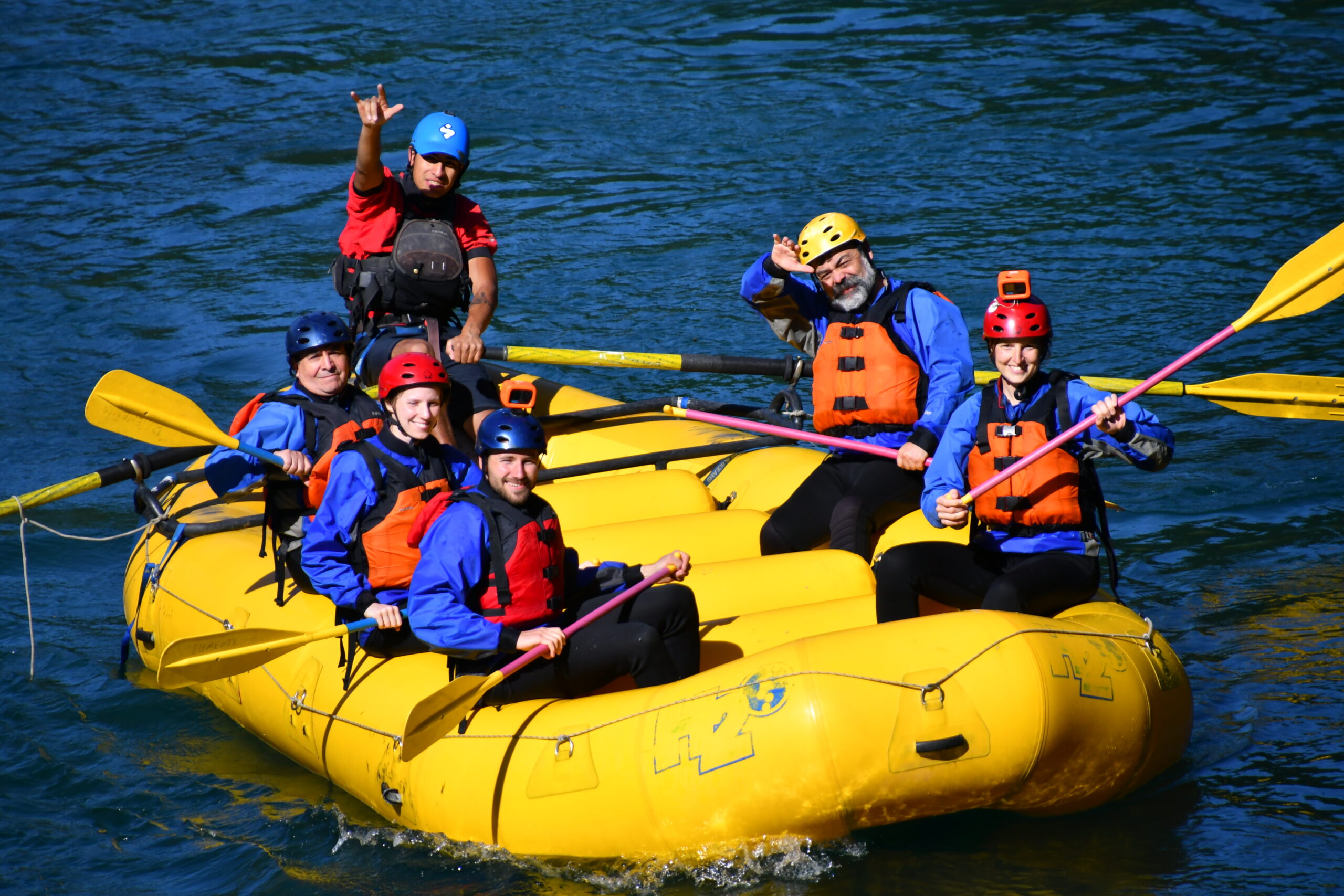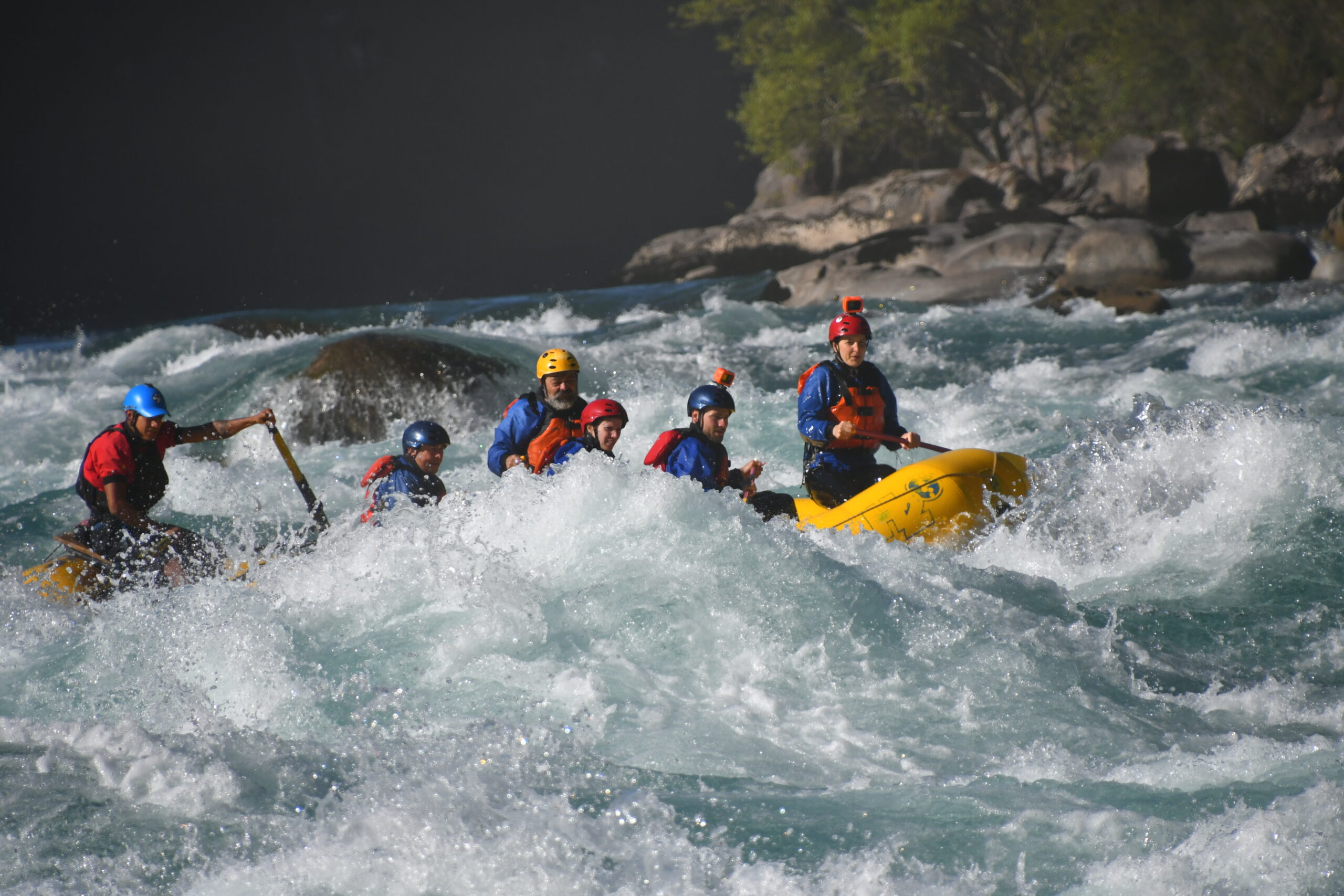 Während den ersten ruhigen Metern erhalten wir noch eine sehr umfangreiche Einschulung und dann geht es auch schon direkt los. Die beiden Safety-Paddler sind alleine auf einem Gefährt, das eine Mischung aus Raft und Katamaran ist, unterwegs und fahren voraus um Leute aus dem Wasser zu fischen, sollten wir kentern.