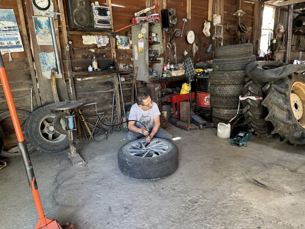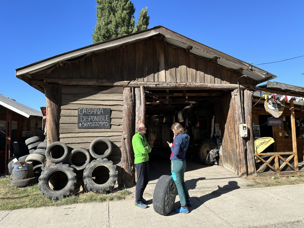 Wir schlafen heute wohl das erste Mal auf dieser Reise aus, denn unsere Rafting-Tour startet erst um 13:00 und wir haben keinerlei andere Verpflichtung. In der Nacht hat es wieder auf 5° abgekühlt und die nicht isolierte Holzhütte ist innen auch sehr kalt. Wir spazieren um 09:00 zwei Häuserblöcke weiter und unterschreiben und bezahlen unsere anstehende Rafting-Tour (85€ pro Person). Im Anschluss fahren wir mit dem Auto zur Tankstelle tanken und stoppen bei einer Reifen-Werkstätte. Doch der Besitzer hat nur ein Schild hinterlassen, dass er für Einkäufe unterwegs ist und erst heute Montag wieder zurückkehrt. Wir fahren zu einer alternativen Werkstätte, die wir auf Google Maps finden und bekommen prompt von einem kleinen Männlein einen Flicken in den Reifen eingesetzt für 10€.