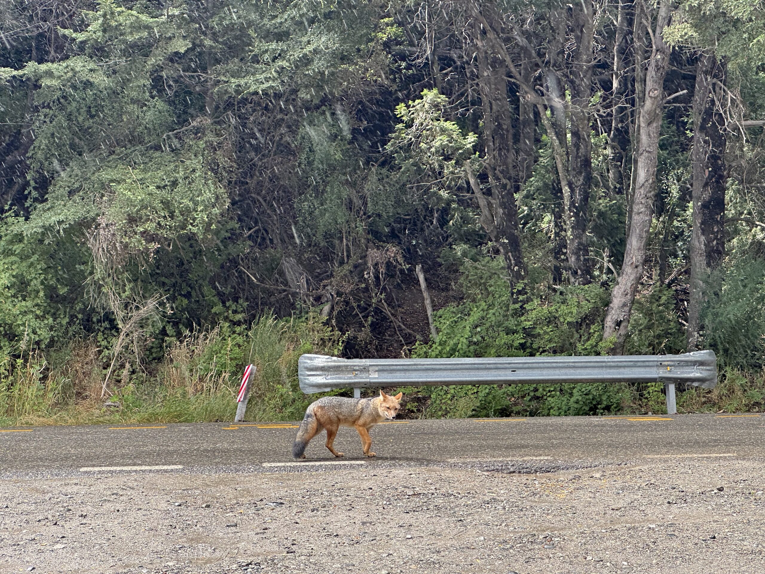 Dann beschließen Klaus, Eva und ich eine kurze Wanderung in der Nähe aufzusuchen. Wir fahren etwa 30 Minuten am Nahuel Huapi (See) entlang und erreichen dann den Ausgangspunkt. Doch dieser ist abgesperrt und ein Schild steht dort, das auf die Gefahr durch Wetterlage verweist. Wir sind auf jeden Fall wieder einmal ziemlich enttäuscht bzw. erzürnt über die Bevormundung. Wir fahren noch eine Runde weiter und passieren ein paar Aussichtspunkte. Neben einem Hotel treffen wir auf einen sehr zutraulichen Fuchs und warten dort kurz im Auto, ob der Regen etwas besser wird um dann potentiell die Absperrung zu ignorieren und trotzdem Wandern zu gehen. Doch es spritzt auch nachhaltig zu viel Regen her, daher beschließen wir stattdessen wieder heimzufahren.