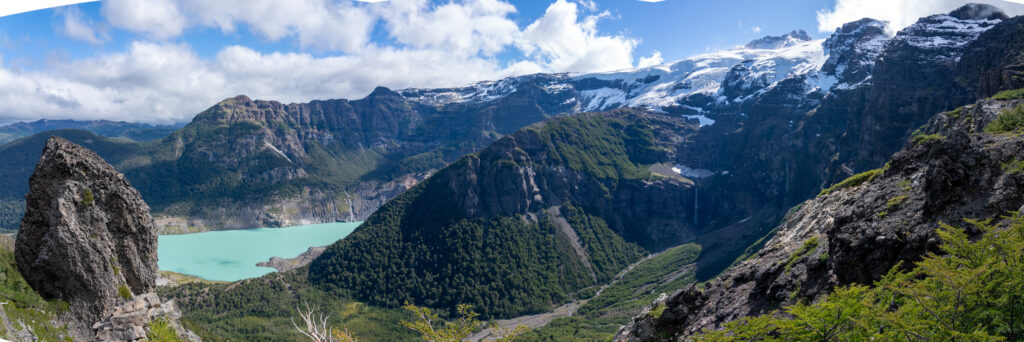 Als wir dieses genug aufgesogen haben und auch keine Hoffnung haben, dass die am Berg hängenden Wolken sich bald verflüchtigen würden, schlagen wir wieder den Rückweg ein. Kurz bevor wir zurück beim Parkplatz sind gesellt sich eine ~25 jährige Belgierin zu uns dazu, die alleine unterwegs ist und auf dem Refugio Otto Meiling übernachtet hatte. Lisbeth ist eine Krankenschwester, die ihren Job gekündigt hat und nun seit bereits 4 Monaten durch Südamerika reist. Davor durchquerte sie Europa (und auch Graz) mit dem Fahrrad über 2 Monate. Zurück beim Auto nehmen wir sie mit zum Nahe gelegenen Restaurant am Talschluss des Nachbartals, von dem das wir zuvor erwandert haben. Dort gibt es einen großen Parkplatz und noch zwei potentielle Wanderungen. Eva und ich starten dort noch die Wanderung auf die rechte Talflanke, auf welcher man sich genau zwischen den zwei Tälern befindet. Klaus, Lisi und Lisbeth bleiben inzwischen im Restaurant und kosten sich durch die verschiedenen Kuchen. Der Anstieg ist sehr knackig auf einem sehr wenig begangenen Weg, sehr steil und zeitweise leicht ausgesetzt. Durchaus eine Herausforderung, doch wir schaffen es in 45 Min nach oben und sind überwältigt von dem Ausblick. Wie erwartet überblicken wir wirklich beide Täler, als auch den Lago Manso, welcher genährt durch den Gletscher eine tolle, grünliche Farbe hat.