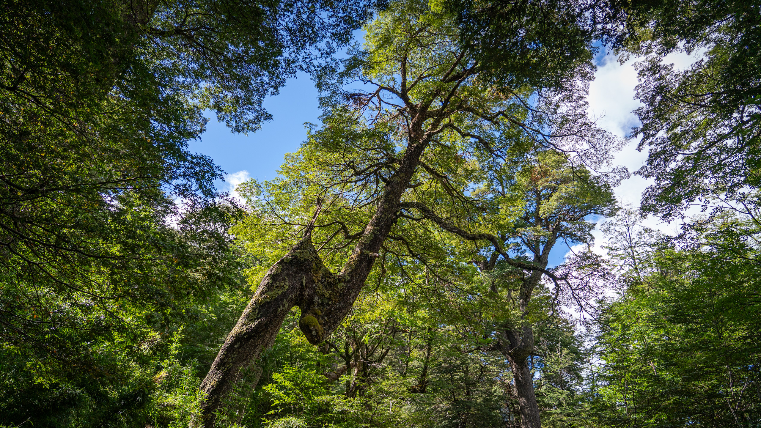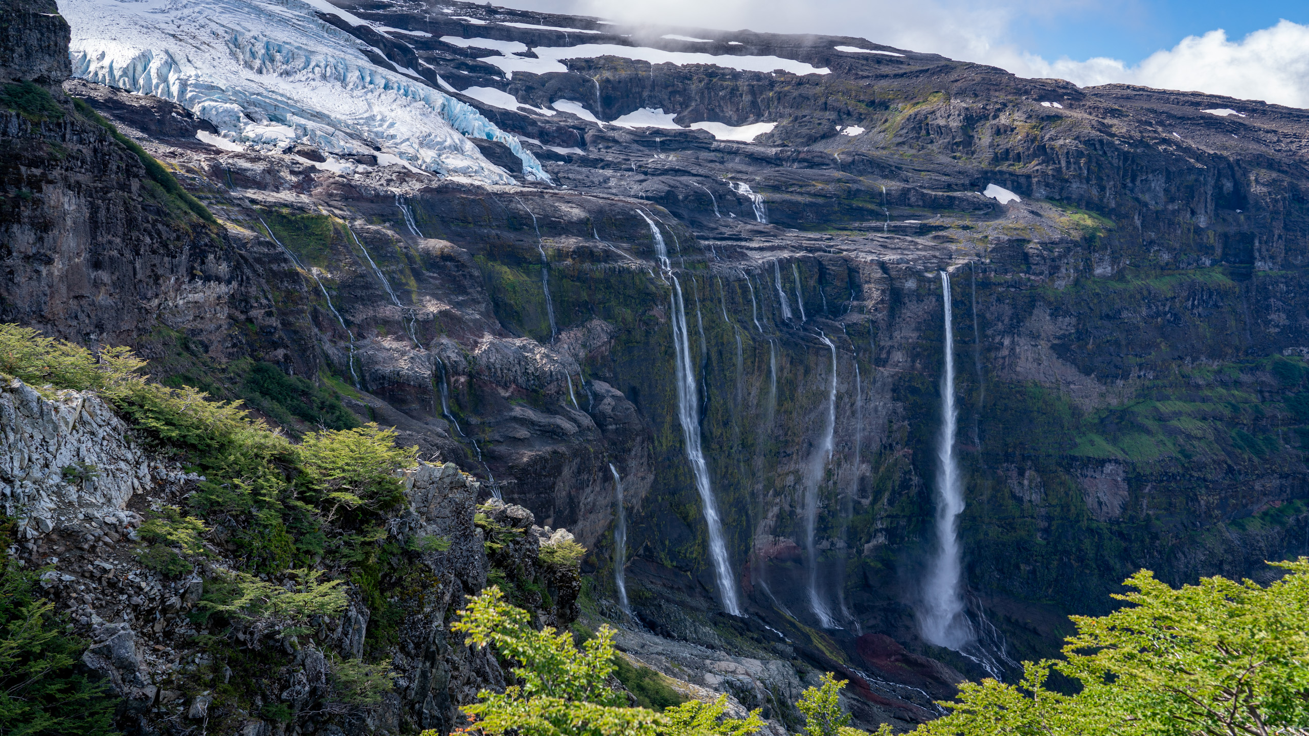 Wir haben einen langen Tag vor uns, entsprechend läutet der Wecker schon um 05:30 mit einer geplanten Abfahrt um 06:30. Wir frühstücken rasch und haben bereits am Vortag unsere Wandersachen gepackt. Danach fahren wir mit dem Auto durch Bariloche durch Richtung Süden. Es ist noch dunkel, als wir nach 45 Minuten die asphaltierte Straße hinter uns lassen und in einen Teil des Nahuel Huapi Nationalpark einbiegen für den man Eintritt zahlen müsste. Doch beim Checkpoint am Beginn der Schotterstraße ist niemand, es ist wohl noch zu früh. Also zahlen wir keinen Eintritt und fahren einfach ein. Die Straße ist großteils in schlechtem Zustand und so brauchen wir für die 50 verbleibenden Kilometer mehr als eine Stunde. Die Straße ist auch zu gewissen Uhrzeiten wechselnd eine Einbahnstraße zur Ein- oder Ausfahrt. Es nieselt immer wieder leicht und Wolken ziehen umher. Dennoch beginnt es zu dämmern und wir erreichen den Ausgangspunkt unserer Wanderung bei Helligkeit. In der Ferne sehen wir bereits die Felswände über denen sich Gletscher befinden und das Schmelzwasser über Wasserfälle hinunter stürzt. Die Wolken- und Lichtstimmung lässt auch Hoffnung offen, dass es eventuell noch schön werden könnte. Als wir aus dem Auto aussteigen hören wir in der Ferne ein Donnern und wir sehen, wie sich Eis und Wassermassen in einer Art Lawine über eine Felsstufe hinunter ergießen. Voller Vorfreude marschieren wir los. Großteils geht der Weg auf einer Forststraße. Wir überqueren einen kleinen Fluss und wandern in einem wunderschönen, alten Südbuchenwald in einem Tal an das Talende. Nach etwa 2h haben wir den Talschluss erreicht und treten wieder aus dem Wald heraus. Vor uns erhebt sich eine senkrechte Felswand fast 500 Meter hoch über diese viele kleine und größere Wasserfälle hinunterstürzen. An einem kleinen Eck sieht man auch den darüber liegenden Gletscher. Die Sonne blitzt immer wieder leicht durch und beleuchtet zumindest die Hälfte des Tals. Es ist relativ kühl und ein leichter Wind kommt immer wieder, gepaart mit ein paar Wasserspritzern – unklar ob aus den Wolken, oder aus den Wasserfällen. Die Dimensionen und das Panorama ist atemberaubend.