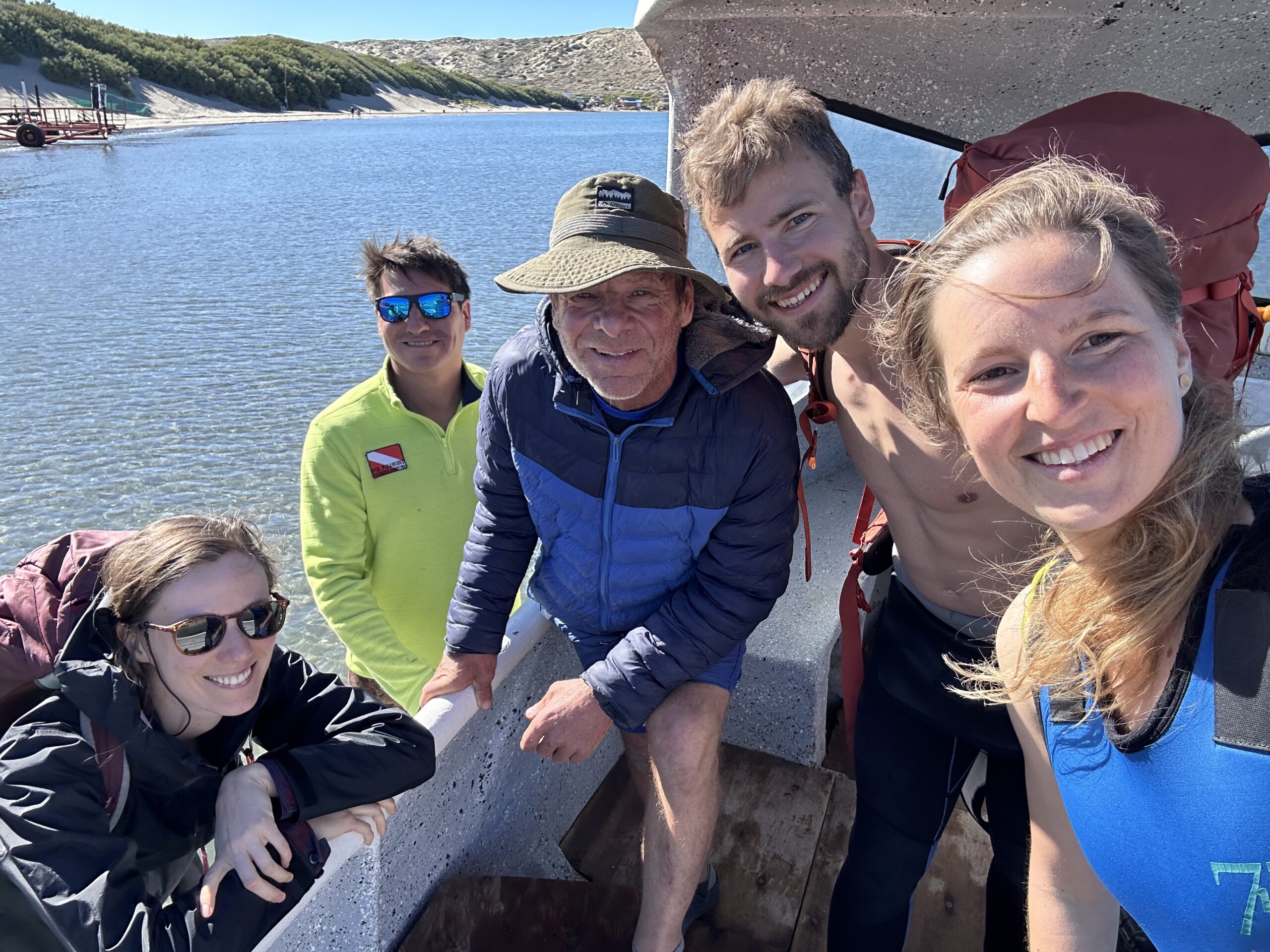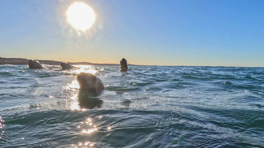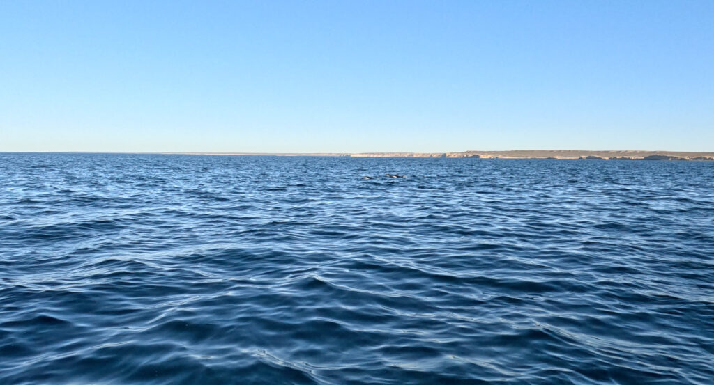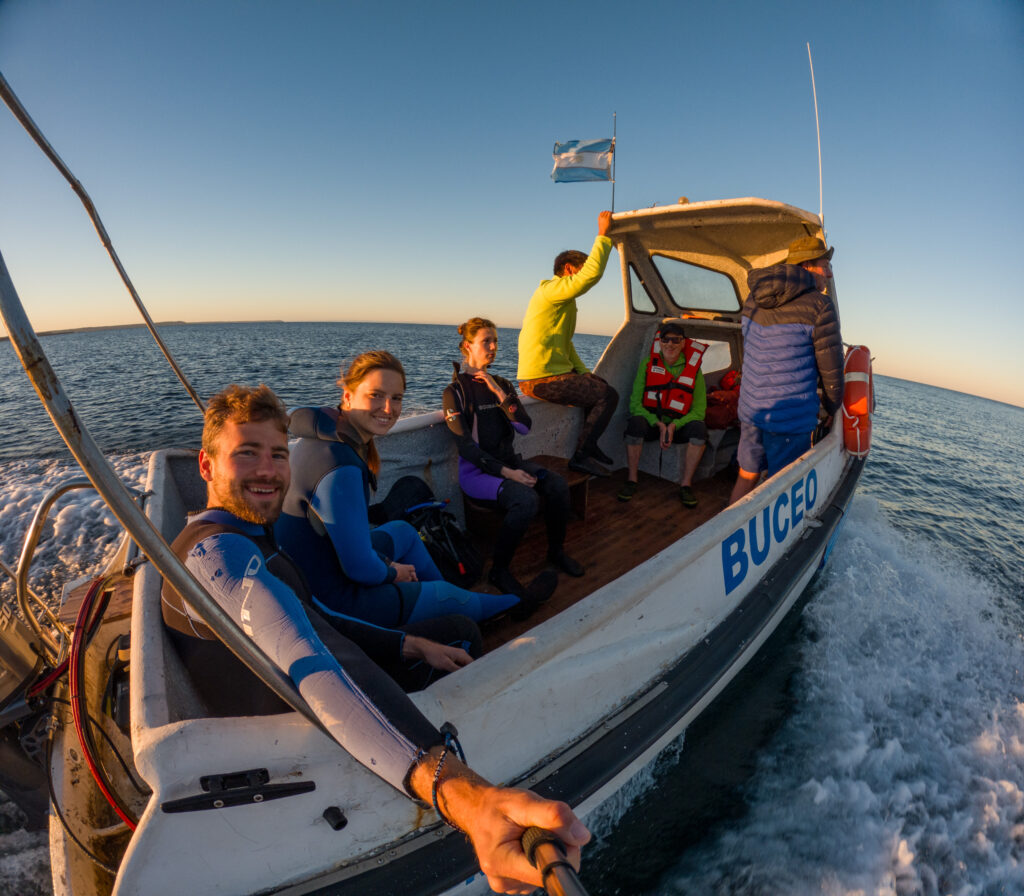 Um 05:45 klingelt der Wecker. Wieder einmal eine zache Partie. Doch die Erwartungen für heute sind groß. Wir richten uns her, erledigen Teile der Morgenroutine und fahren dann zu 4. mit dem Auto zu „Patagonian Divers“ ein paar hundert Meter entfernt im Ort. Dort bekommt Klaus eine Schwimmweste und wir anderen 7mm Neopren, mit Haube, Schuhen, Flossen und Brille mit Schnorchel. Es ist ziemlich kühl und die Sonne ist um 07:00 noch nicht aufgegangen. Als wir dann unser Equipment ausgefasst haben, spazieren wir hinunter zum Strand, wo unser Kapitän Juan und sein Lehrling, Martin, bereits das kleine Boot mit einem Traktor und Anhänger ins Wasser gelassen haben und uns erwarten. Wir steigen ein und Juan heißt uns auf Englisch Willkommen. Naty hat uns am Vortag bereits von ihm erzählt. Er macht das seit 15 Jahren, davor war er Fischer und ist wahrlich ein Urgestein in Puerto Piramides. Das steht ihm auch ins Gesicht geschrieben. Nachdem seine Mutter aber Amerikanerin war und er in der Kindheit wohl auch eine zeitlang in den USA war, konnte er durchaus gut Englisch. In der aufgehenden Sonne lassen wir die Bucht mit dem seichten, schwarzen Strand von Puerto Piramides hinter uns und fahren für etwa 40 Minuten entlang der Küste Richtung Westen.