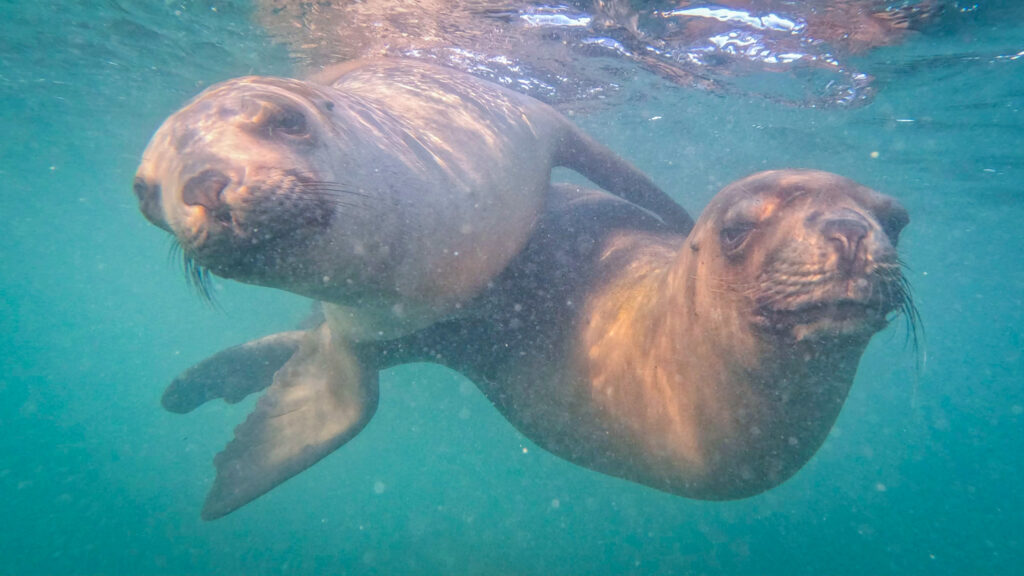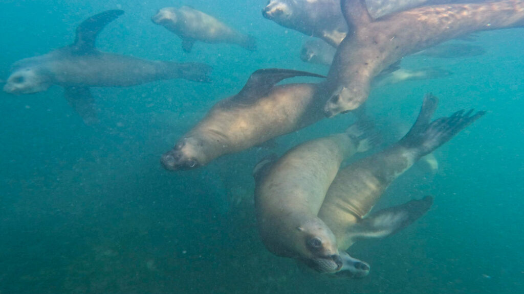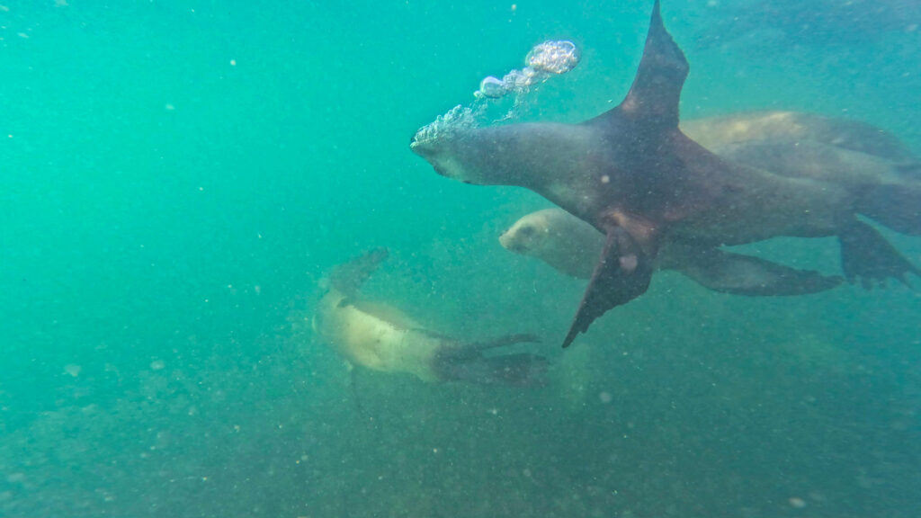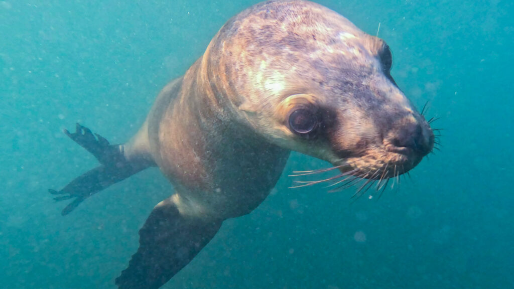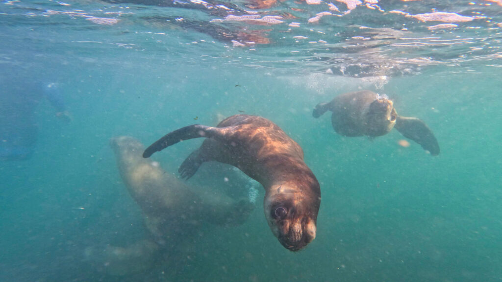 So viele Seelöwen auf diese Entfernung mit ihrer grazilen, dreidimensionalen Fortbewegung zu erleben ist ein absolutes Highlight und man kann sich vorstellen, wie schnell so eine Dreiviertelstunde im Wasser vergehen kann. Nach dieser Zeit haben wir auch schon die ein oder andere Robbe kennen gelernt und erkennen sie schon auseinander. Es ist merkbar, wie nicht nur die Körper und Gesichter unterschiedlich sind, sondern auch die Charaktereigenschaften. Manche sind ruhiger, andere verspielter und frecher. Auch die Bewegung im Wasser unterscheidet sich zwischen den verschiedenen Charaktern.