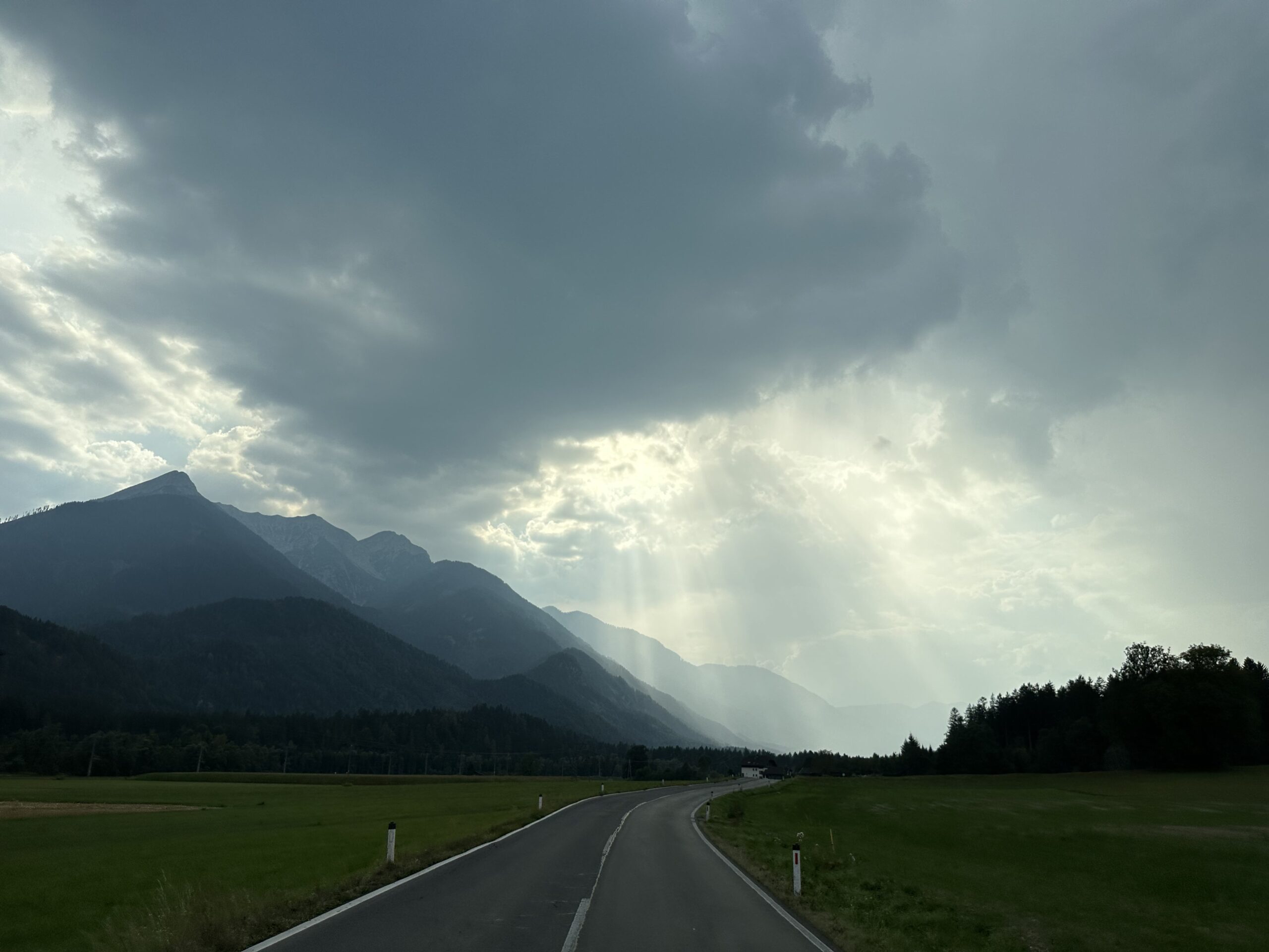 Auch füllen wir alle 3 17L Wasserkanister auf. Mit der Klimaanlage auf Vollgas setzen wir mit Halbgas die Fahrt fort. Etwas erschöpft von den letzten Tagen dauert es abermals nicht lange, ehe wir schon wieder stoppen: ein Kaffee beim MCi in Völkermarkt muss sein. Danach geht’s dann ereignislos durch Kärnten nach Osttirol mit beginnendem Blick auf die Dolomiten. Die Luft ist extrem feucht, man sieht gar nicht weit und stellenweise dürfte wohl auch Rauch von einem Waldbrand in der Luft hängen. Immer wieder tröpfelt oder schüttet es.