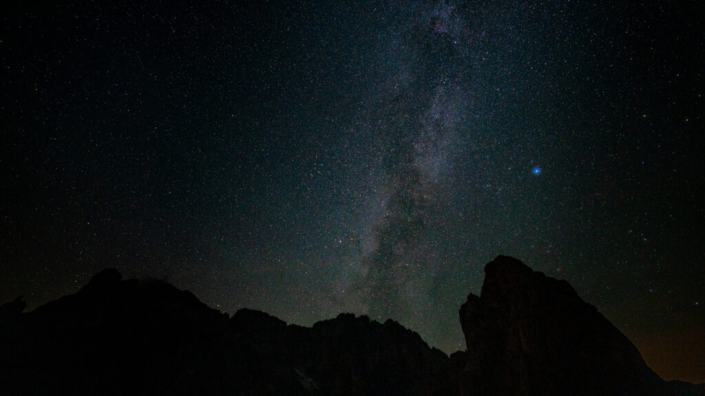 Der heutige Kalendertag beginnt sehr zeitig, wie es in einer Zeltnacht durchaus so üblich ist. Der Regen vom Vorabend hat irgendwann aufgehört und gegen 01:30 sind wir beide wach und beschließen, uns kurz draußen ein Bild von der Lage zu machen. Unser Zelt hat den Regen und Wind bestens überstanden, die Wiese war natürlich entsprechend nass. Es sind keine Wolken mehr da und wir haben einen klaren Nachthimmel über uns. Dennoch ist die Fernsicht aufgrund der hohen Luftfeuchte etwas limitiert. Nichtsdestotrotz ist der Sternenhimmel deutlich beeindruckender als in der Stadt zuhause und die Milchstraße ist gut erkennbar. Auch sehen wir binnen kurzer Zeit gleich zwei Sternschnuppen. Wir versuchen das mit ein paar Bildern festzuhalten, ehe wir uns wieder in die warmen Schlafsäcke kuscheln und versuchen noch ein paar Schlafstunden zu sammeln.