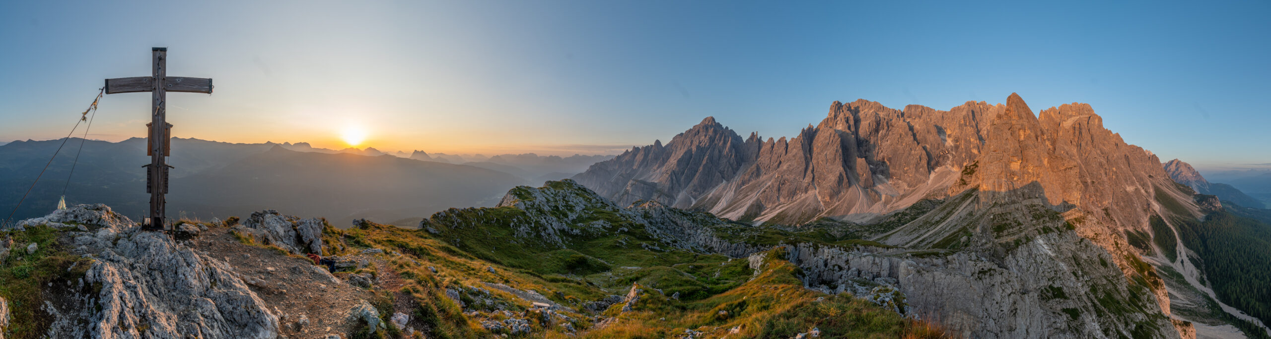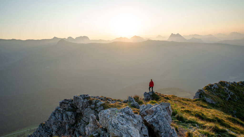 Die Temperatur wird wohl so bei oder etwas unter 10° sein. Im Zelt mit langem Gewand und Schlafsack eigentlich sehr passend. Wir können nochmals gut einschlafen und so weckt uns der Wecker um 05:40. Sonnenaufgang ist um 06:20 und wir wollen bereits zuvor unser Zelt abbauen und nochmals die 70 Höhenmeter zum Gipfen hinaufsteigen und unbemerkt bleiben, denn geplantes, wildes Zelten ist in Südtirol generell verboten. Wir beuteln unser klatschnasses Zelt aus und packen alles ein. Bei dem kurzen Anstieg zum Gipfel zurück rauf wird uns auch schon gleich ziemlich warm, wenn auch unsere Kreisläufe mit der Uhrzeit, Gewicht und Belastung sich eher anfühlen wie ein alter, nicht ganz rund laufender Dieselgenerator. Oben angekommen ist der Himmel schon in ein Morgenlicht getaucht und die Sonne kommt schon bald zum Vorschein. Einmal mehr gänzlich alleine genießen wir die Natur und beobachten das Schauspiel. Zähne putzen und Frühstück wird auch gleich erledigt.