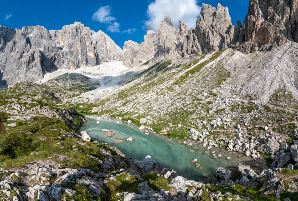 Nachdem wir die Eindrücke zur Genüge aufgesaugt haben beginnen wir mit dem Abstieg. Wir wählen eine Variante, die über einen See zurück zum Rifugio Berti führt. Doch zuerst durchsteigen wir einige alte Schützengräben und queren einen steilen Geröllhang, bei dem wir durch einige ausgewaschene Furchen steigen müssen.