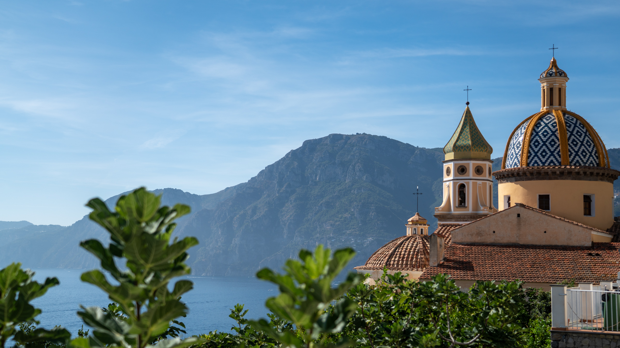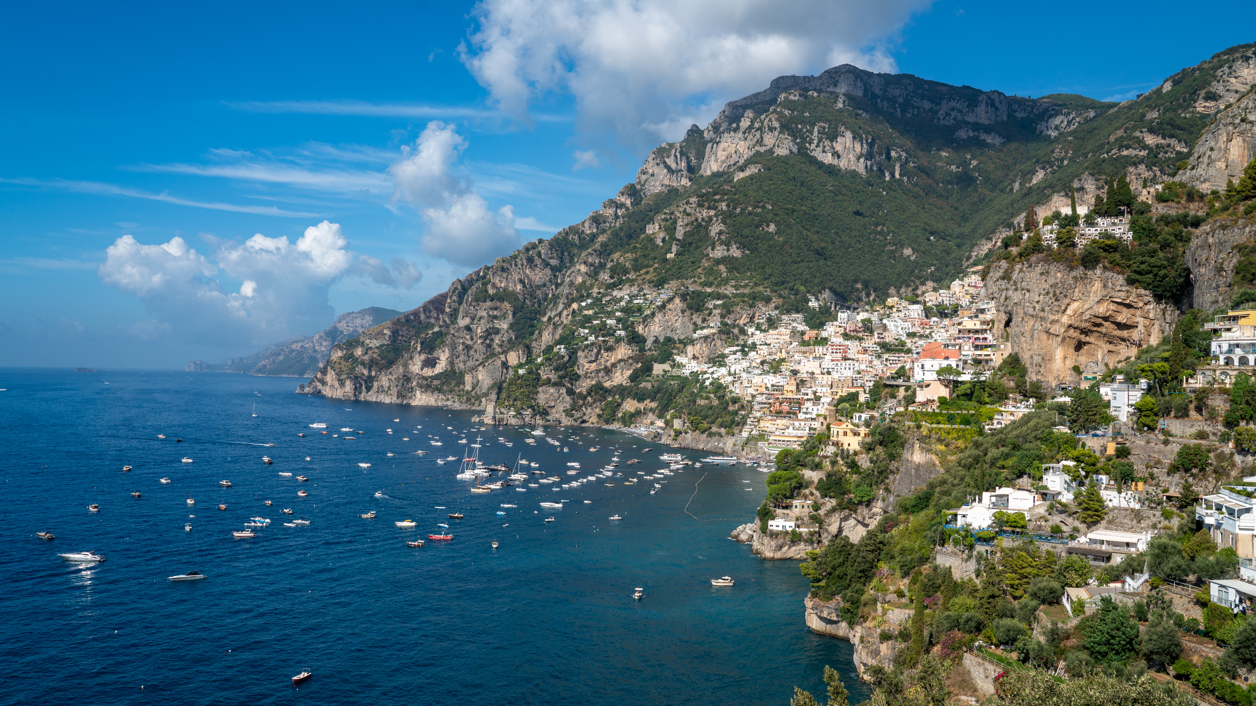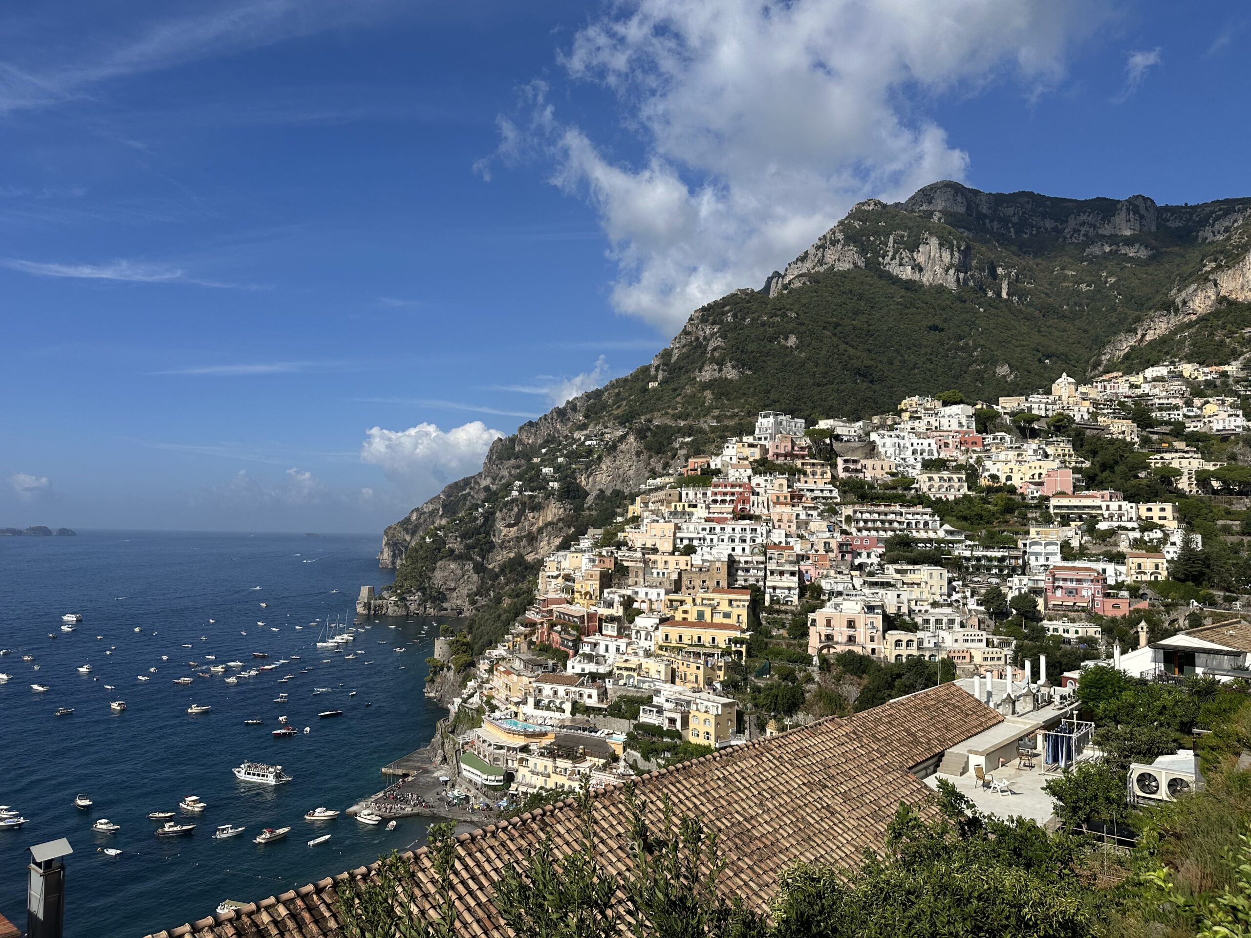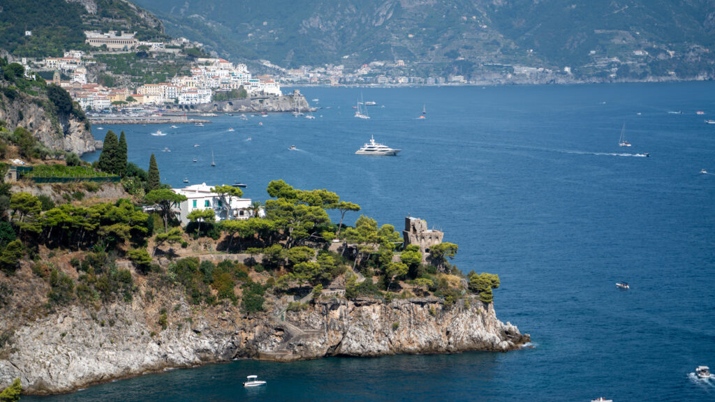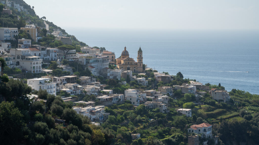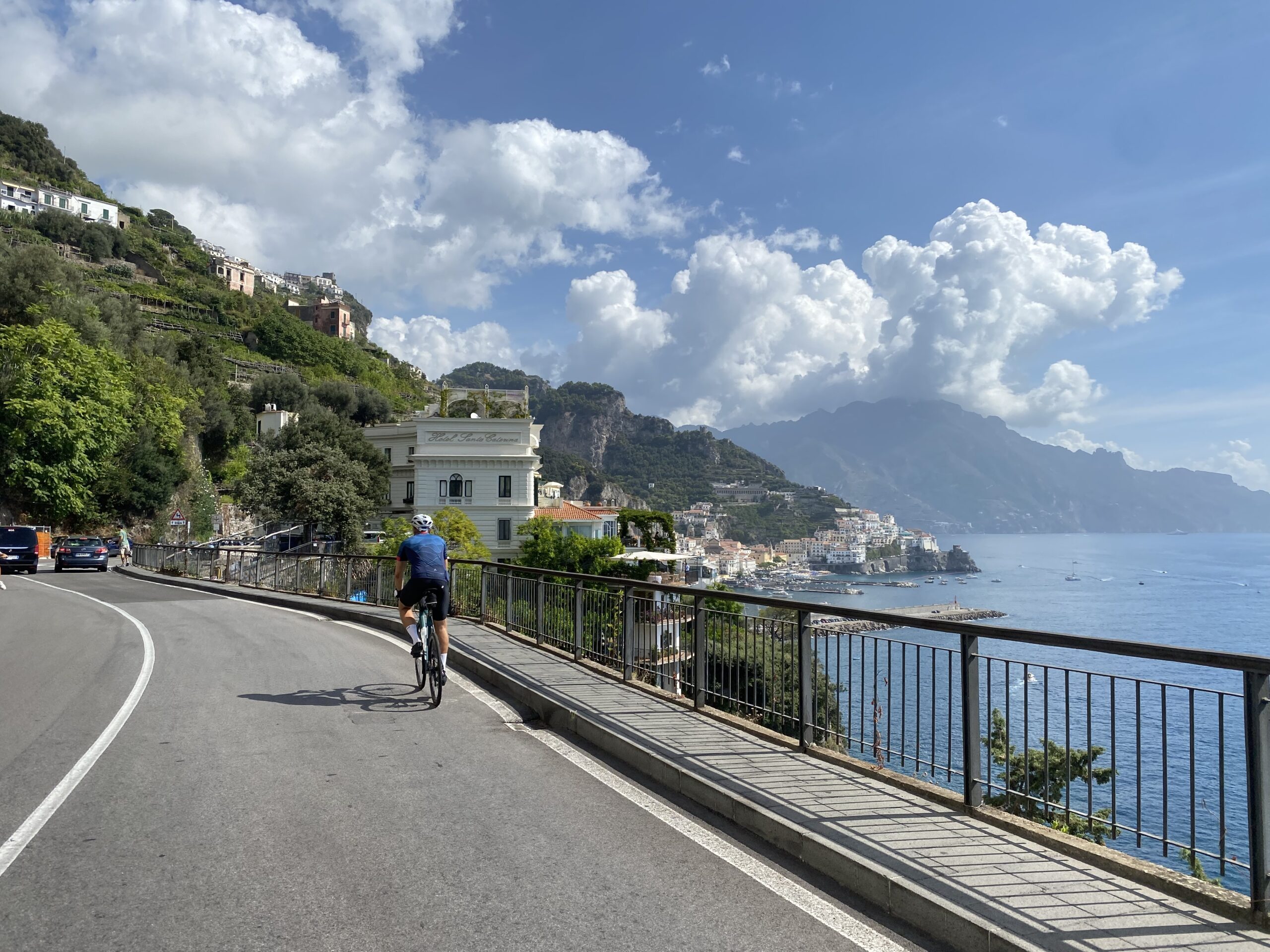 Abseits der einen Straße gibt es nicht viele Möglichkeiten wohin zu kommen. Entlang der gesamten Küste sind auch viele Boote im Wasser und in den steilsten Gebieten sind kleine Hotels, zum Teil mit Pools und Versorgungsseilbahn zur Straße. Die nächste Stadt, Praiano, folgt einige Kilometer später. Eine weitere Ansammlung an Häusern. Die Parkplatz Situation ist eher katastrophal. Roller überall und die Autos stehen zum Großteil entlang der einzigen Straße an die Seite gequetscht. Wir strampeln weiter und kommen eigentlich sehr flott voran. Schon bald erreichen wir die Stadt Amalfi, welche der Küste ihren Namen gibt und ebenso auch Hotspot aller touristischen Aktivitäten zu sein scheint. Am Meer liegen zwei Kreuzfahrtsschiffe, unzählige kleinere Schiffe ankern in der Bucht und es gibt sogar einen kleinen Parkplatz für Busse und Taxis. Folglich schieben sich auch die Massen.