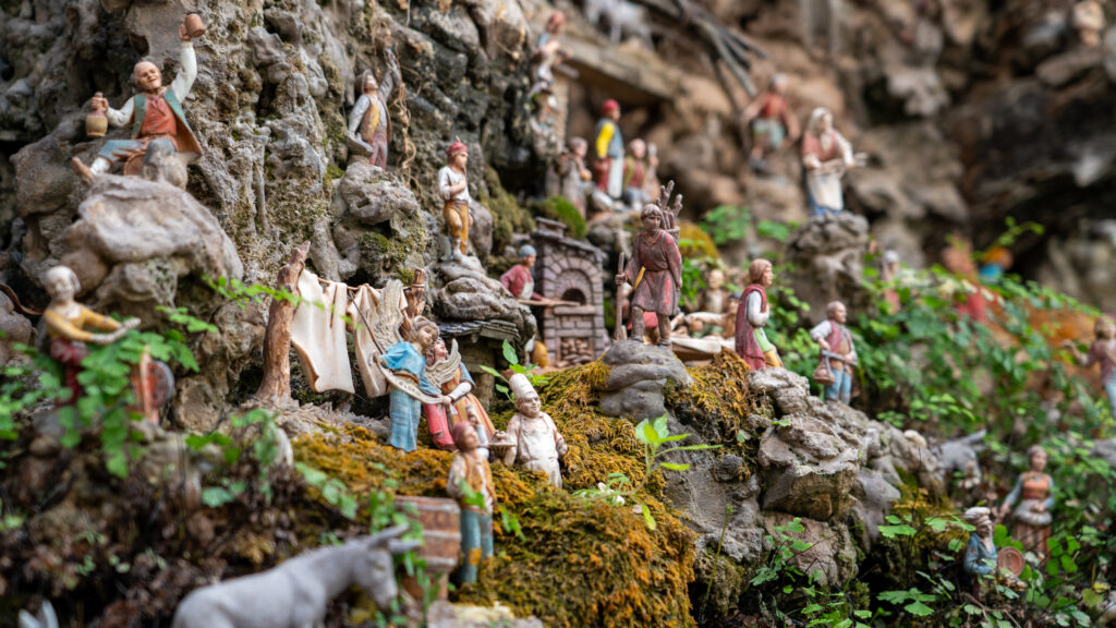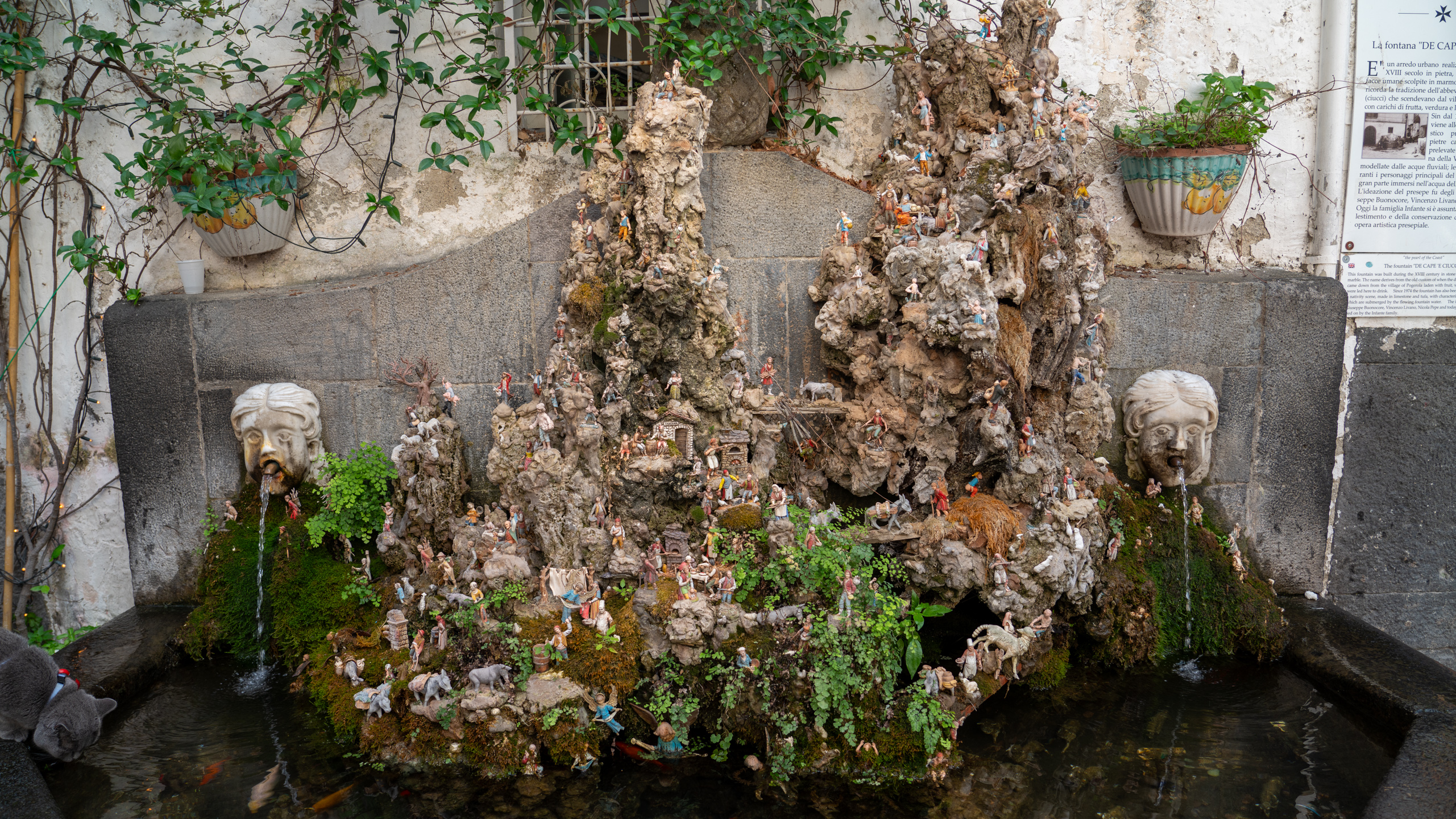 Wir essen und rasten dann ein wenig im Schatten, ehe ich bemerke, dass ich ein Loch im Hinterreifen habe. Mein Rad ist hinten mit Dichtmilch angespritzt, allerdings scheint diese das Loch auch so gut wie verschlossen zu haben, aber es ist nun etwas zu wenig Luft im Rad. Wir fahren einmal um Ravello herum zu einer Tankstelle in der Hoffnung eine Möglichkeit zum Aufblasen zu finden, doch leider Fehlanzeige. Also geht’s mit etwas wenig Lust wieder zurück runter nach Amalfi. Dort werfen wir uns in die Menge und spazieren zu Fuß mit unseren Rädern durch die wohl einzige Gasse von Amalfi. Gefühlt befinden sich hier alle Touristen mindestens eines ganzen Kreuzfahrtsschiffs und wir, tropfend, mitten drin. Ich hab recht schnell die Schnautze voll, es sind mir einfach zu viele Menschen. Doch wir suchen noch einen kleinen Brunnen, den Hanna bei ihrer Recherche mal entdeckt hat. Wir sind natürlich prompt vorbei gelaufen, so unscheinbar ist er in einer Seitengasse. Viele kleine Figuren sind aufgestellt, die unterschiedliche Geschichten erzählen und Situationen darstellen.