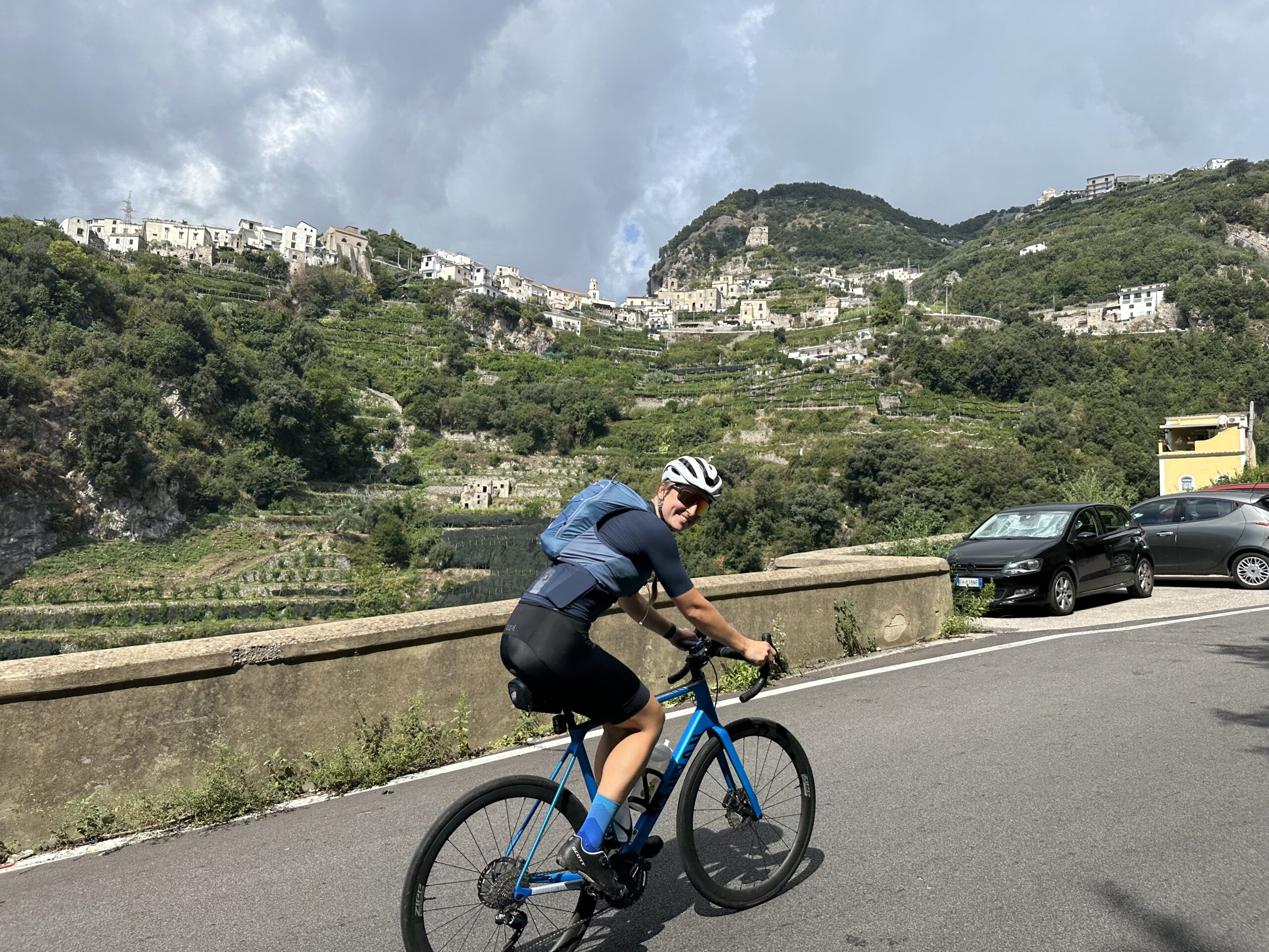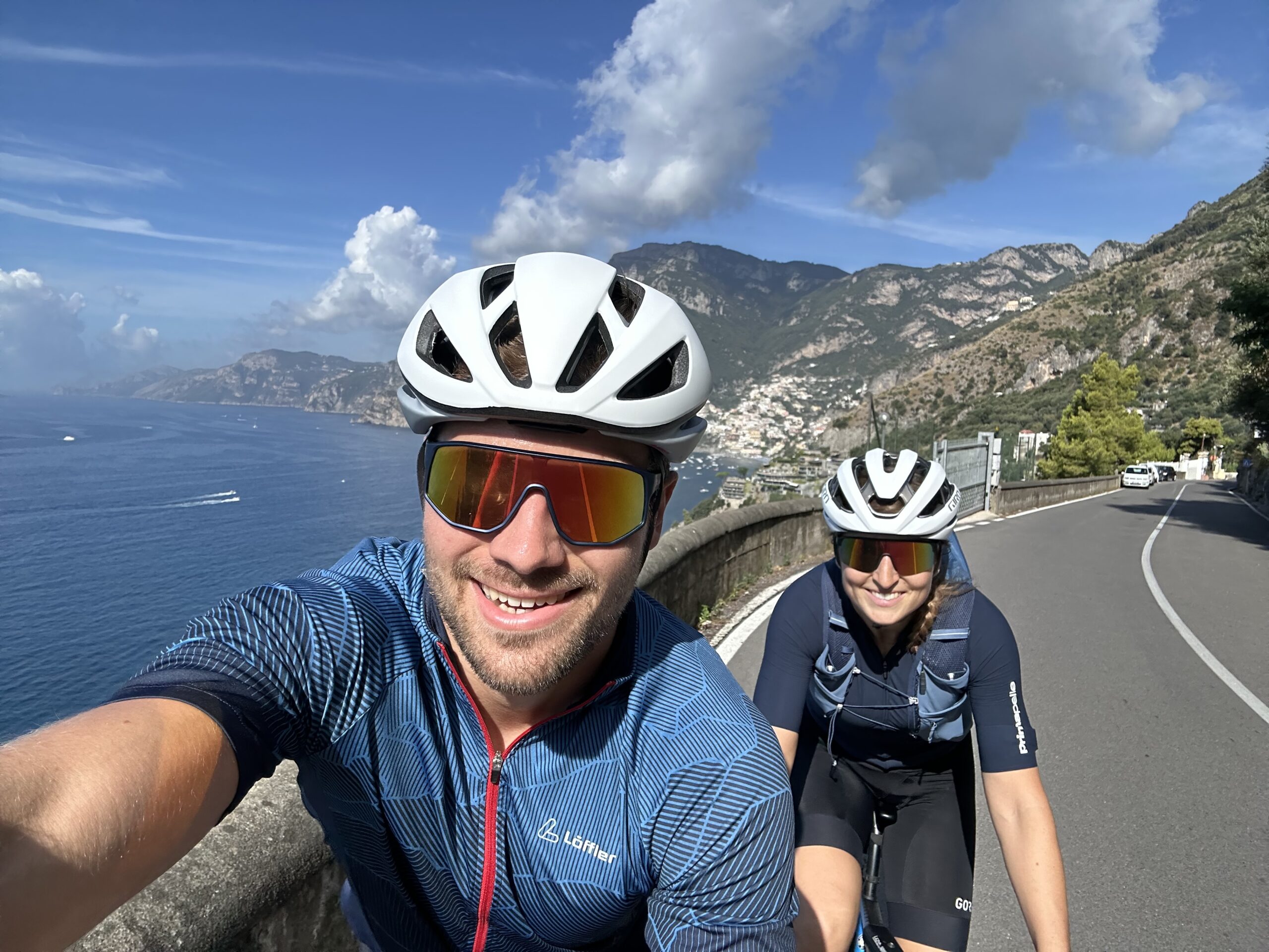 Heute stehen wir wieder einmal mit Wecker auf (06:30), denn wir haben noch viel vor. Gestern haben wir schon einiges hergerichtet und im Detail geplant, so kommen wir recht zügig los, obwohl wir die Rennräder noch aus unserem Gestell im Kofferraum auspacken und zusammenschrauben müssen. Um 8:00 rollen wir aus dem Campingplatz und starten gleich mit einem ordentlichen Anstieg in den Tag, denn wir wählten natürlich die ambitionierte Route mit extra Höhenmetern. Achja, unser Plan für heute ist es mit den Rennrädern die gesamte Amalfiküste zu erkunden. Dafür müssen wir zuerst auf die Südseite der Sorrenthalbinsel und hierfür gibt es eine überschaubare Auswahl an Optionen. Also strampeln wir uns in Serpentinen warm und erklimmen die Mitte der Halbinsel (auf der Nord-Südachse). Obwohl es noch früh ist sind wir oben schon klatschnass und die Sonnenbrille wurde zur Taucherbrille. Aber gut, weiter geht’s. Wir rollen die erkämpften Höhenmeter in Serpentinen nun in der Morgensonne hinab und genießen die ersten Ausblicke auf die Steilküste vor uns. Die gesamte Küste ist nur durch eine Straße verbunden und die Region ist aufgrund seiner idyllisch in die grünen Steilhänge gebauten Städtchen äußerst touristisch. Für Camper ist die Straße tagsüber sowieso gesperrt. In italienischer Manier sind unglaublich viele Roller (benzinbetrieben) unterwegs, dazwischen immer wieder kleinere Busse oder Taxi-Vans, die Touristen in die Städte karren. Die Küstenstraße ist äußerst imposant, meist auf etwa 100m über dem Meer mit vielen Ausblicken und ebenso vielen Kurven. Die Fahrer der motorisierten Kraftfahrzeuge überholen zwar immer und überall, doch man fühlt sich irgendwie trotzdem eigentlich nicht unsicher. Und beim nächsten Stau überholen wir dann wieder zurück. Es gibt kein böses Blut oder Hass – im Gegenteil, mehrmals werden wir angefeuert oder bekommen einen anerkennenden Daumen hoch oder „bravo“ zugerufen. Wir erreichen die erste Stadt: Positano. Ein paar Stops für Fotos, doch dann geht es zügig weiter.