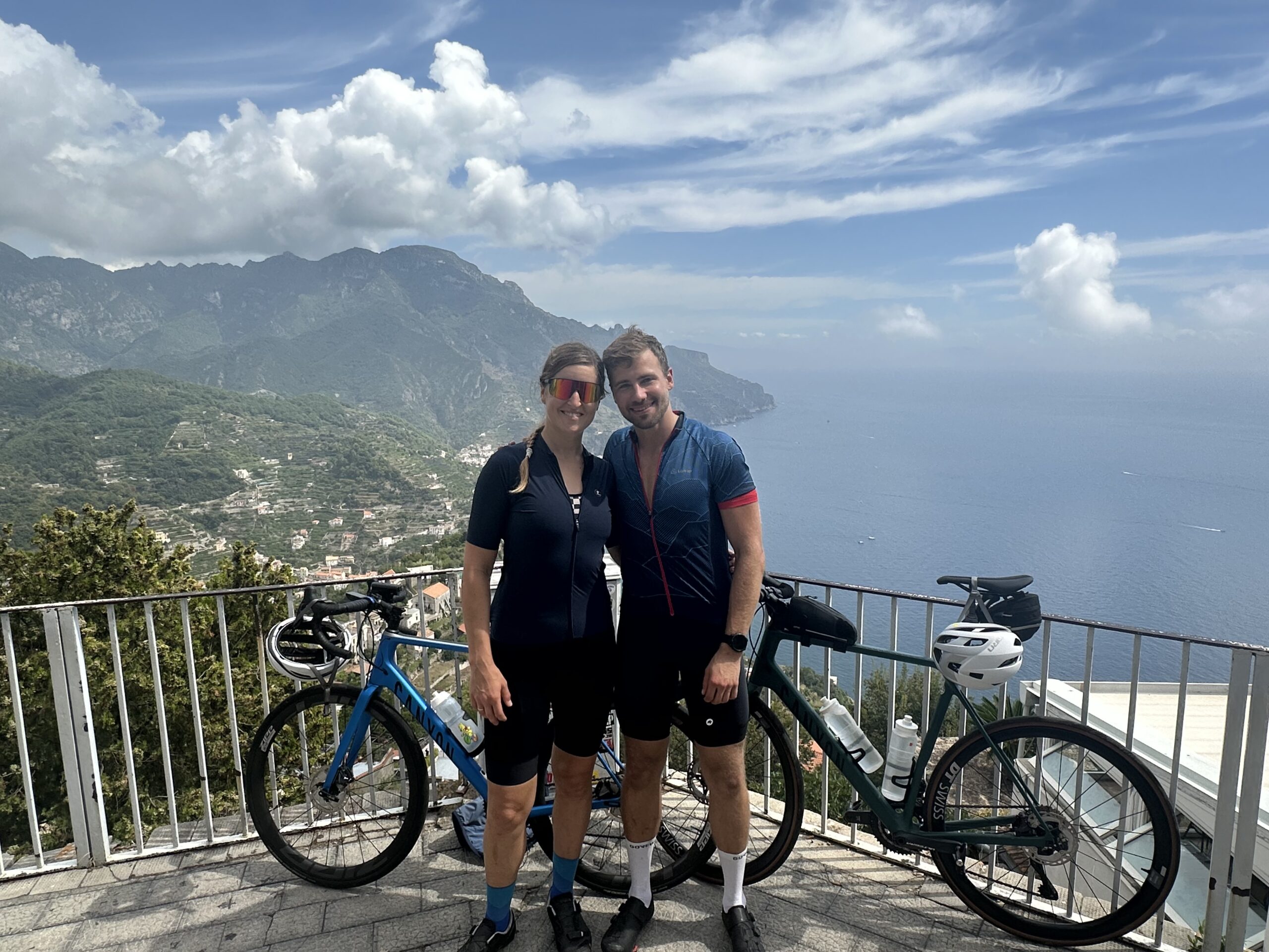 In uns regt sich aber irgendwie der Wunsch nach mehr Sport und weg von Menschenansammlungen und Hitze. Deswegen werfe ich noch eine extra Runde in den Raum nach Ravello, eine weitere kleine Stadt etwas landeinwärts und folglich 400 Höhenmeter über Amalfi. Eva ist natürlich sofort dabei und so passieren wir Amalfi, biegen links ab und pflügen in der sengenden Mittagshitze und Sonne den Asphalt aufwärts. Voll im Modus sind wir aber schon bald oben und erkunden das kleine Dorf und sein (nicht ganz so schlimm) reges Treiben in der Fußgängerzone. Wir füllen Wasser auf und waschen uns bei einem öffentlichen Brunnen die Salzkruste aus dem Gesicht und beschließen uns bei einem kleinen Familienbetrieb zwei Take-away Pizzen und Eva’s Salat zu holen, denn unsere Energiespeicher sind nach knappen 50km und fast 1000 Höhenmetern schon eher leer.