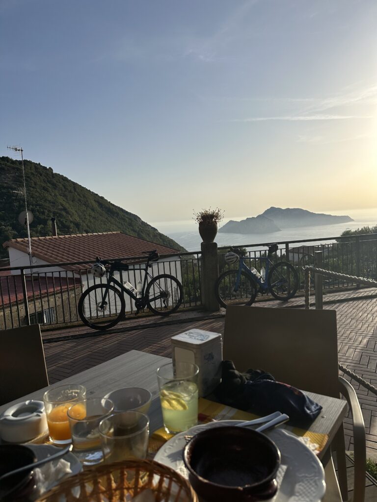 Also fahren wir weiter – genau die gleiche Route zurück – die wir gekommen sind. Die Zeit, Höhenmeter und Kilometer verfliegen, wie in Trance. Irgendwann beschließen wir, dass wir nicht die Diretissma zurück fahren wollen, sondern die Runde noch über das westliche Ende der Halbinsel ausdehnen wollen. Folglich werden es noch etwa 200 Höhenmeter mehr, doch es lohnt sich. Wir finden eine kleine Snackbar mit super Aussicht auf die Insel Capri und die bald untergehende Sonne. Wir stoppen, essen je ein Parmigiana di Melanzane und schalten erstmals etwas runter vom Gas. Als die Sonne kurz vorm Untergehen ist, vollenden wir die letzten 10km, die größtenteils bergab sind mit einer traumhaften Aussicht auf Capri, das Meer und die Sonne.