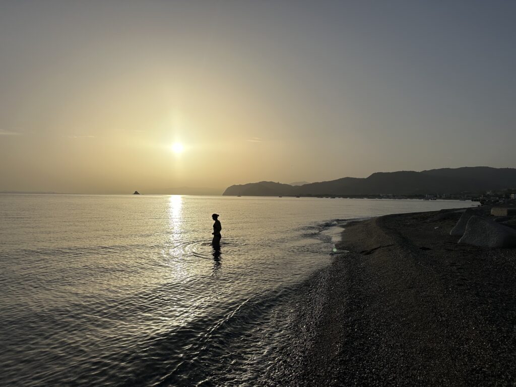 In der Nacht war es ziemlich warm. Durch die Gelsengitter bewegt sich leider die Luft kaum. Aber, wir haben ja neben unserem „Sosta Camper“ (Stellplatz) direkt das Meer, also gehen wir kurz nach Sonnenaufgang schon ins Meer und erfrischen uns. Der Strand ist wunderschön mit relativ kleinen, runden, vorwiegend dunklen Steinen und das Wasser ist absolut klar und glatt. Zusätzlich sind wir vorerst die einzigen Menschen – traumhaft.