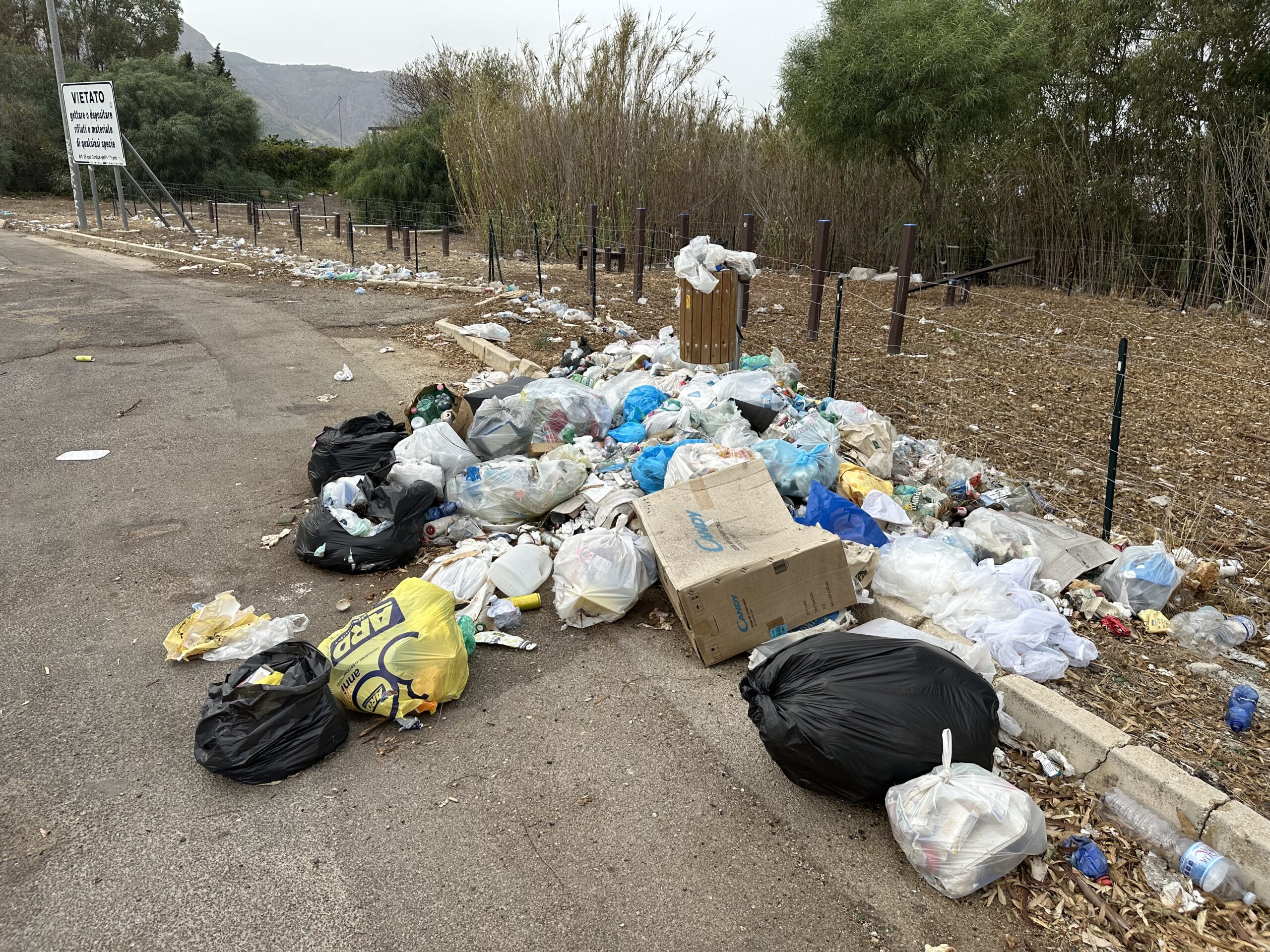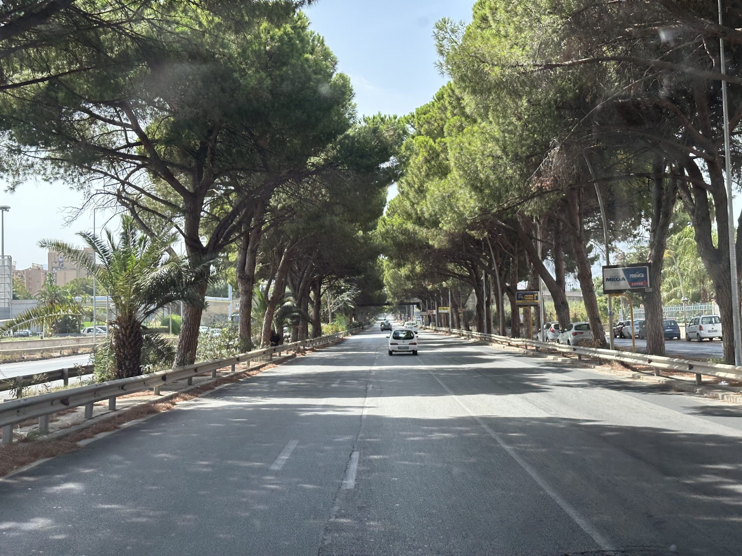 Nach dem Morgenplantscher frühstücken wir unter unserer Markise, Temperatur und Sonne steigen schon wieder ziemlich schnell. Im Anschluss nutze ich noch etwa eine Stunde das Wifi und schließe ein paar Firmenarbeiten ab. Am Ende bin ich dann schon wieder schweißüberströmt – nicht von der harten Arbeit – sondern von der Hitze. Wir haben aber sowieso noch bisschen einen Weg vor uns, also packen wir zusammen und fahren noch zum Deco Maxistore. Das ist ein recht ansehlicher Supermarkt und wir kommen voll auf unsere Kosten und stocken alle Vorräte für 80€ wieder auf. Hier merkt man erst so richtig, wie teuer Österreich derzeit im Vergleich ist. Am Parkplatz schmelzen wir beim Einräumen in den Camper komplett dahin und meinen schnellen Snack aus Brot, Oliven und Räucherkäse esse ich lieber während der Fahrt, bei laufender Klimaanlage. Wir fahren wieder auf die Autobahn auf und überfahren unzählige Brücken und ebenso unzählbare Tunnel. Ein Großteil der zweispurigen Autobahn ist lediglich einspurig und immer wieder sind Brücken und Tunnel gesperrt und die beiden Richtungsfahrbahnen werden kombiniert über eine bzw. durch einen geführt. Vermutlich keine aktive Baustelle, sondern eher eine (gezwungene) Einsparungsmaßname. Man quert dennoch sehr viele Täler, die Landschaft ist sehr karg, aber durchaus schön. An der Nordküste Siziliens ist es nicht sehr dicht bewohnt und die einzelnen Häuser wirken nicht ganz so extrem heruntergekommen, wie in Messina, am Anfang unserer Sizilienfahrt. Aber dennoch sehr heruntergekommen. Nach 2h Fahrt kommen wir dann nach Palermo. Dieses durchfahren wir auf einer durchgängigen Straße mit 70er Beschränkung und ansprechenden Pinienalleen. Hier macht es auch wirklich Sinn, denn ich glaube ohne Schatten würden sogar die Autos schon schmelzen an den Ampeln. Sehr reizvoll wirkt die Stadt aber auch definitiv nicht.