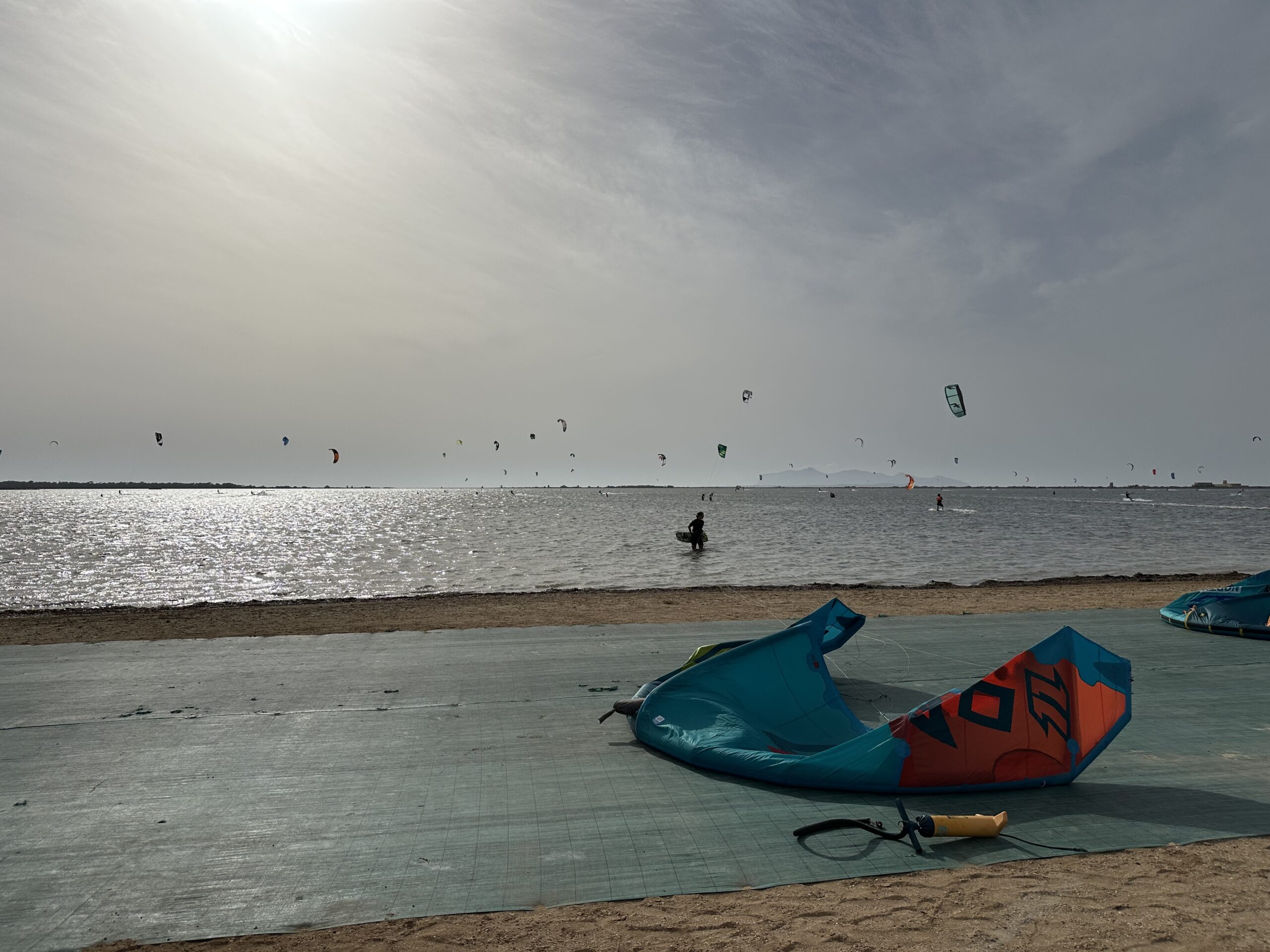 Es geht übrigens ein ordentlicher Wind und so ist die Temperatur auch erstmalig wirklich erträglich. Nachdem es 16:00 ist und wir bis zum Sonnenuntergang noch 3,5h Zeit haben beschließen wir auch für heute bereits zu zahlen und noch auf’s Wasser zu starten. Eva baut den 9er Schirm auf, kommt aber bald wieder herein und wechselt auf den 11er, da der Wind doch nicht so stark wie erwartet ist. Ich beobachte ein paar andere und entschließe mich dann aber auch mit dem 9er zu starten. Der Kitespot ist eine Lagune, dh. man kann fast überall stehen und es sind durch den geschützten Bereich eigentlich keine Wellen. Der Wind ist ziemlich perfekt und es ist ein herrlich erfrischendes Gefühl wieder auf dem Brett zu stehen und die Elemente zu spüren. Wir fahren beide jeweils ca. eine Stunde. In dieser komme ich auf 20 zurückgelegte Kilometer mit einer Maximalgeschwindigkeit von 50 km/h. Als dann die Sonne untergegangen ist, gönnen wir uns eine 1€ Dusche und 2 Corona und zelebrieren das Ankommen im Urlaub.