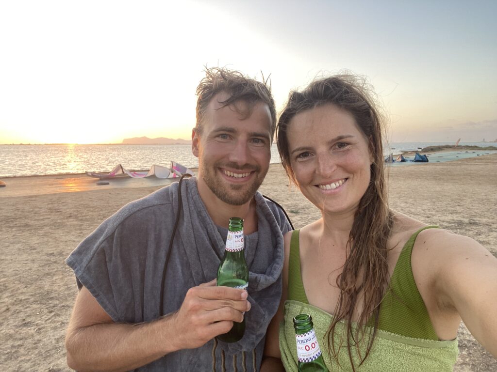 In der Mittagspause beschlossen wir Einkaufen zu fahren. Zehn Minuten entfernt haben wir auf Google Maps einen Shop gefunden, den wir ansteuern. Dort stocken wir unsere Lebensmittelvorräte auf und kaufen auch 3x 6er Tragerln 2L Wasserflaschen. Unseren Müll können wir leider nicht entsorgen, denn die Müllkübel am Weg sind entweder heillos überfüllt, oder abgesperrt (!). Am Weg zurück stelle ich fest, dass das Geräusch unseres Lüfters im Motor immer schlimmer wird. Als wir wieder am Surfspot zurück sind, begutachte ich die Lage und stelle fest, dass wohl einer der beiden Lüfter nicht rund läuft und die ganze Halterung massiv hin und her schwingt und Geräusche erzeugt. Erstaunlich, denn wir waren direkt vor dem Losfahren noch beim Pickerl. Ich werde das morgen Vormittag, wenn die Windvorhersage geringer ist, mal genauer inspizieren – wohl oder übel werden wir aber vermutlich eine Werkstätte aufsuchen müssen. Ich würde gerne wieder Kiten gehen, aber irgendwie streikt mein Körper und Verdauung und so wird es stattdessen ein 20 Minuten Schlaf und danach etwas Weißbrot. Danach fühle ich mich wieder viel besser und starte die Nachmittagssessions. Eva und ich wechseln uns ab, bis kurz vor Sonnenuntergang, wo der Wind dann zu schwach wird. Die tägliche 1€ Dusche – heute sogar mal wieder mit Shampoo und zwei alkoholfreie Bier im Sonnenuntergang runden das Ganze ab. An der Camperfront haben wir auch Zuwachs bekommen, ein neues, deutsches Pärchen parkt nun auch neben uns.