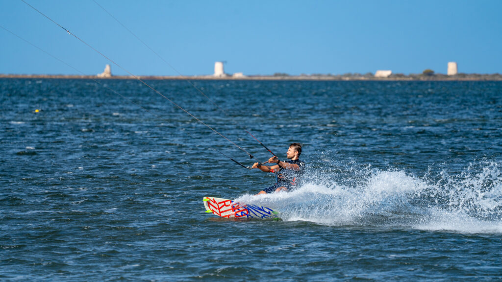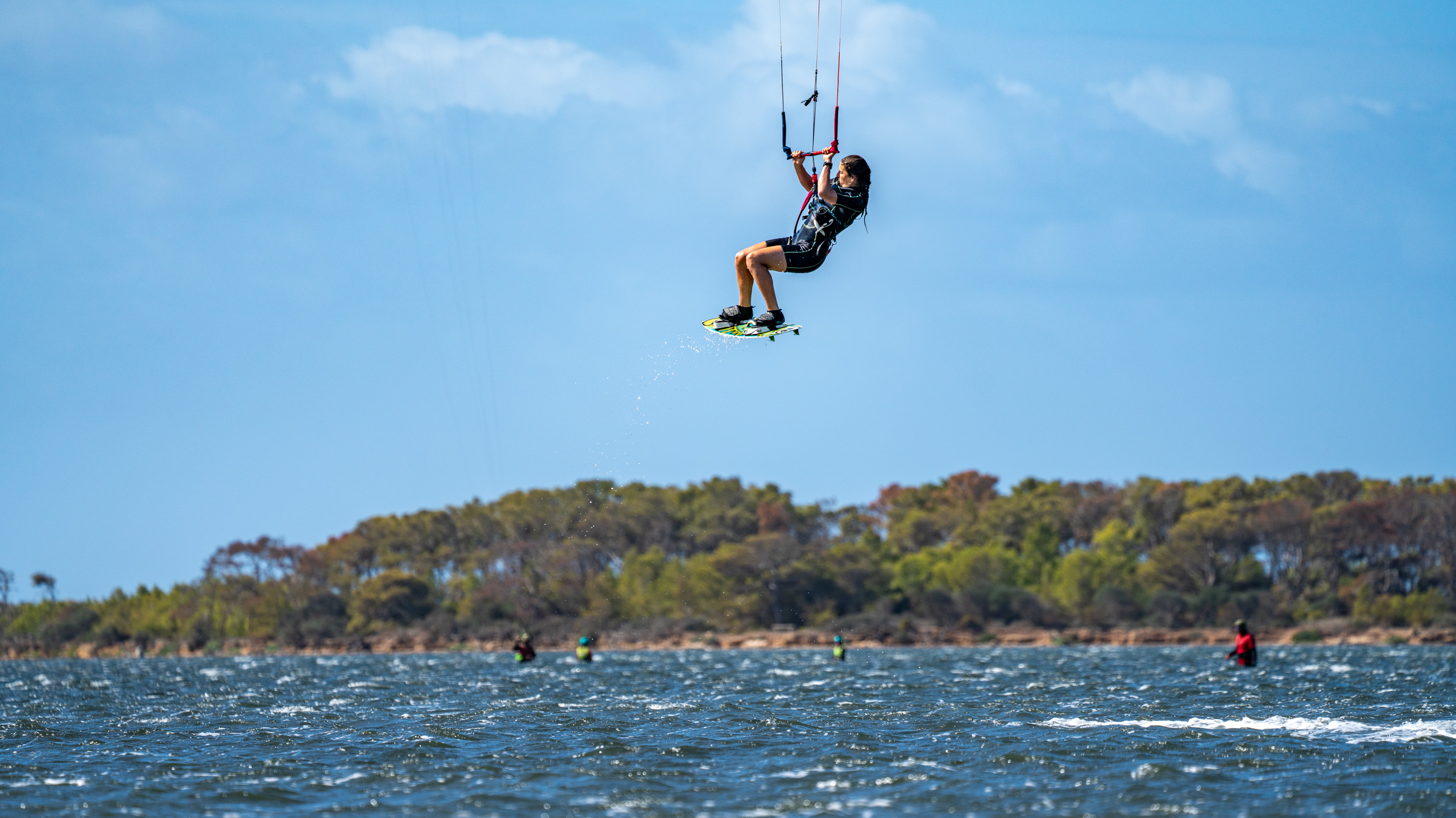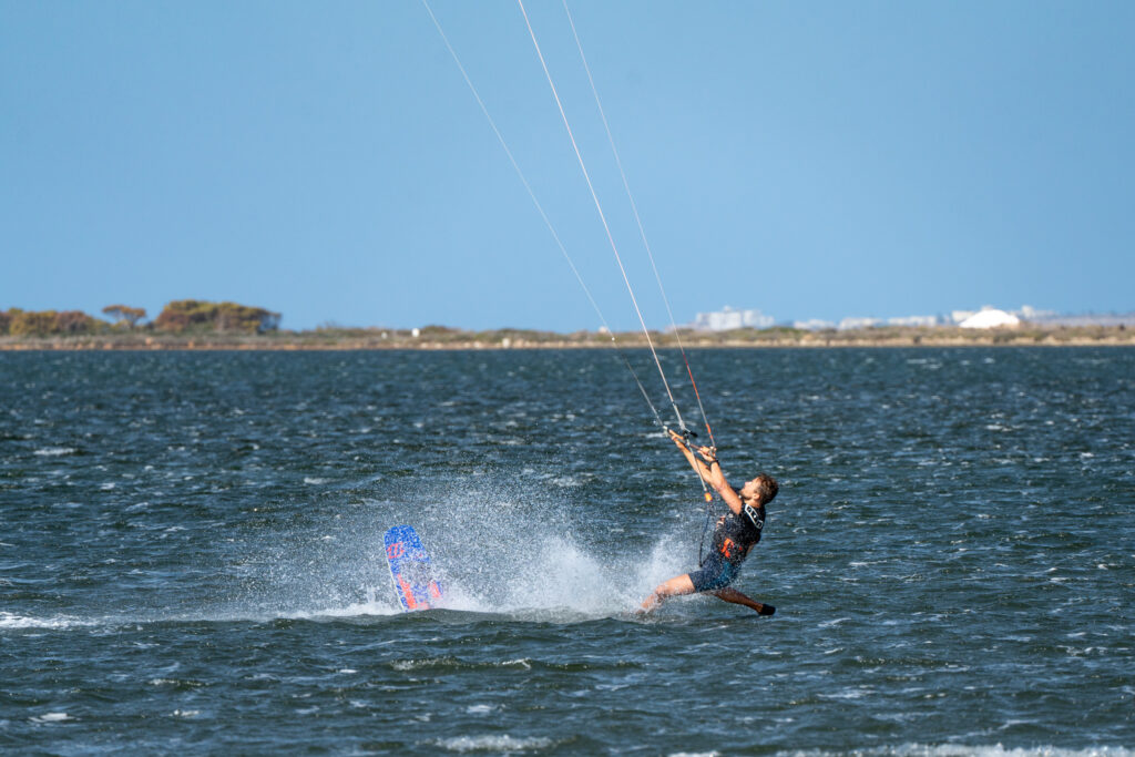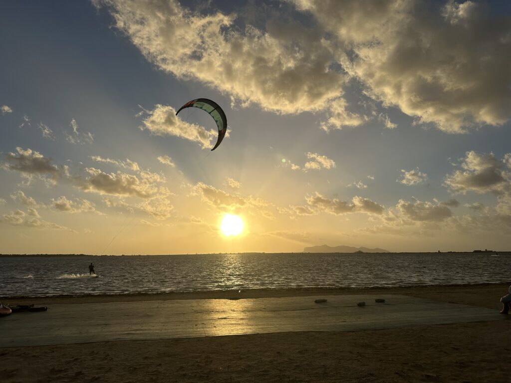 Eva absolviert beim noch stärker werdenden Wind eine ausgedehnte Nachmittagssession. Als ich dann an der Reihe wäre ist der 9er Schirm aber fast schon zu groß, da ordentliche Sturmböen wehen. Der Wind ist so stark, dass er allerdings auch schon etwas störend wird auf Dauer. So ist es immer ohrenbetäubend laut und man kühlt ziemlich aus. Beim Warten am Strand vergeht es einem schon fast noch auf’s Wasser zu gehen. Sophie borgt mir dankenswerterweise ihren 7er Schirm für meine Abendsession, und so komme ich auch noch in den Geschmack eines kleinen, wendigen Kites. Dadurch verpasse ich die Schließung der Strandbar und somit auch meine Chance auf eine Süßwasserdusche.