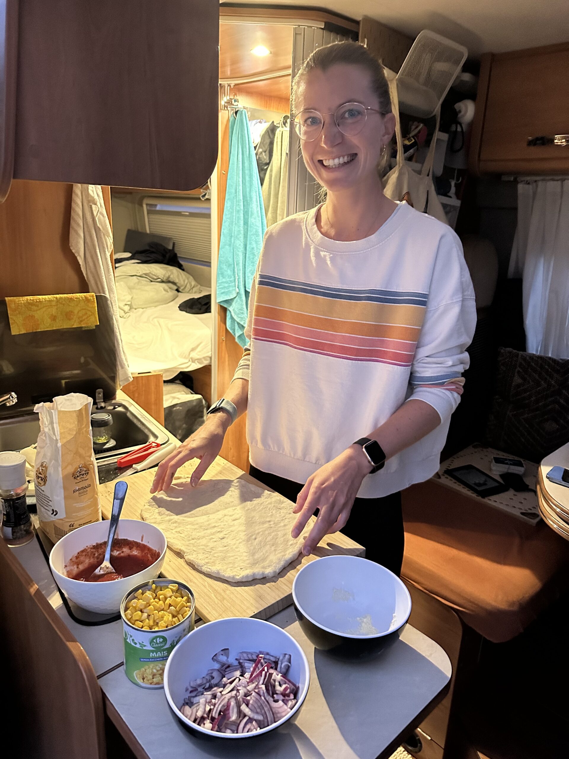 Ich hole das aber mit einer Trinkflasche und 800ml Wasser dann beim Camper nach. Abends werden wir von Roman und Sophie bekocht mit äußerst leckeren Pizzen. Draußen gemütlich zusammensitzen ist bei dem Sturm aber nicht wirklich möglich und so ziehen wir uns gegen 21:00 schon zurück in die Busse und erholen uns von dem starken Wind.