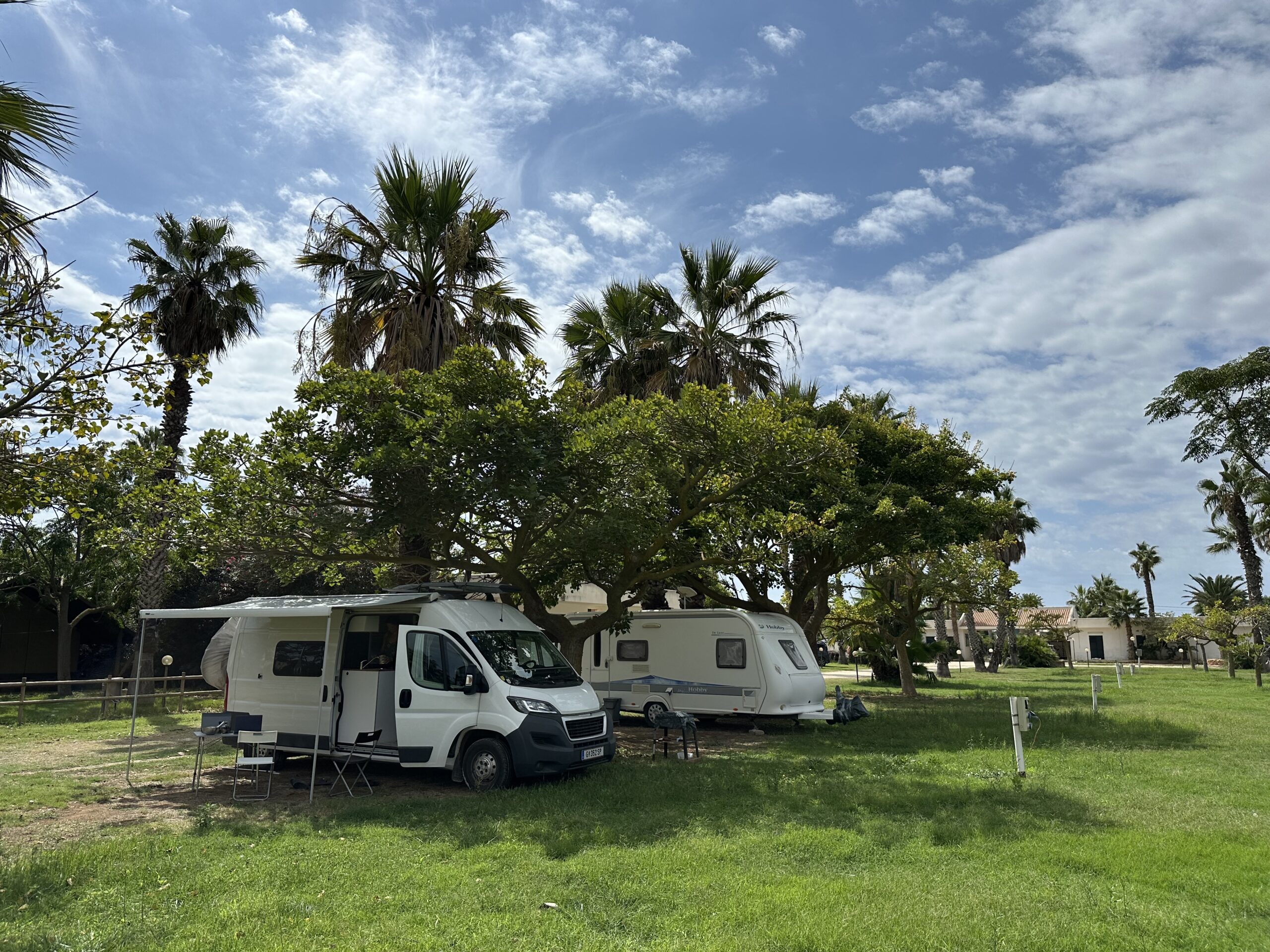 Am Empfang der Werkstätte sitzt ein sehr freundlicher Mann, der jedoch, wie wir schon befürchtet haben, kein Wort Englisch oder Deutsch spricht. Mit Google Translate und Eva’s Sprachtalent können wir uns irgendwie verständigen. Zuerst verweist er uns an eine andere Werkstätte in Trapani, etwa 1h entfernt. Als ich ihm klar mache, dass das Auto nicht mehr wirklich vorwärts kommt, meint er, dass es doch möglich ist heute nach 17:00 eine Diagnose zu stellen. Also suchen wir uns den naheliegendsten Campingplatz (6km entfernt), denn wir haben nun 5 Stunden zu überbrücken. Dort angekommen sind wir vom Gelände eigentlich positiv überrascht. Es hat zwar auch schon bessere Zeiten gesehen, vor allem die Sanitärräume sind sehr heruntergekommen, doch die Anlage bietet Wiese, Bäume mit natürlichem Schatten und ist äußerst ruhig und abgelegen. Wären die Umstände etwas anders, könnte hier vielleicht sogar tatsächlich Urlaubsfeeling aufkommen. Wir machen trotzdem das Beste draus und genießen die perfekt angenehmen Temperaturen im Schatten. Wir nutzen auch die Chance und waschen unsere Wäsche für 3,5€ in der Waschmaschine nebenan.