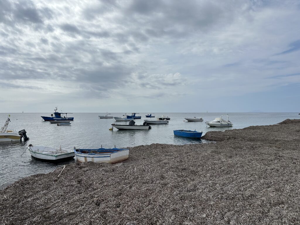 Nach dem Essen spazieren wir vor zum Meer, welches einen Häuserblock entfernt ist. Begleitet werden wir von zwei der unzähligen Hunde, die beim Campingplatzeingang herumlungern. Am Strand angekommen sind wir leider etwas enttäuscht von der Kulisse, da Unmengen an totem, trockenen Seegras jeglichen Sandstrand verdecken. Wir spazieren ein wenig entlang und finden tatsächlich ein freies Sandplatzerl, wo wir uns für eine gute Stunde niederlassen und das glatte Meer genießen.