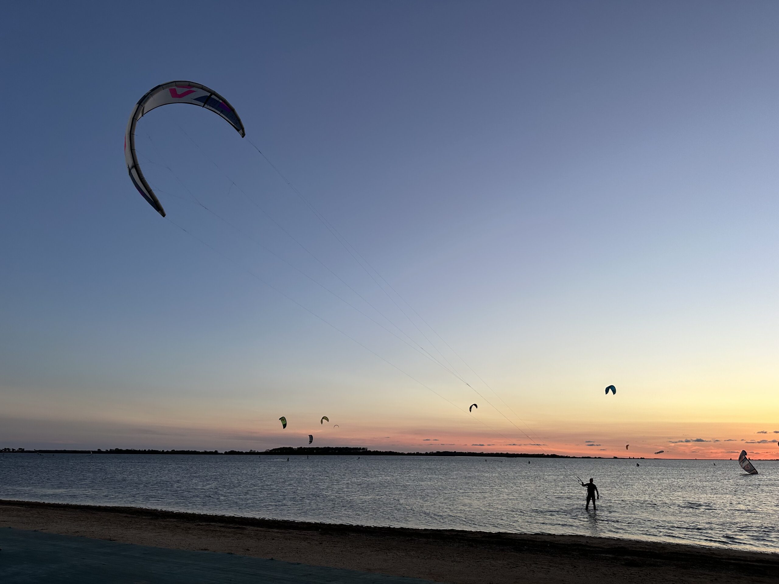 Wir tümpeln mehrere Stunden im hüfttiefen Wasser umher und versuchen abwechselnd immer wieder ins Fahren zu kommen. Doch es ist wirklich extrem schwer und das Brett schießt entweder durch den Auftrieb der Tragflächen komplett aus dem Wasser und man stürzt, oder es ersäuft und wird auf den Boden gedrückt. In jedem Fall machen wir genug Abgänge im mehr oder weniger hohen Bogen. Ich bin von der Lernkurve schon eher frustriert, ich hätte mir einen Boardsport mit meiner Vorerfahrung eigentlich nicht so schwer vorgestellt. Doch hartnäckig probieren wir weiter und nehmen ein paar Blessuren auf den Schienbeinen in Kauf, bis es dann wirklich so weit hinhaut, dass ich schwerelos über das Wasser gleite. Ich schaffe es allerdings nur nach links, Eva hingegen nur nach rechts. Es hat auf jeden Fall gut getan doch noch einen Fortschritt zu machen und wir sind schon gespannt auf die nächsten Sessions, eventuell auch im tieferen Wasser, bei Flut. Im Anschluss spazieren wir zurück an Land und ich starte noch eine Sonnenuntergangssession mit dem normalen Brett und 15er Schirm. Zwar ist der Wind nicht stark genug um großartige Sprünge zu absolvieren, doch im Sonnenuntergang die Seele über’s Wasser baumeln zu lassen, tut auch gut.