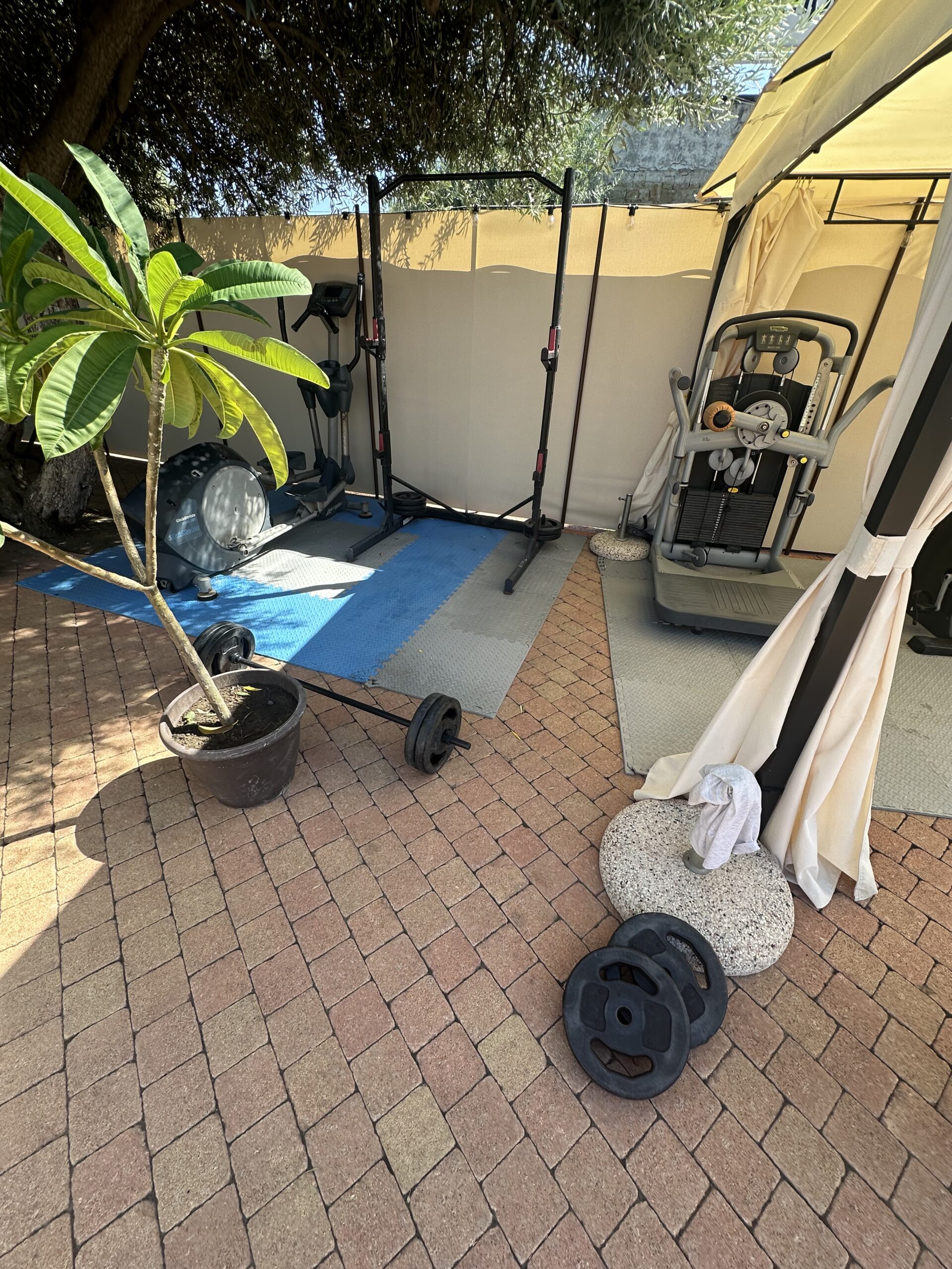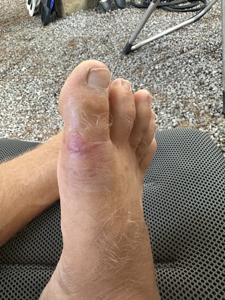 Mein Fuß ist nochmal besser und weitgehend abgeschwollen, doch die Infizierte stelle ist immer noch etwas rot und wirft eine kleine Blase. So traue ich mich noch nicht in einen Schuh und mit auf die Radtour, die die anderen gemeinsam machen. Stattdessen nutze ich das gute Internet am Campingplatz für ein wenig Recherche und Shopping und mache im Anschluss ein Oberkörper-Krafttraining im spartanischen Outdoor „Gym“ des Campingplatzes.